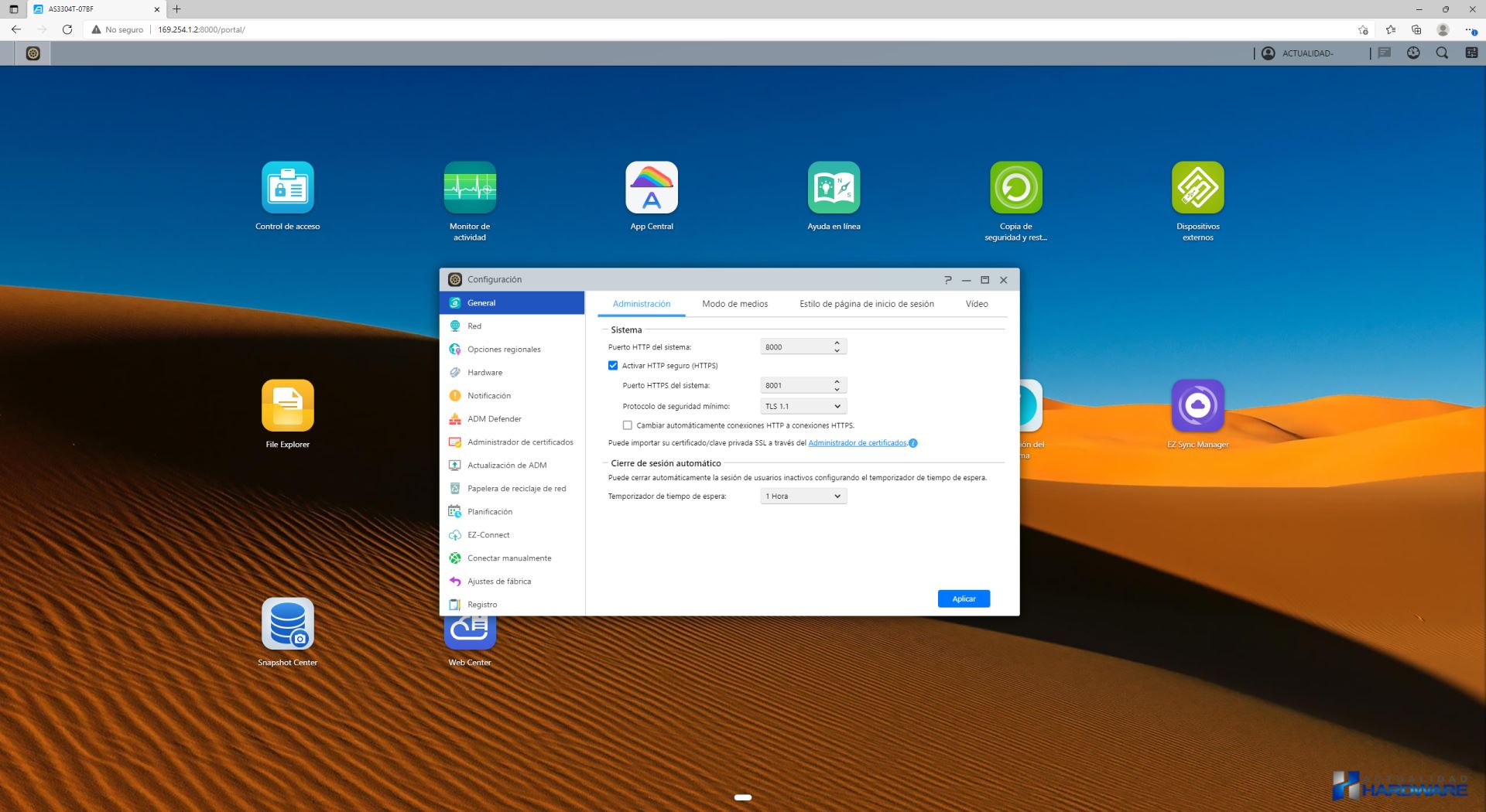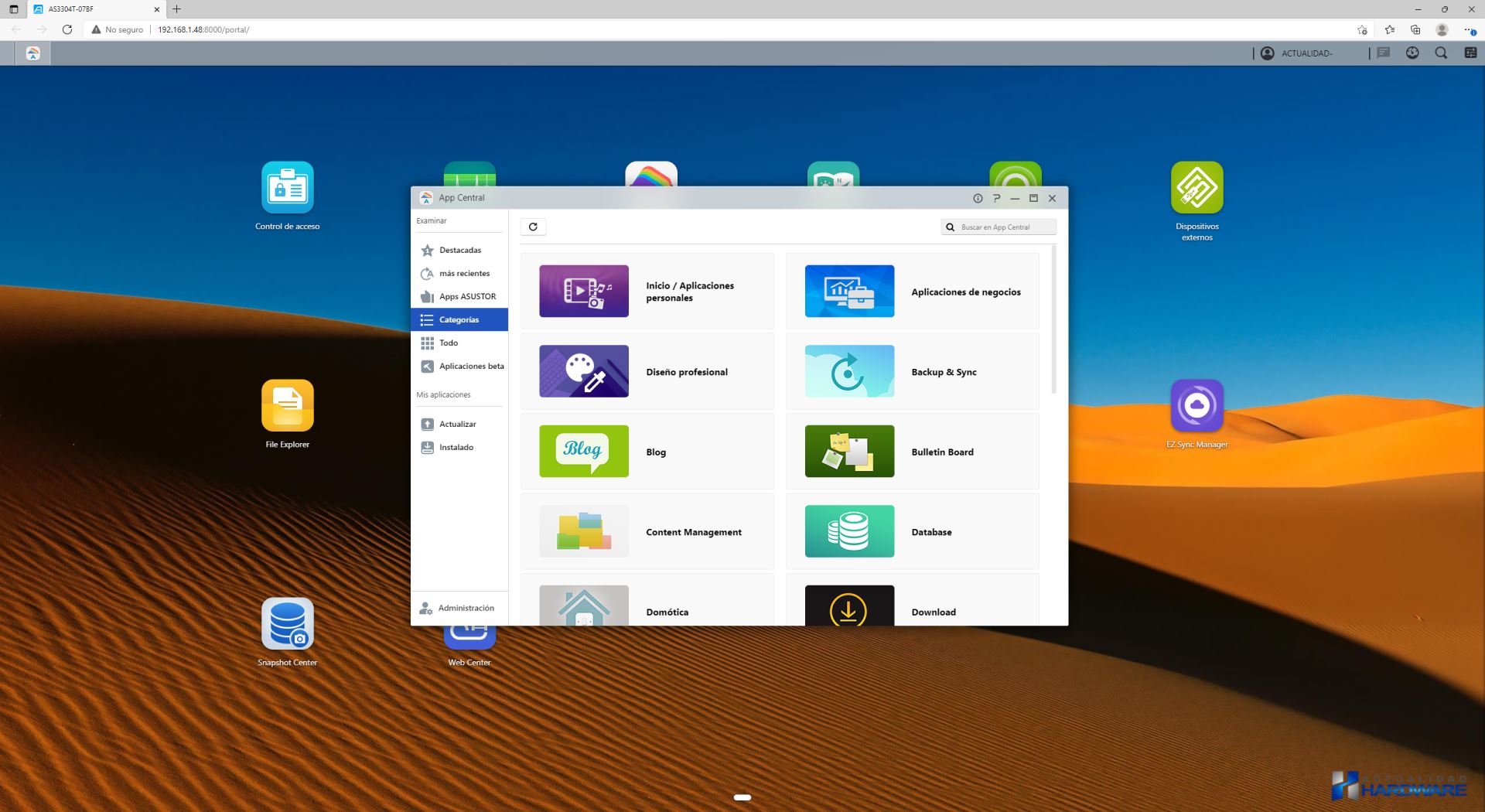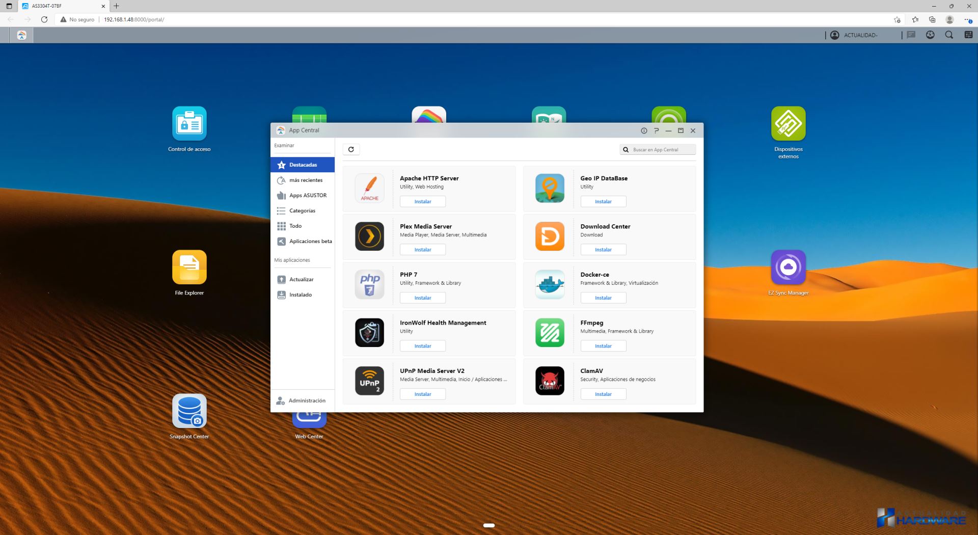 | Una vez terminada la configuración inicial del ASUSTOR DRIVESTOR 4 PRO AS3304T hemos procedido a configurarlo mediante nuestro PC, todo ello a través del navegador Chrome y en perfecto castellano. Como indicamos anteriormente contamos con la última versión de ADM disponible a día de hoy, imprescindible para beneficiarnos de mejoras de software así como de posible fallos de seguridad detectados por el fabricante. Como ya os hemos comentado en reviews anteriores, ADM es potente e intuitivo software a la hora de configurarlo y utilizarlo. Cuenta con un gran abanico de opciones de configuración que junto con la cantidad de aplicaciones disponibles hacen que el mismo sea ciertamente potente a la vez que fluido como hemos tenido la oportunidad de probar de primera mano. | ||||||||