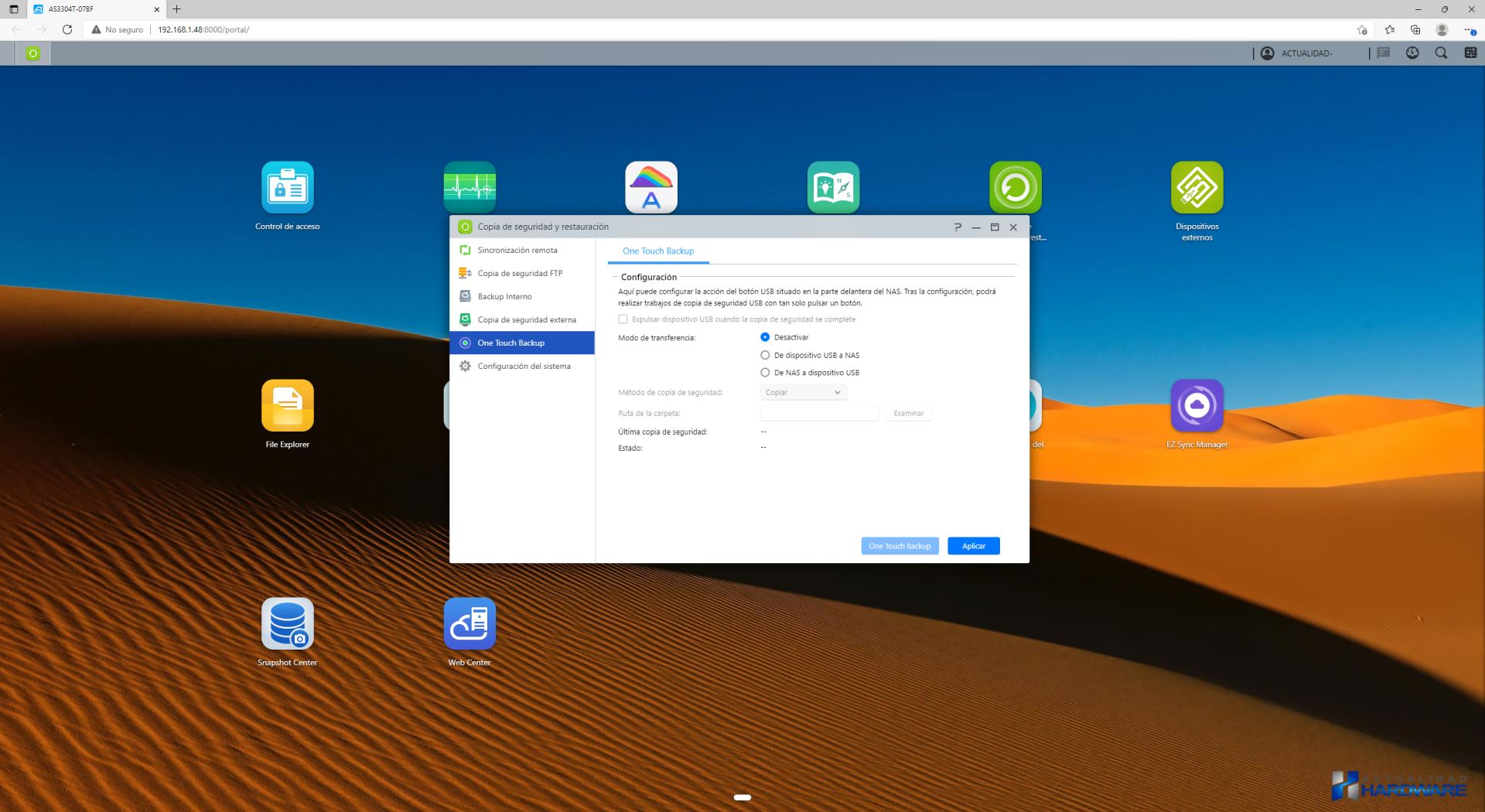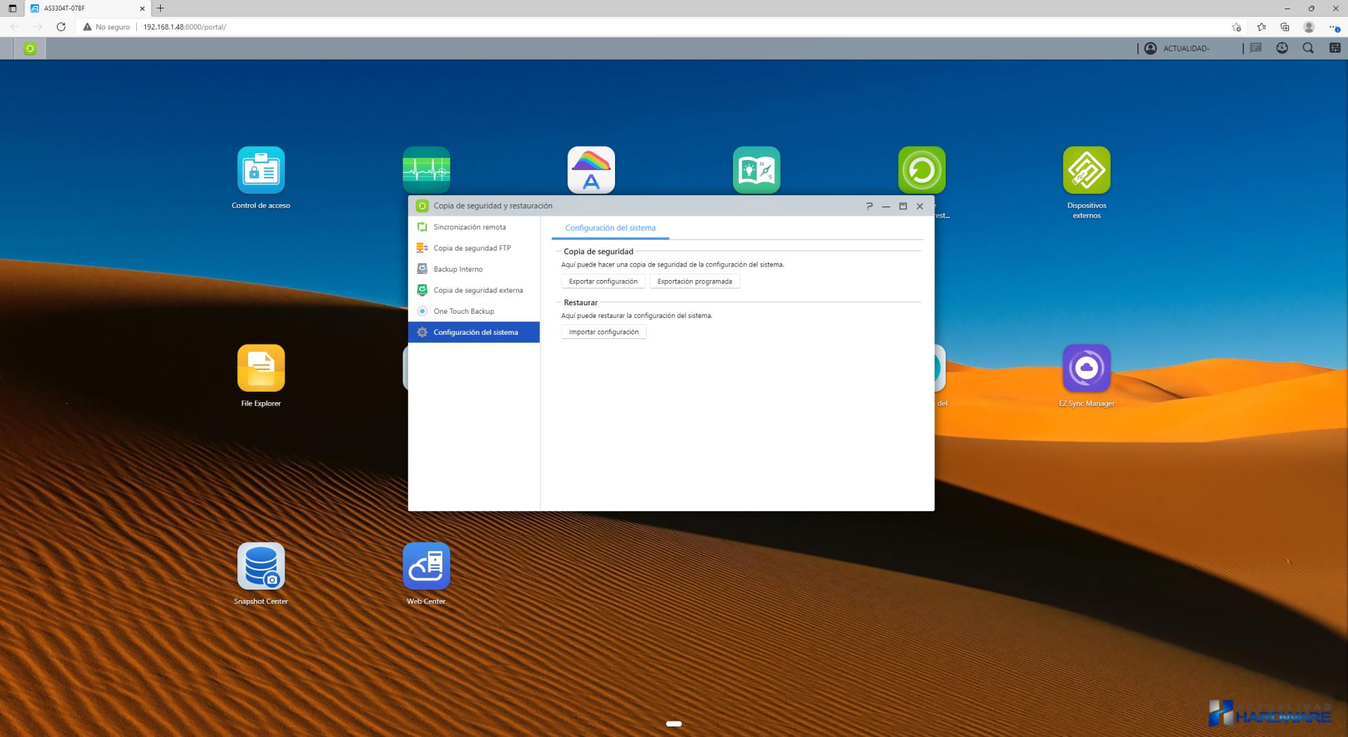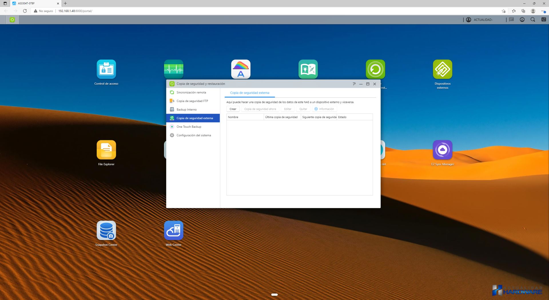 | Una vez terminada la configuración inicial del ASUSTOR DRIVESTOR 4 PRO AS3304T hemos procedido a configurarlo mediante nuestro PC, todo ello a través del navegador Chrome y en perfecto castellano. Como indicamos anteriormente contamos con la última versión de ADM disponible a día de hoy, imprescindible para beneficiarnos de mejoras de software así como de posible fallos de seguridad detectados por el fabricante. Como ya os hemos comentado en reviews anteriores, ADM es potente e intuitivo software a la hora de configurarlo y utilizarlo. Cuenta con un gran abanico de opciones de configuración que junto con la cantidad de aplicaciones disponibles hacen que el mismo sea ciertamente potente a la vez que fluido como hemos tenido la oportunidad de probar de primera mano. | ||||||||