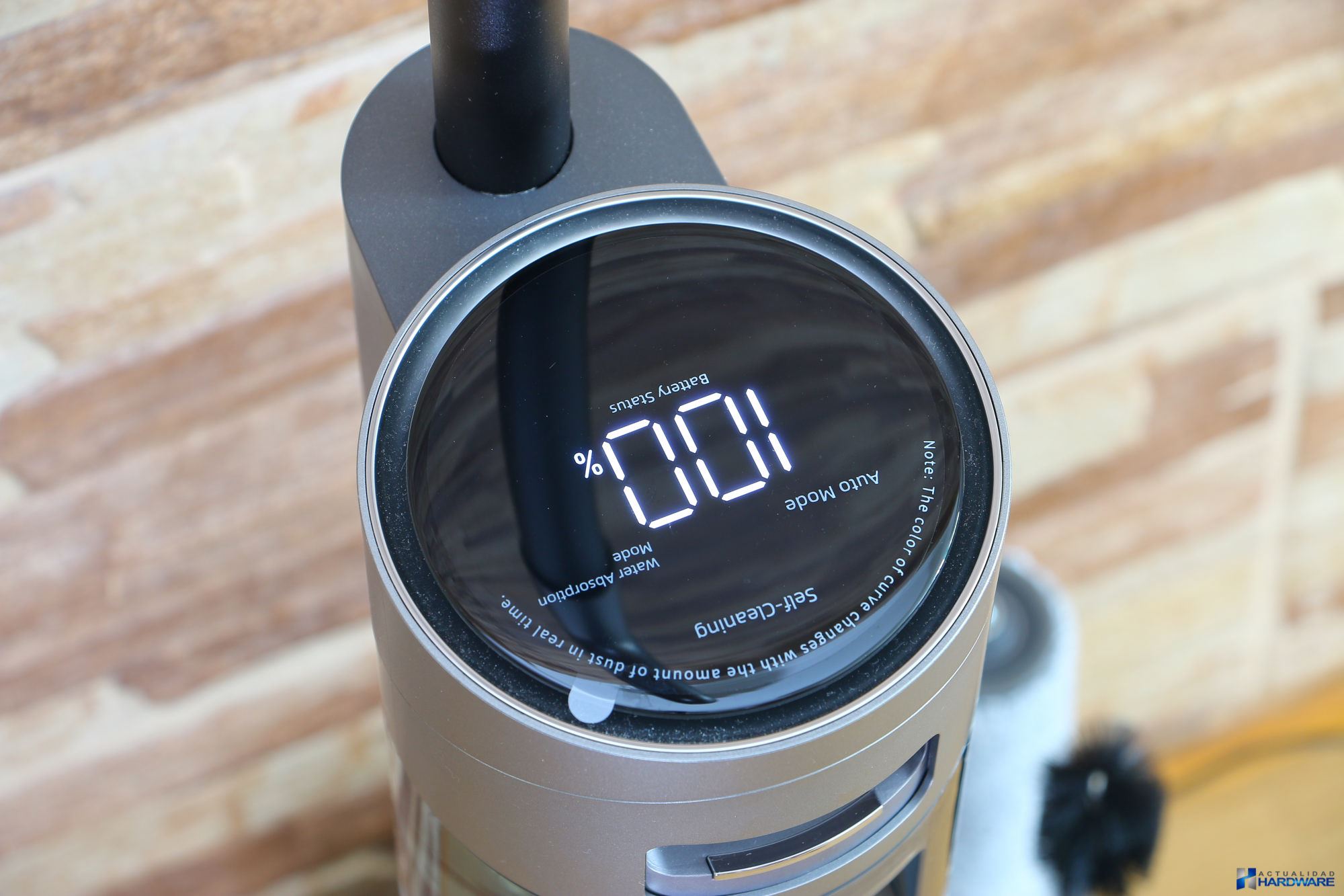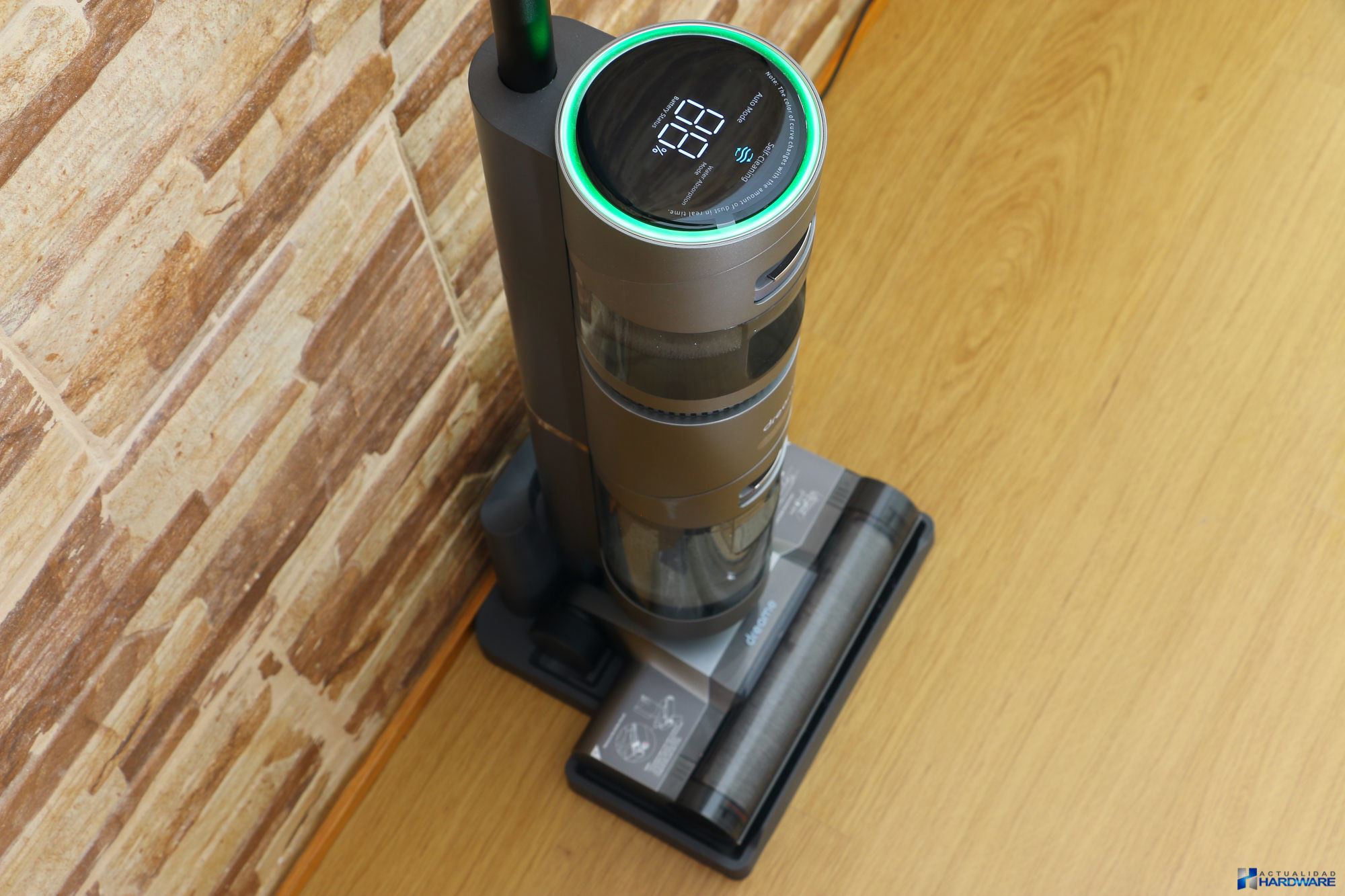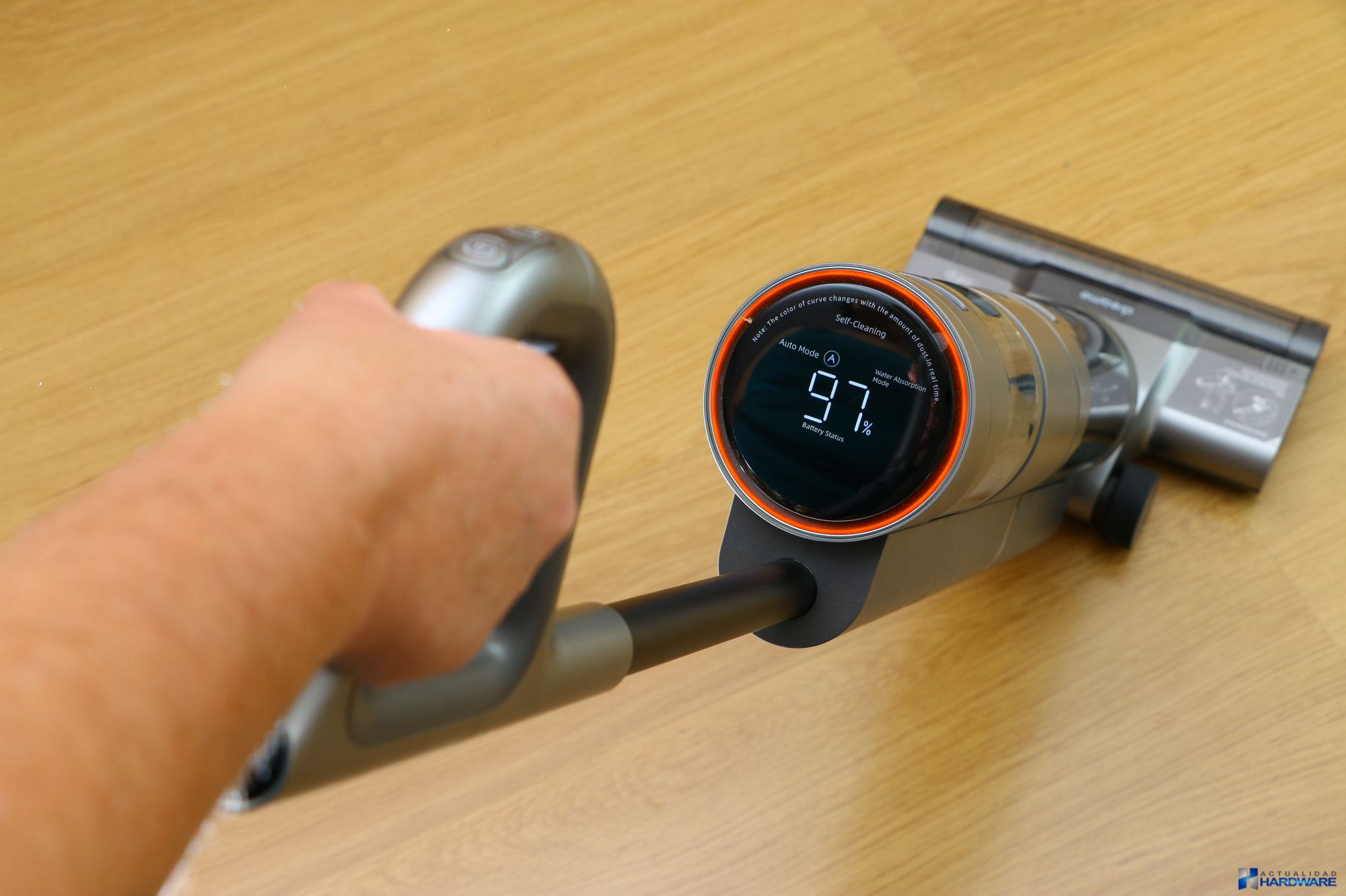 | La potencia de succión que nos ha brindado su potente motor ha sido muy buena permitiendo aspirar desde pequeños restos de polvo y comida -grano y cereales de diferentes tamaños- hasta líquidos derramados, todo ello de una manera fácil y cómoda. Lo hemos utilizado en diferentes situaciones como han sido aspirado y limpieza de suelo tanto en tarima flotante como en porcelánico, obteniendo un gran resultado. La pantalla HD a color que incluye nos ha gustado tanto en calidad de imagen como en la información que nos muestra, como es el porcentaje de batería restante, modos de limpieza o nivel de suciedad detectado, entre otros. Cuenta con tres botones en su mango como son: botón de encendido/apagado, botón de absorción de agua y botón de autolimpieza. Comentar que gracias a empuje producido al girar el rodillo, la aspiradora camina sola hacia delante, facilitando de este modo la utilización de la misma sin esfuerzo. El fabricante recomienda utilizar solamente líquido de limpieza de su marca pero nosotros para testearla hemos utilizado limpia suelos pero eso si unas pequeñas gotas ya que si abusamos en exceso podrían llegar a obstruirse los conductos, más que suficiente teniendo en cuenta el tamaño del depósito de agua que incorpora. El nivel de agua que proporciona es perfecto ya que únicamente vierte una pequeña película de agua suficiente para limpiar el suelo, no dejándolo por tanto empapado, cuestión importante si tenemos en casa tarima flotante. | ||||||||