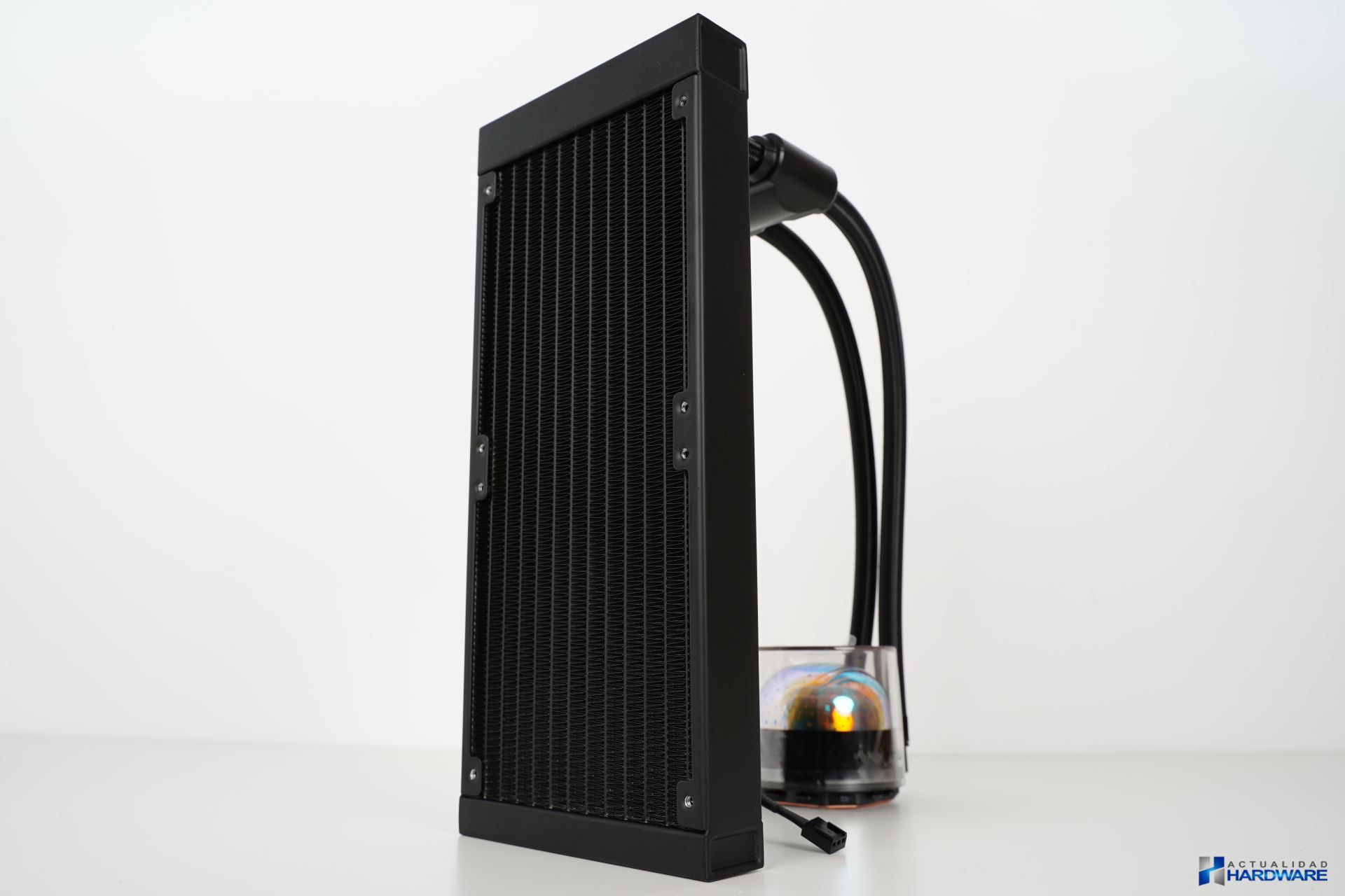 El NR24 NEBULA de INWIN es un sistema de refrigeración líquida o watercooling AIO, esto quiere decir que nada más sacado de su embalaje podemos realizar directamente la instalación en nuestro PC. Es un kit que consta de un radiador de 240mm con unas dimensiones 277 x 120 x 27 mm sobre el que se podemos instalar dos ventiladores de 120mm, concretamente los LUNA SERIES AL120 ARGB. El radiador se encuentra fabricado en aluminio con un recubrimiento de pintura negra y una gran densidad de aletas que le proporcionan una optima refrigeración. La calidad de construcción, los materiales utilizados así como su ensamblaje, lo consideramos buenos.