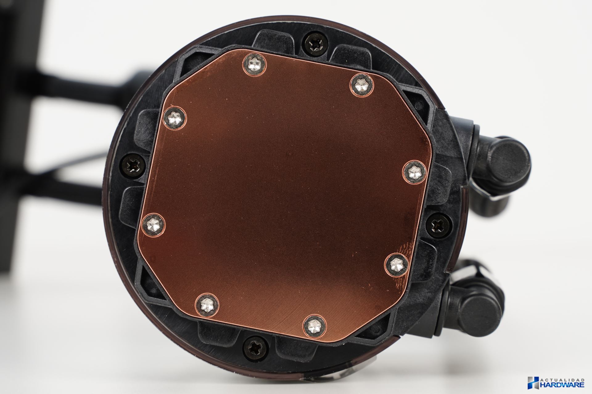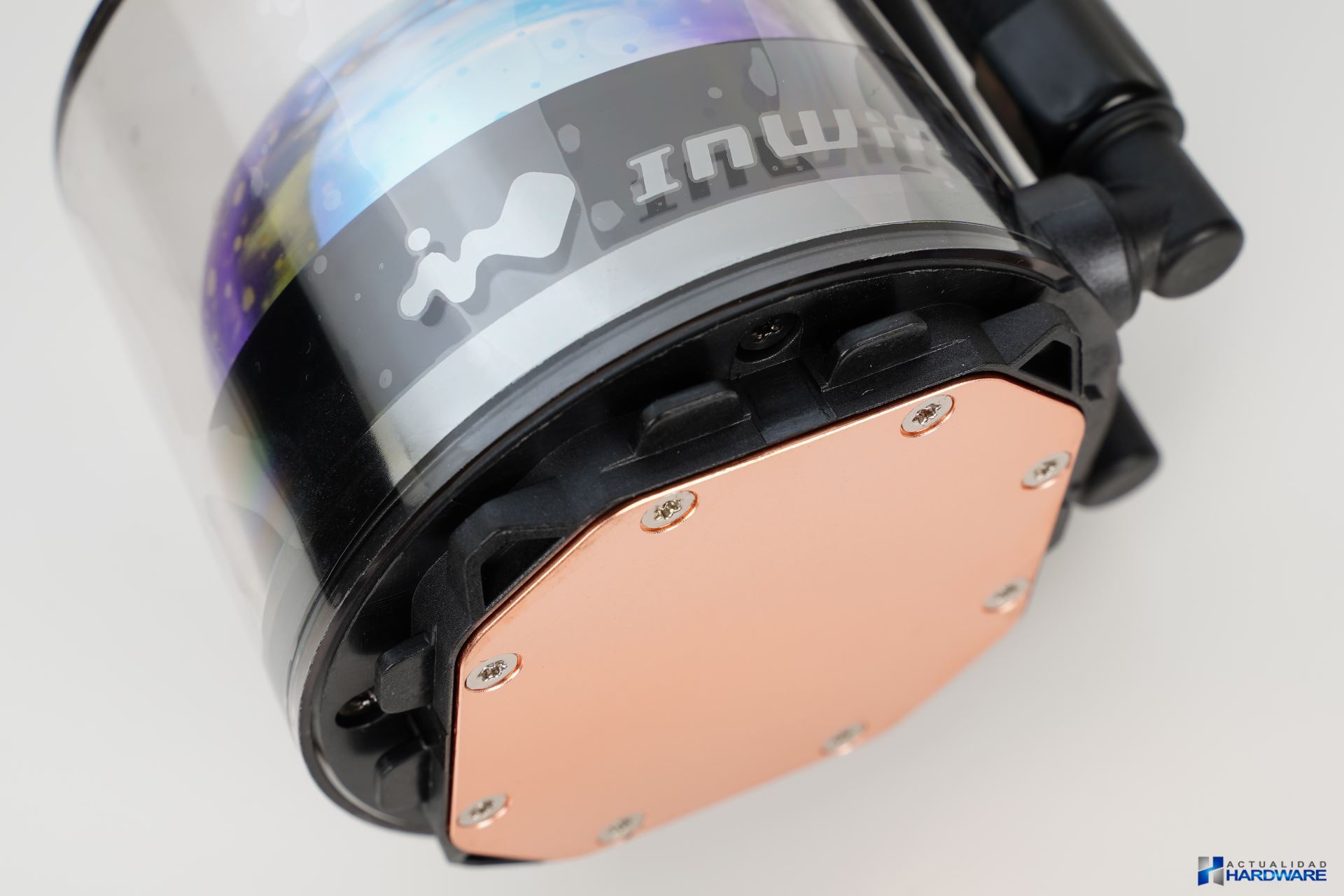 El INWIN NR24 NEBULAes compatible con los sockets de Intel LGA 1700/1200/2066/2011-V3/2011/1366/1156/1155/1151/1150 así como con los de AMDAM5/AM4/AM3+/AM3/AM2+/AM2/FM2+/FM2/FM1/TR4, por lo que su compatibilidad está garantizada. Los tubos son de caucho con revestimiento de nailon trenzado, con una lontigud de 400mm.Dichos tubos se conectan al radiador y a la bomba mediante racores no desmontables y fijos, mientras que los del bloque tienen algo de giro para que podamos realizar la instalación con más facilidad. La bomba a diferencia que otros AIO del mercado, no se encuentra en el propio bloque sino que lo hace cerca del radiador y fuera de éste, reduciendo de este modo la posibilidad de creación de burbujas debido a la posición de la misma, siendo a priori más eficiente en este sentido. La bomba cuenta con unas dimensiones de 66 x 50 x 31 mm y una velocidad de giro de 5.200 RPM, en sus especificaciones no se cita ni el caudal que es capaz de mover, ni la sonoridad de la misma ni tampoco su vida útil, veremos que tal se comporta en los tests. La misma cuenta con un cable recubierto de nilon trenzado y un conector de 3 pines con una longitud de 45cm. La base del bloque se encuentra fabricada en cobre cuya superficie se presenta perfectamente pulida, todo ello para mejorar el contacto con el procesador. El aspecto del bloque es bastante llamativo ya que se compone de una capsula transparente contando en su interior con iluminacion ARGB con un diseño que los chicos de INWIN denominan NEBULA. Para dotarle de iluminación incluye un conector ARGB de 3 pines que podremos conectar directamente a nuestra placa base o bien al controlador que se incluye.