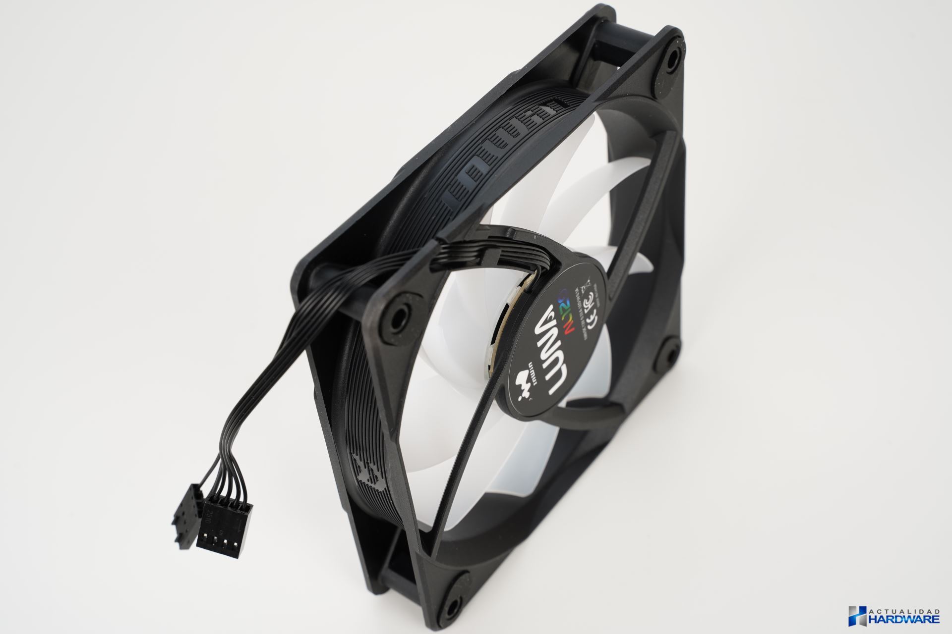 Los dosventiladores incluidos en este kit son los LUNA SERIES AL120 de 120mm que cuentan con iluminación ARGB y unas dimensiones de 120 x 120 x 25 mm. Son de tipo PWM por lo que su velocidad de giro se ajustará automáticamente según la carga de trabajo, concretamente desde las 400 hasta las 1800 RPM, aproximadamente, todo ello con un nivel de sonoridad normal de 25dBA, una presión de aireestática de 2,31 mm/H20 y un flujo de aire de 82,96CFM. Sus rodamientos son de tipo casquillo con una larga vida útil. Cuentan con dos cables por hilos de escasa longitud, uno de 4 pines PWM y otro 3 pines para su iluminación con conexión especial que conectaremos a alargador de cables ARGB. Los ventiladores LUNA SERIES AL120 cuentan con esquinas gomosas para evitar posibles vibraciones todo ello con un buen diseño de 9 nueve aspas de color blanco translúcido encuentrándose fabricados en plástico. La iluminación se encuentra situada en el rotorproyectándose hacia las aspas e iluminandolas tal y como veremos más adelante.