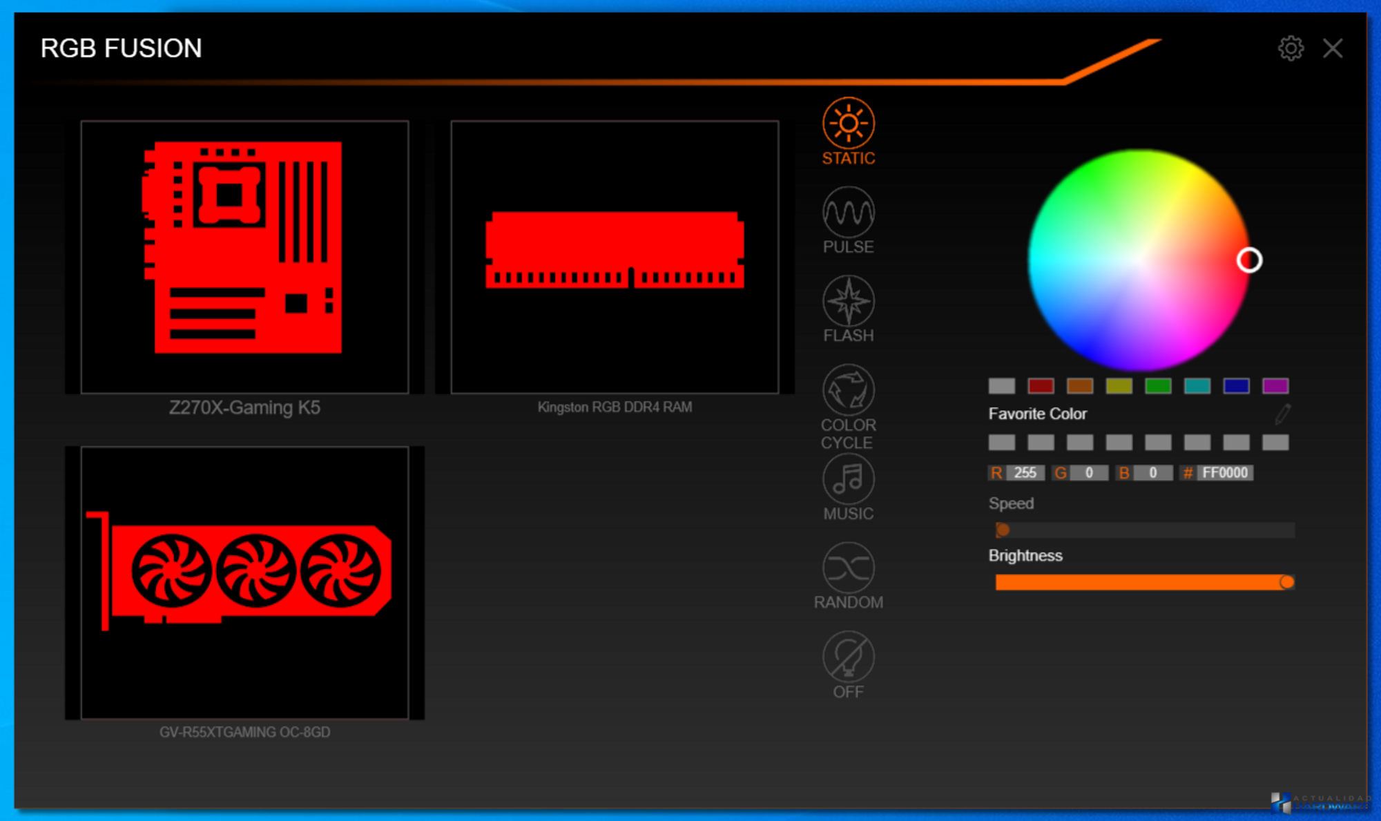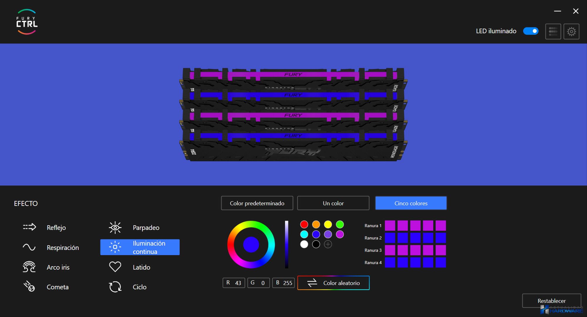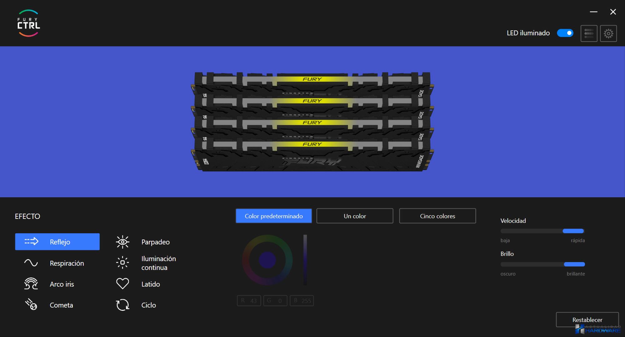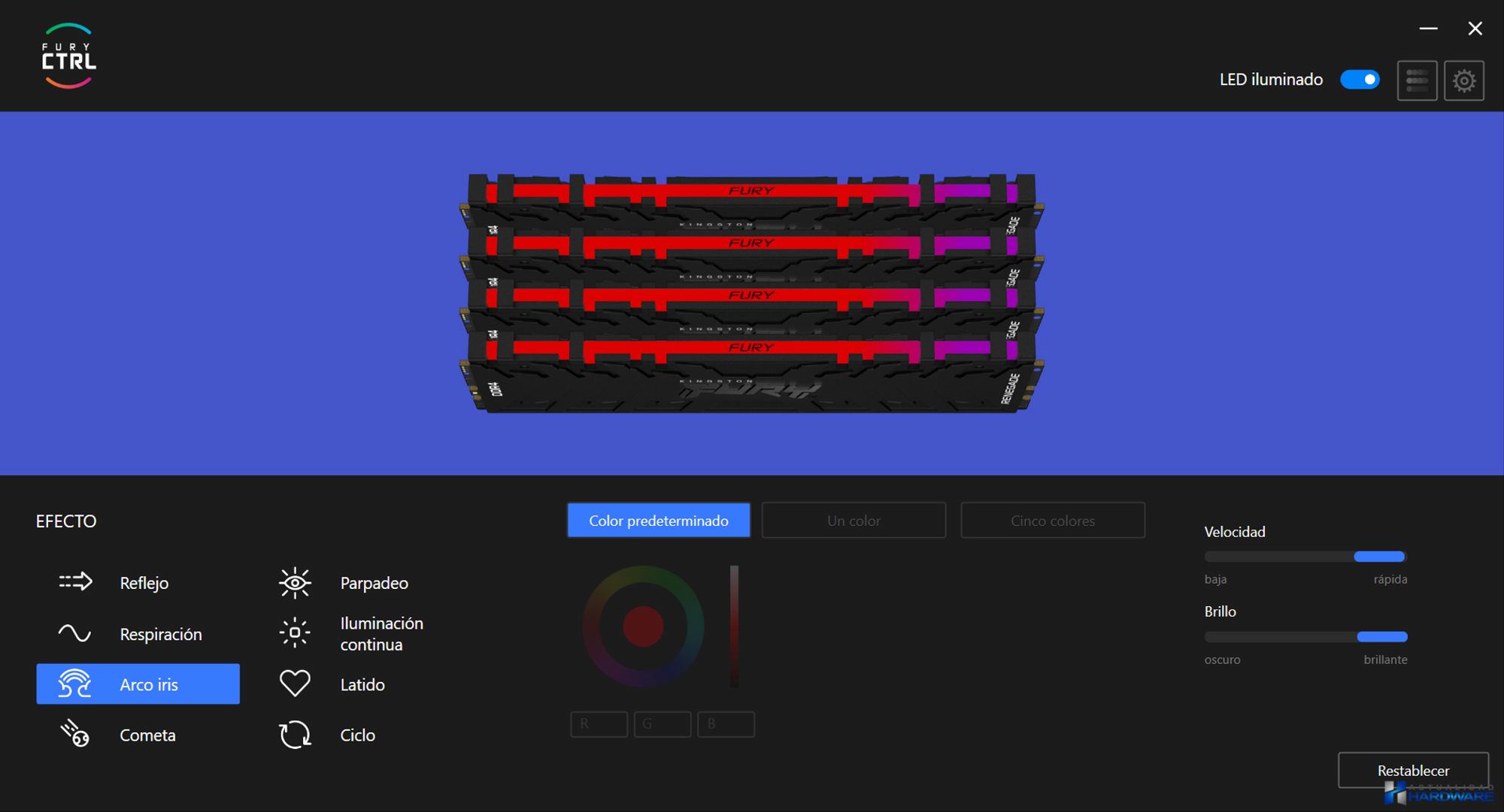 | El software con el que podemos configurar la iluminación de las memorias se denomina FURY CTRL. La aplicación es algo simple ya que únicamente nos permite cambiar la iluminación no permitiendo monitorizar ni frecuencias ni temperaturas de las mismas. Con este software podremos cambiar tanto el color de la iluminación como los diferentes efectos de los que se dispone, concretamente ocho de ellos, los cuales son además configurables. Es posible hasta por ejemplo configurar el color de la iluminación de cada módulo por sección por lo que las posibilidades de iluminación se multiplican. El que sean compatibles con los ecosistemas de iluminación de los diferentes fabricantes de placas base hacen que la experiencia de visualización de nuestro setup sea suprema. | ||||||||
