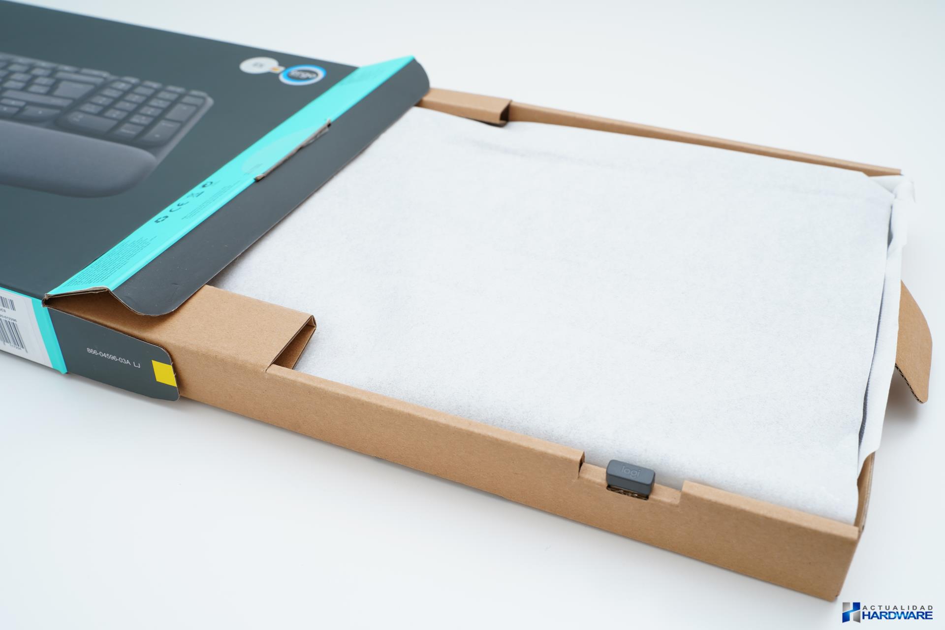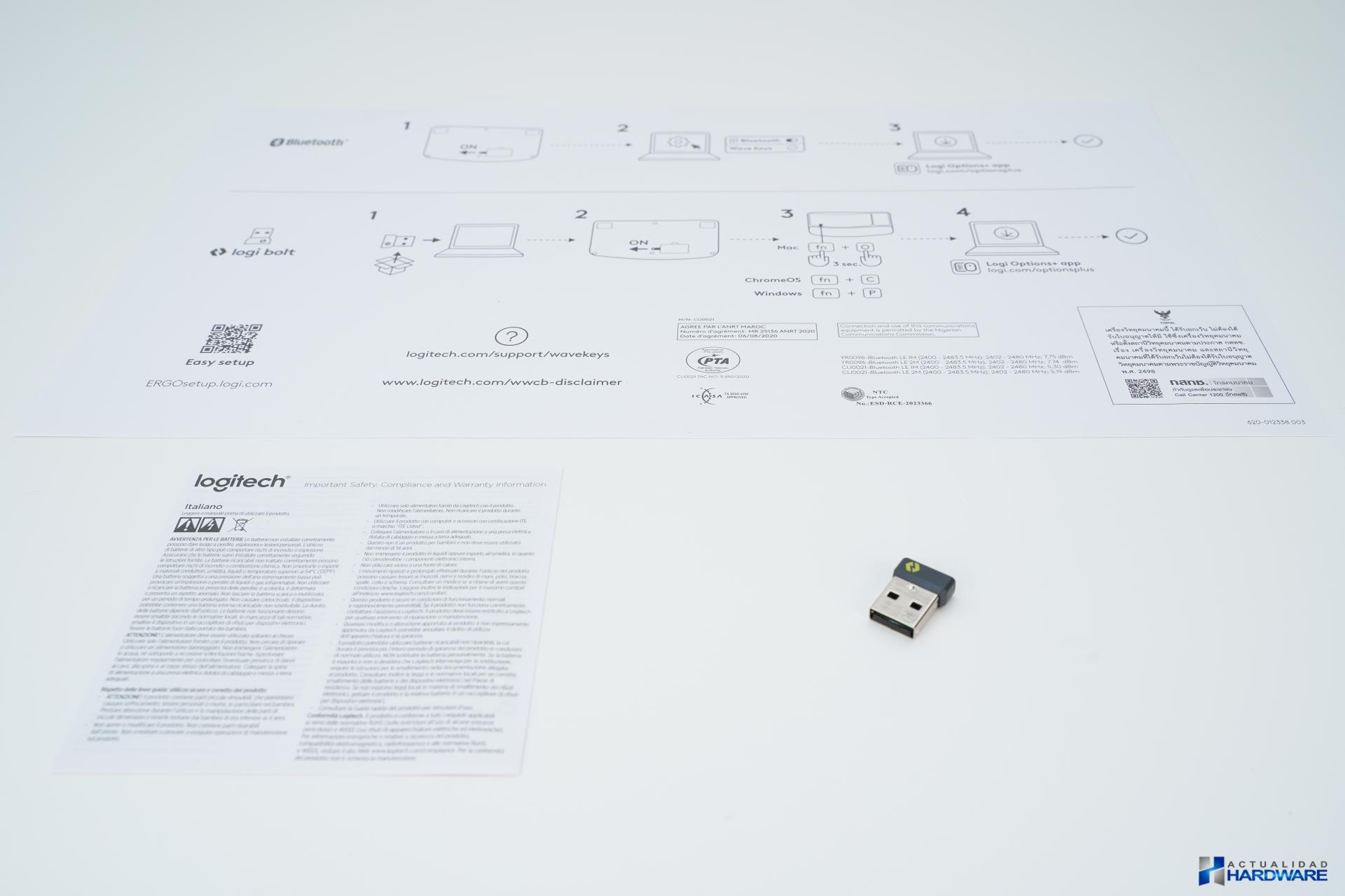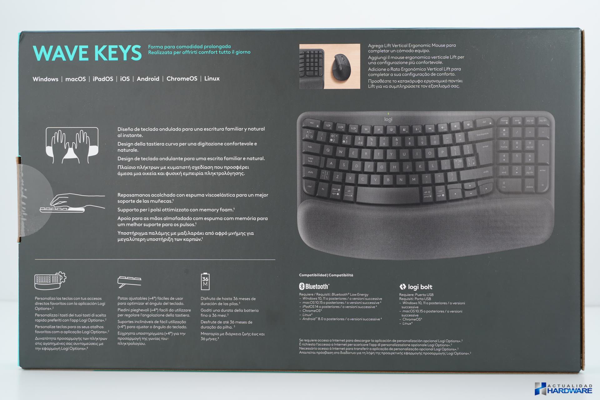 El LOGITECH WAVE KEYS se presenta en una caja de cartón con un diseño bastante llamativo donde a lo largo y ancho de la misma podemos ver tanto imágenes del producto como algunas de sus características más importantes. Una vez abierto su embalaje vemos que todo se presenta perfectamente embalado y protegido. Como accesorios se incluyen un receptor Logi Bolt, una guía rápida para emparejarlo mediante bluetooth y un panfleto acerca de la garantía del producto.