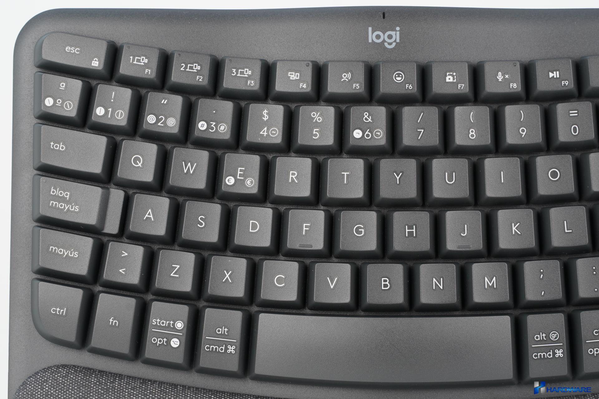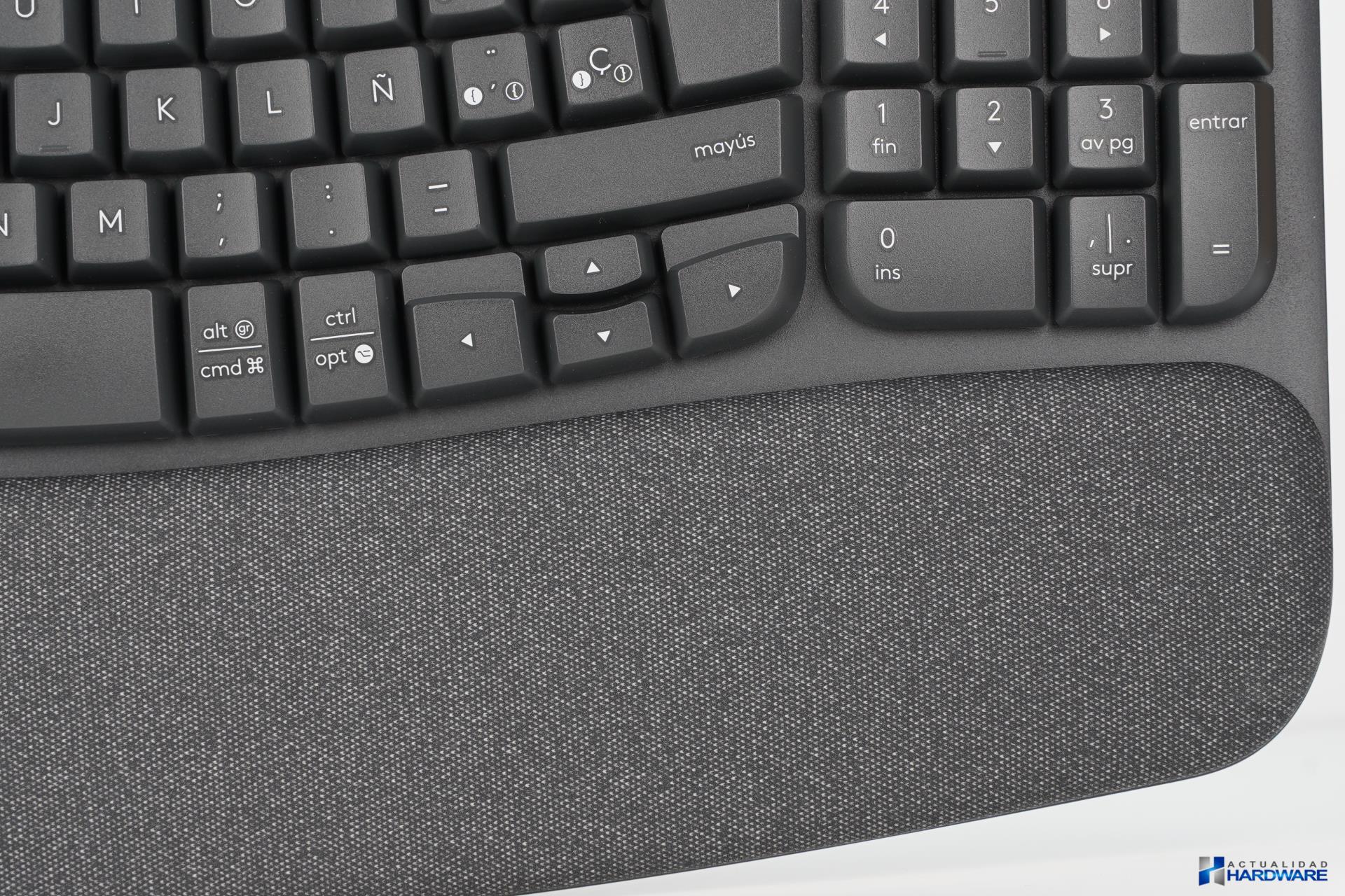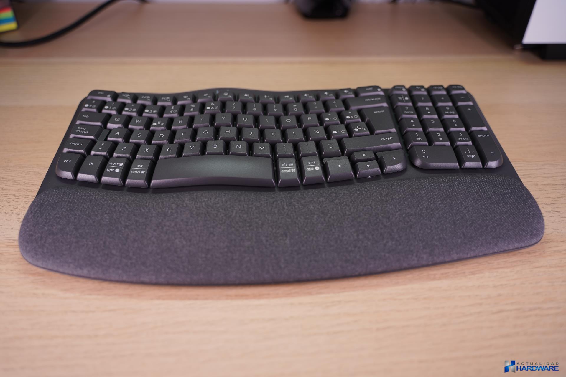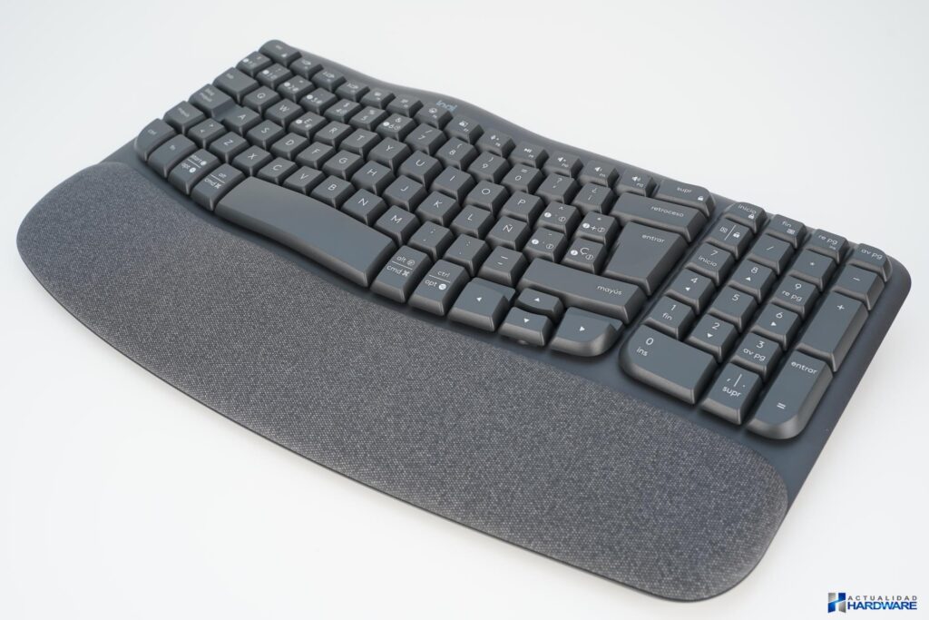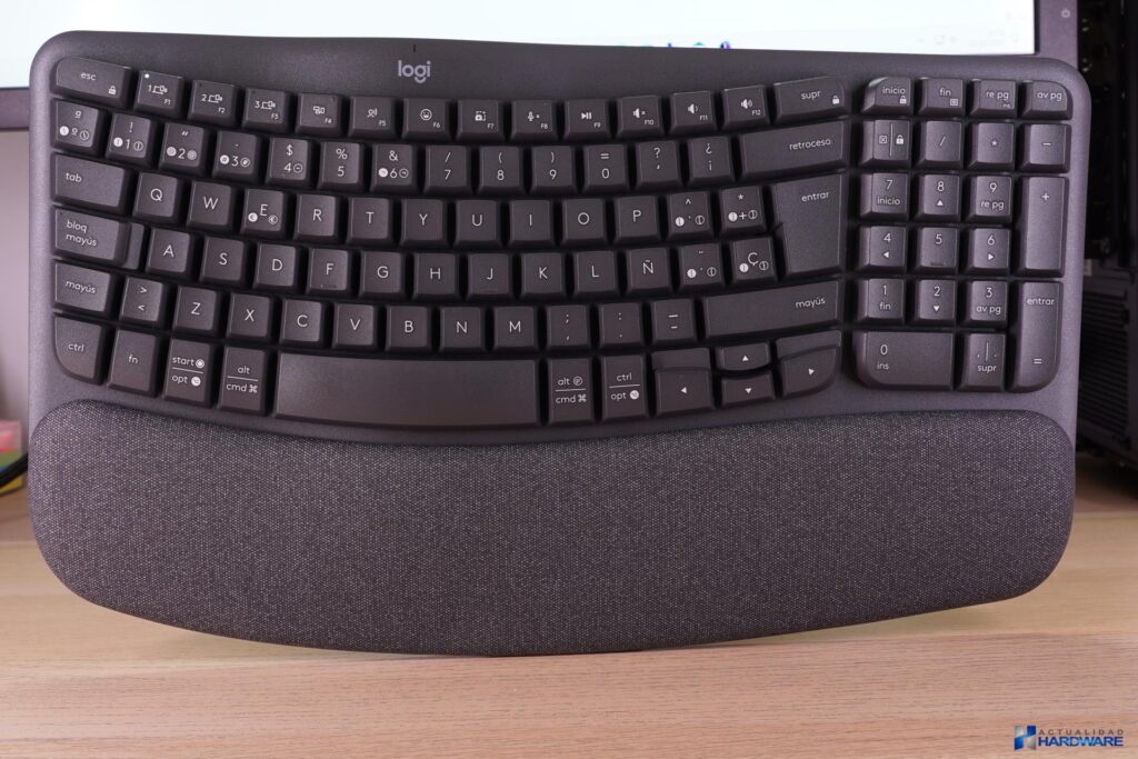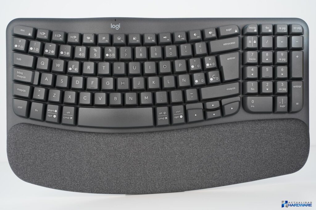 Una vez puesto el LOGITECH WAVE KEYS sobre nuestra mesa de trabajo vemos que se trata de un teclado ergonómico de tamaño compacto con pad numérico. Sus dimensiones son de 219x376x30mm y su peso de 750 gramos (con pilas). El mismo se encuentra fabricado en plástico de tacto rugoso y cuenta con un buen diseño en color gris oscuro, estando también disponible en color blanco, así como con una buena construcción y ensamblaje. El teclado no es retroiluminado y es algo lógico ya que de lo contrario su autonomía se reduciría drásticamente. Sudistribución/layout es “QWERTY”, “Español – ISO”, es decir, incluyela tecla “ñ” y “Enter” doble, aunque con matices, tal y como podemos ver en las imágenes, ya que la disposición de algunas de sus teclas no están situadas en el mismo sitio como si lo estarían en un teclado convencional -suprimir, inicio y fin, entre otras- con pad número, todo ello para conseguir el tamaño compacto con el que cuenta este keyboard. No incluye los típicos indicadores de estados led como si lo hace un teclado estándar, el único que incluye es el de bloqueo de mayúsculas en la misma tecla.Las teclas se encuentran fabricadas en plástico ABS con un buen tacto rugoso, acabados y agradable serigrafía. El teclado incluye un reposamuñecas acolchado con espuma viscoelástica con una buena firmeza para una mayor comodidad. Cuenta además con un botón mediante el cual podemos apagar y encender el teclado cuando lo necesitemos. Justo encima del logo de LOGITECH dispone de un led de color verde indicador estado del nivel de carga de sus pilas. Dispone de la EasySwitch de hasta 3 canales por lo que podremos utilizarlo hasta con 3 ordenadores diferentes con solo pulsar un botón.