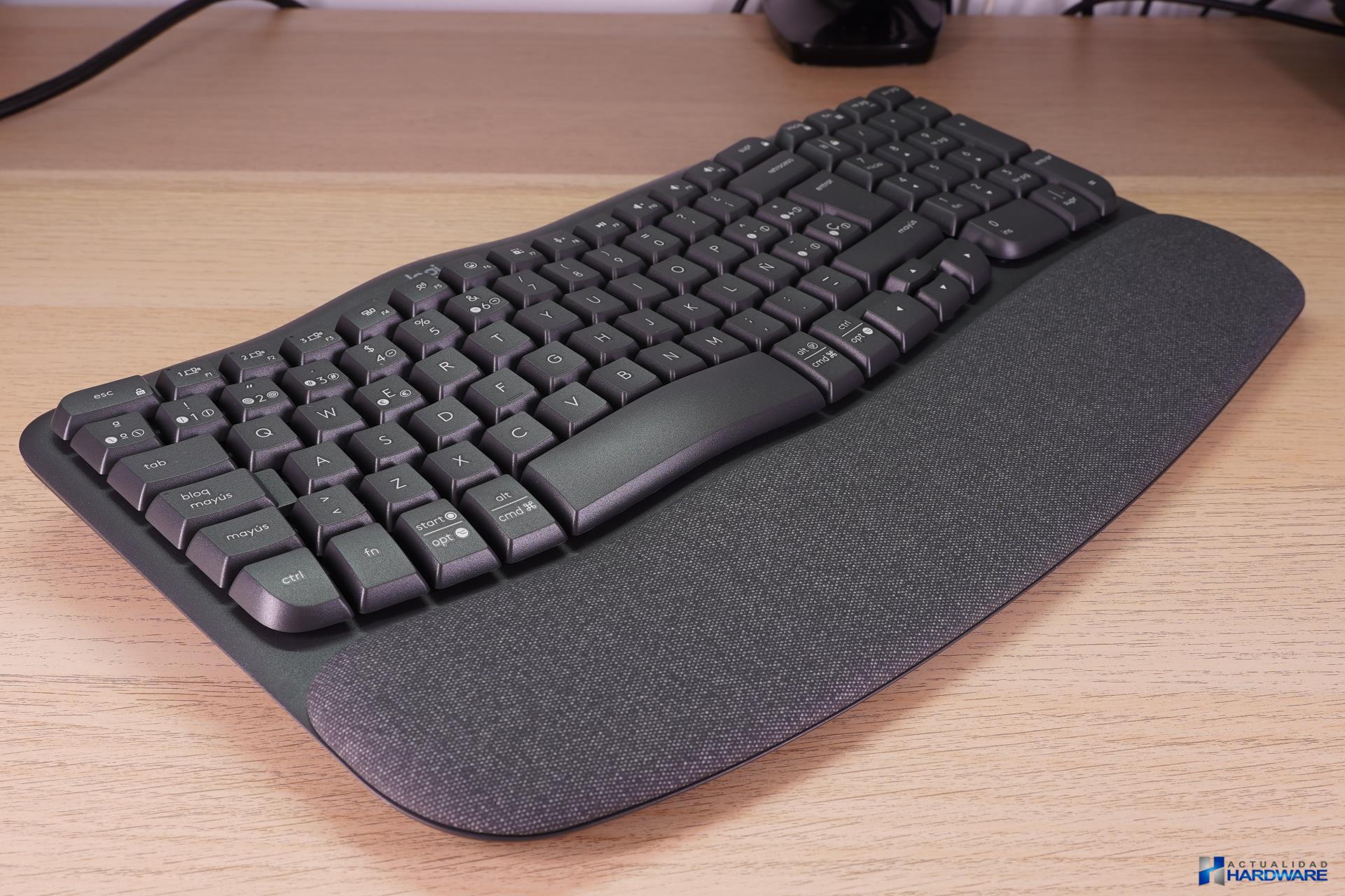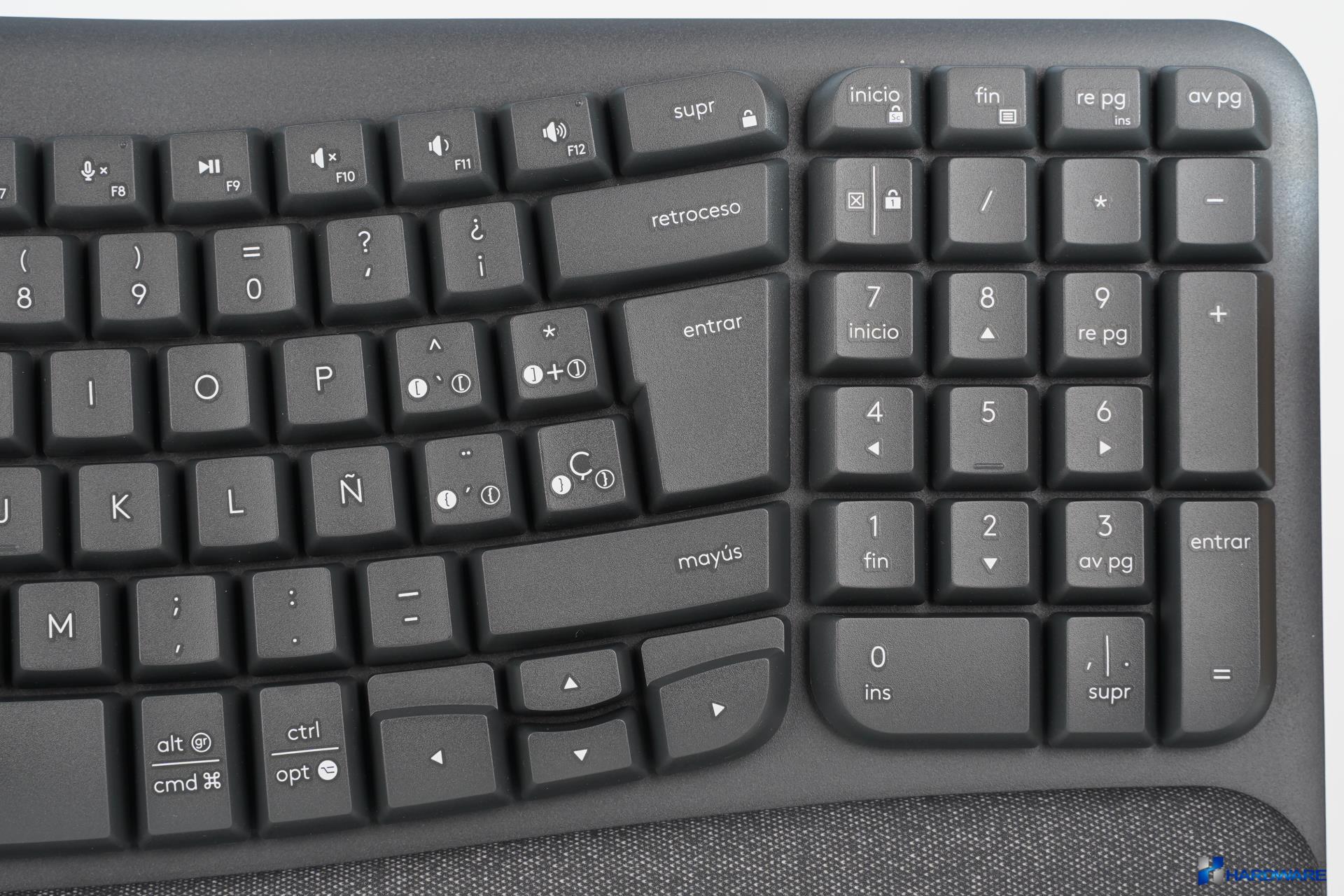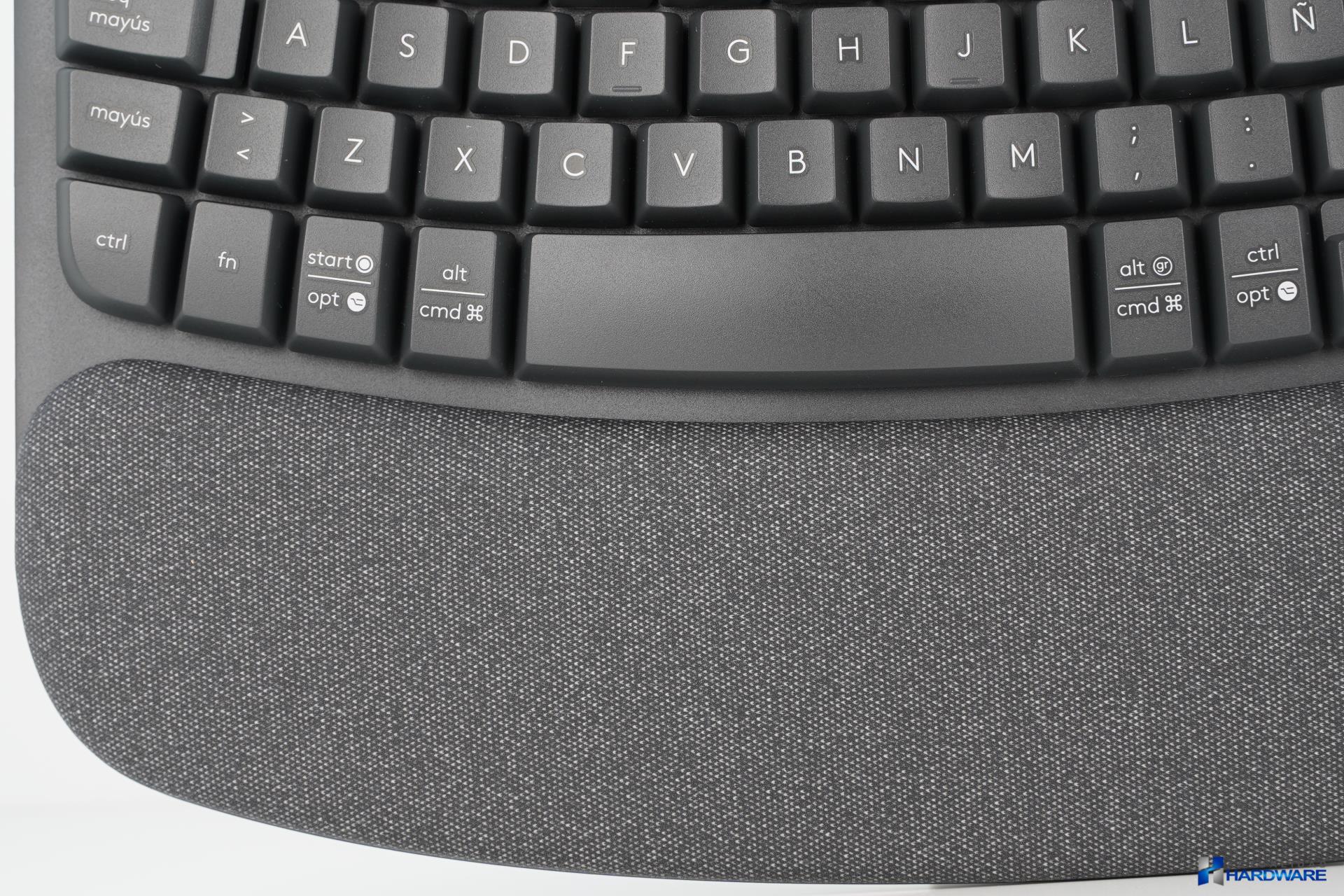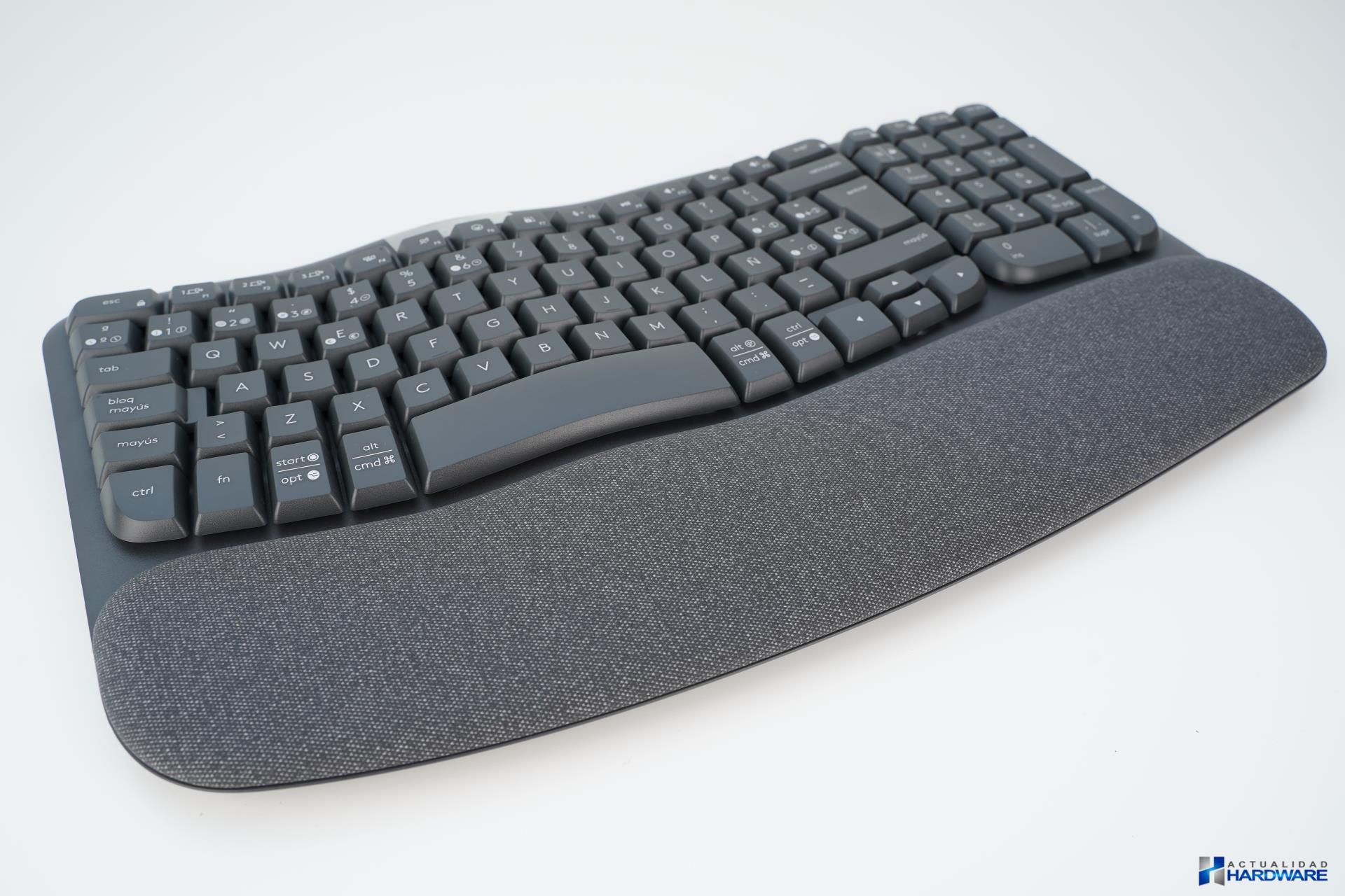 Una vez puesto el LOGITECH WAVE KEYS sobre nuestra mesa de trabajo vemos que se trata de un teclado ergonómico de tamaño compacto con pad numérico. Sus dimensiones son de 219x376x30mm y su peso de 750 gramos (con pilas). El mismo se encuentra fabricado en plástico de tacto rugoso y cuenta con un buen diseño en color gris oscuro, estando también disponible en color blanco, así como con una buena construcción y ensamblaje. El teclado no es retroiluminado y es algo lógico ya que de lo contrario su autonomía se reduciría drásticamente. Sudistribución/layout es “QWERTY”, “Español – ISO”, es decir, incluyela tecla “ñ” y “Enter” doble, aunque con matices, tal y como podemos ver en las imágenes, ya que la disposición de algunas de sus teclas no están situadas en el mismo sitio como si lo estarían en un teclado convencional -suprimir, inicio y fin, entre otras- con pad número, todo ello para conseguir el tamaño compacto con el que cuenta este keyboard. No incluye los típicos indicadores de estados led como si lo hace un teclado estándar, el único que incluye es el de bloqueo de mayúsculas en la misma tecla.Las teclas se encuentran fabricadas en plástico ABS con un buen tacto rugoso, acabados y agradable serigrafía. El teclado incluye un reposamuñecas acolchado con espuma viscoelástica con una buena firmeza para una mayor comodidad. Cuenta además con un botón mediante el cual podemos apagar y encender el teclado cuando lo necesitemos. Justo encima del logo de LOGITECH dispone de un led de color verde indicador estado del nivel de carga de sus pilas. Dispone de la EasySwitch de hasta 3 canales por lo que podremos utilizarlo hasta con 3 ordenadores diferentes con solo pulsar un botón.
