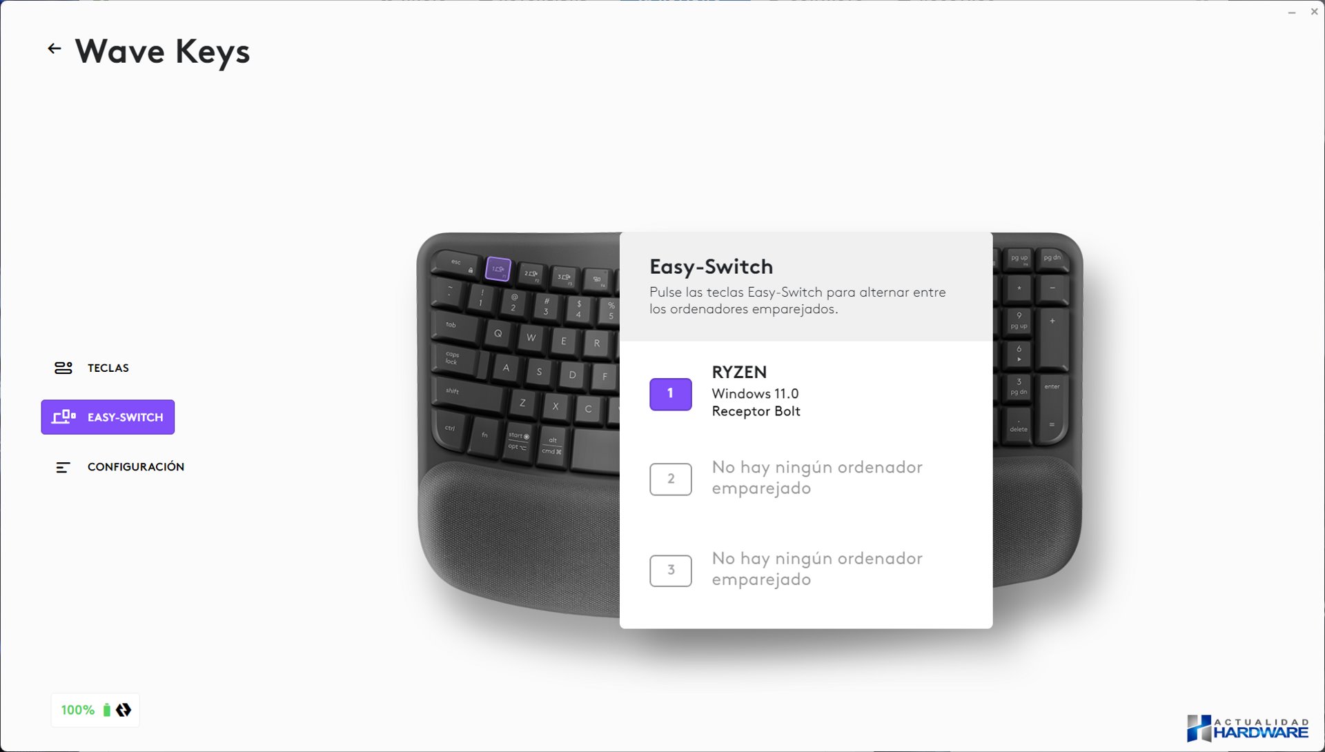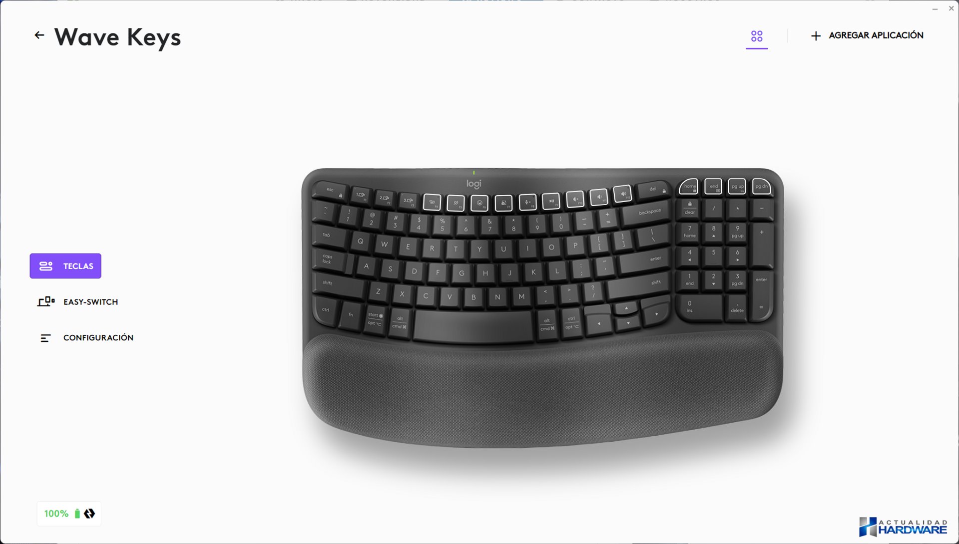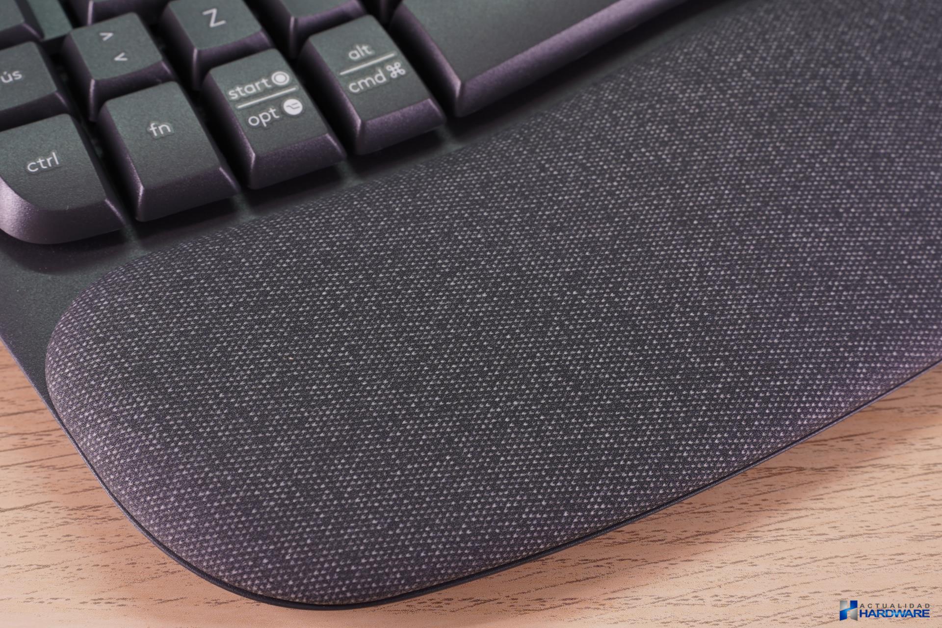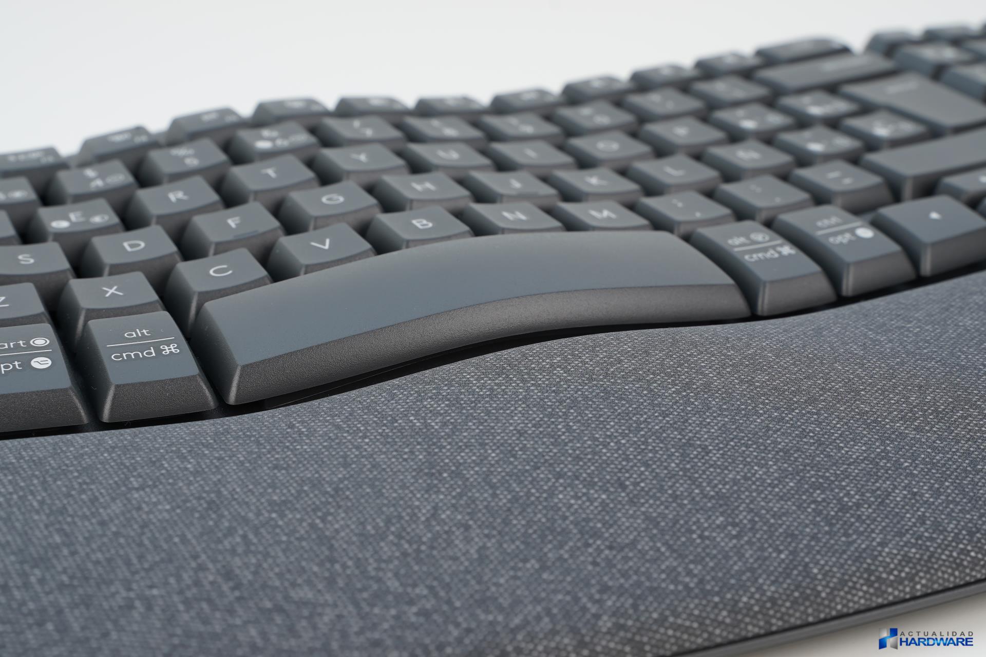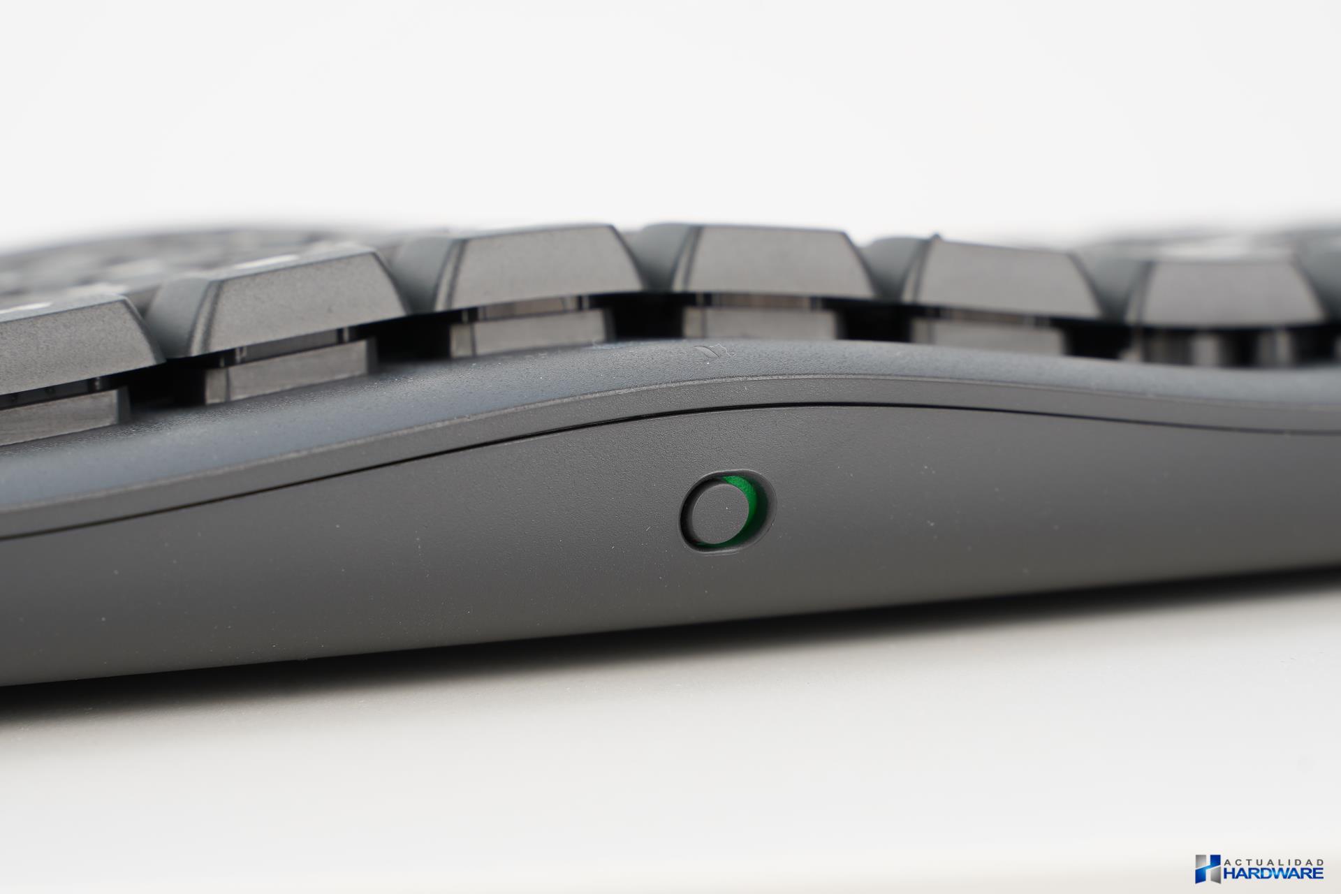 Una vez puesto el LOGITECH WAVE KEYS sobre nuestra mesa de trabajo vemos que se trata de un teclado ergonómico de tamaño compacto con pad numérico. Sus dimensiones son de 219x376x30mm y su peso de 750 gramos (con pilas). El mismo se encuentra fabricado en plástico de tacto rugoso y cuenta con un buen diseño en color gris oscuro, estando también disponible en color blanco, así como con una buena construcción y ensamblaje. El teclado no es retroiluminado y es algo lógico ya que de lo contrario su autonomía se reduciría drásticamente. Sudistribución/layout es “QWERTY”, “Español – ISO”, es decir, incluyela tecla “ñ” y “Enter” doble, aunque con matices, tal y como podemos ver en las imágenes, ya que la disposición de algunas de sus teclas no están situadas en el mismo sitio como si lo estarían en un teclado convencional -suprimir, inicio y fin, entre otras- con pad número, todo ello para conseguir el tamaño compacto con el que cuenta este keyboard. No incluye los típicos indicadores de estados led como si lo hace un teclado estándar, el único que incluye es el de bloqueo de mayúsculas en la misma tecla.Las teclas se encuentran fabricadas en plástico ABS con un buen tacto rugoso, acabados y agradable serigrafía. El teclado incluye un reposamuñecas acolchado con espuma viscoelástica con una buena firmeza para una mayor comodidad. Cuenta además con un botón mediante el cual podemos apagar y encender el teclado cuando lo necesitemos. Justo encima del logo de LOGITECH dispone de un led de color verde indicador estado del nivel de carga de sus pilas. Dispone de la EasySwitch de hasta 3 canales por lo que podremos utilizarlo hasta con 3 ordenadores diferentes con solo pulsar un botón.