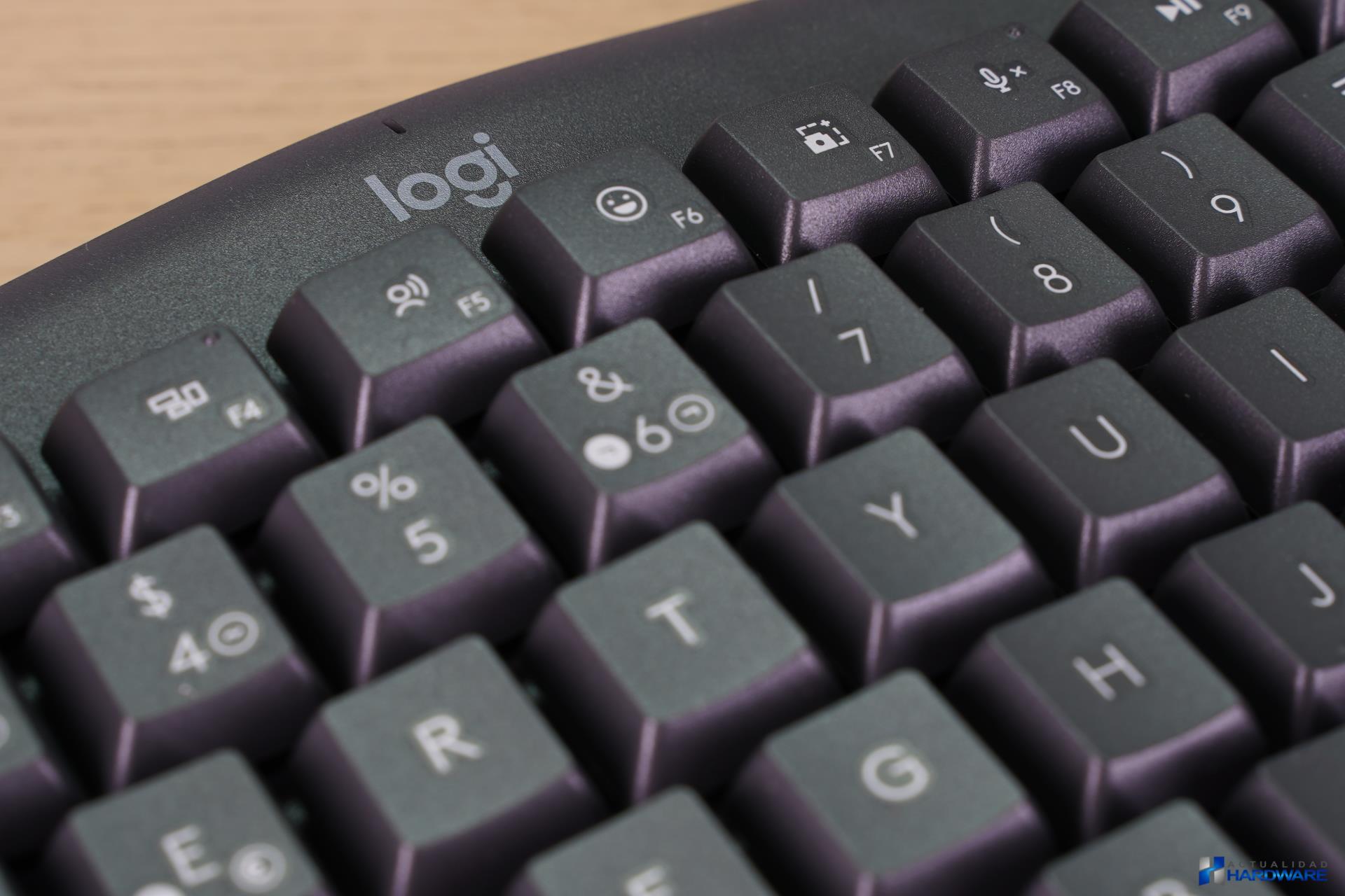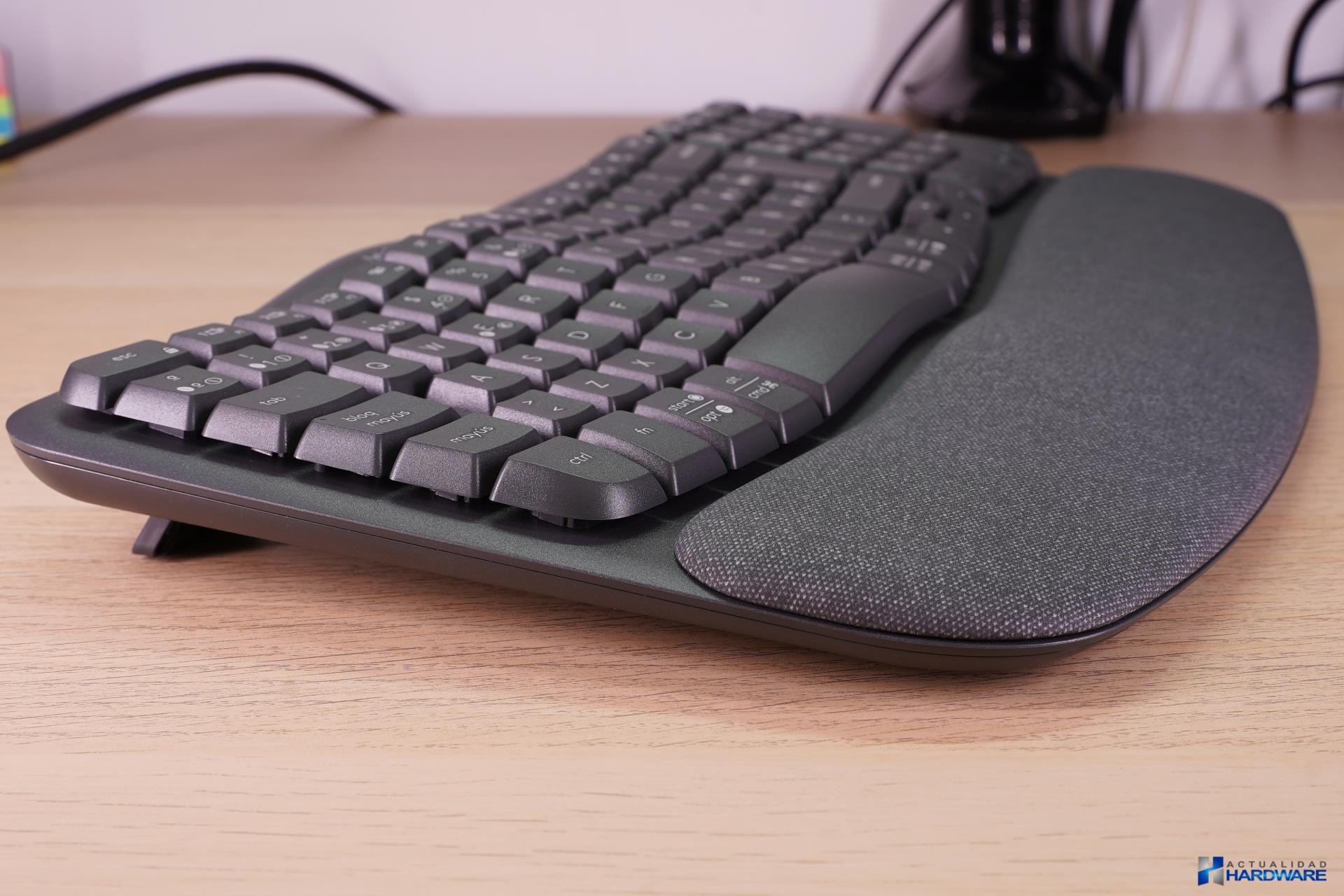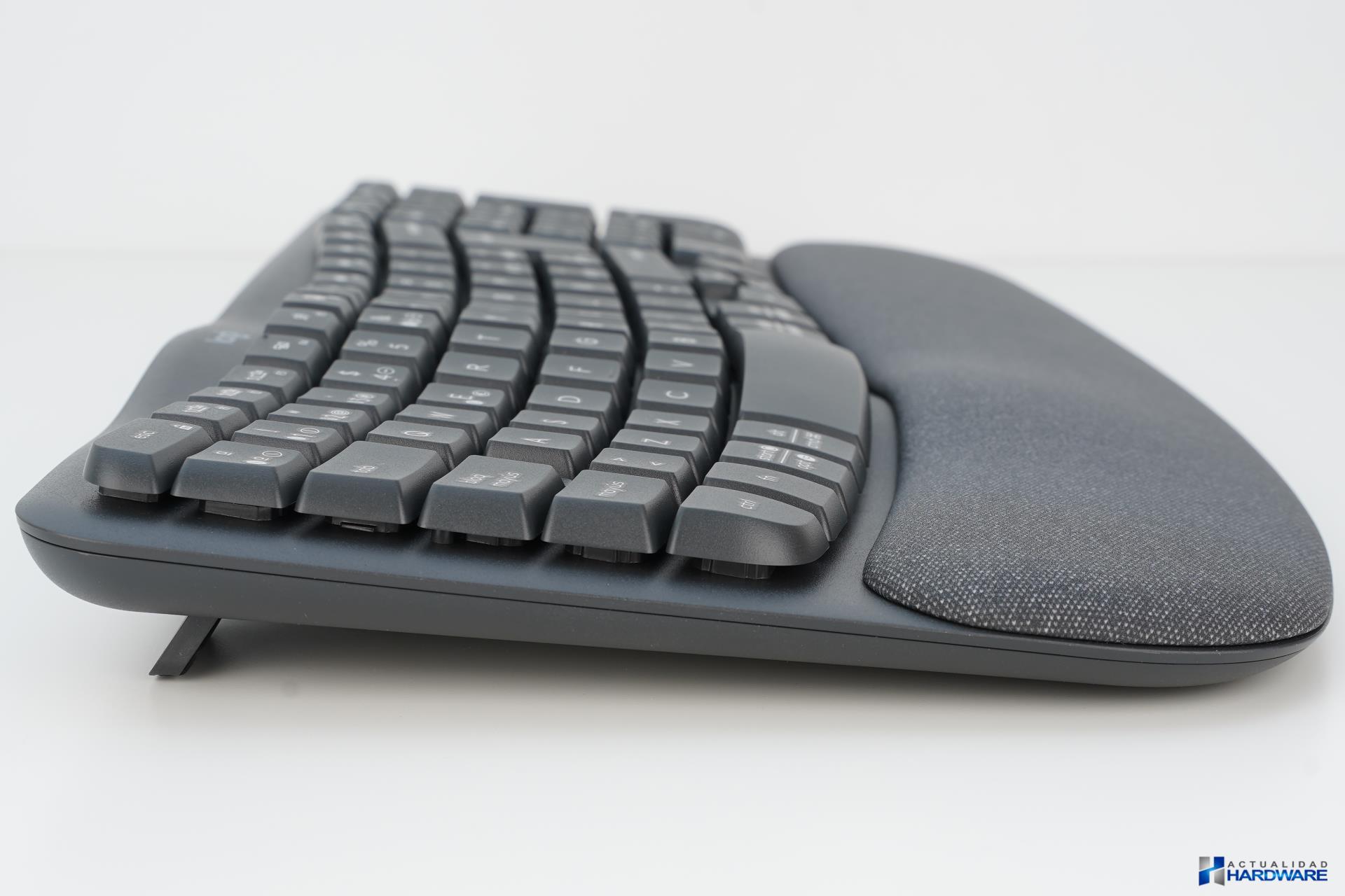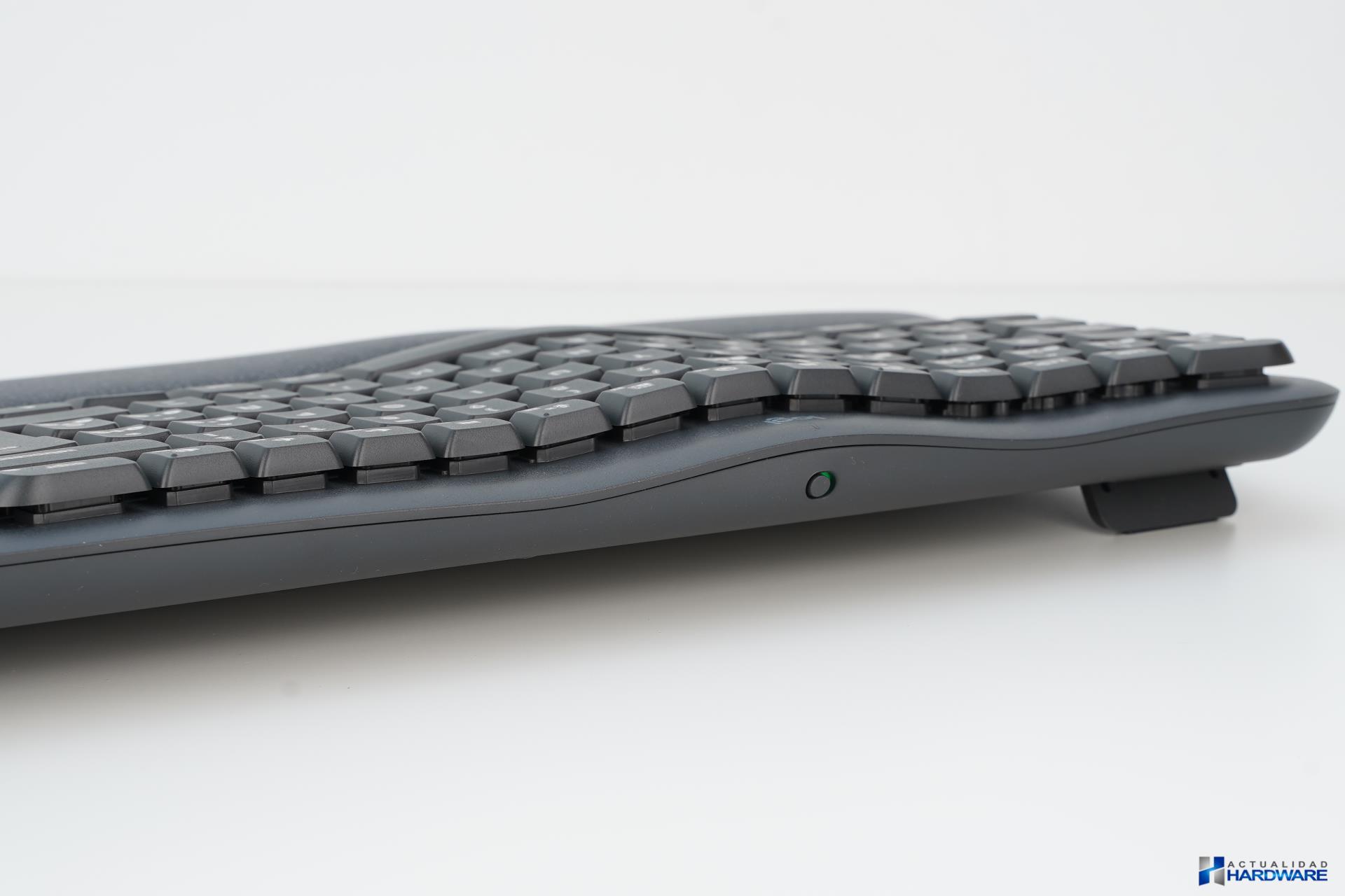 Es un teclado con forma de ola que nos ofrece de este modo una ergonomía genial al conseguir que las manos, las nuñecas y nuestos brazos mantegan una posición natural mientra escribimos. El que cuente con Certificaciones de United States Ergonomics™ y de Works With Chromebook es un plus muy a tener en cuenta ya que nos certifican que estamos delante de un teclado especialmente diseñado para conseguir la máxima ergonomía posible. En su reverso además de la etiqueta del producto se incluyen un total de seissurfers/almohadillas de goma y dos patas elevadoras, también con surfers/almohadillas, con las que podremos configurar al altura del teclado a nuestro gusto. Es un keyboardde membrana con 99 teclas y 10 de teclado númerico además de teclasmultifunción activables mediante «fn». Incluye de serie dos pilas AAA con una autonomía según el fabricante de hasta 3 años, pero como siempre dependerá de uso que le demos al teclado y la distancia al receptor, teniendo en este caso un alcance de hasta 10 metros. El teclado incorpora anti-ghosting y6-Key Rollover, es decir, podemos pulsar 6 teclas simultáneamente y se registraran perfectamente. En compartimento para las pilas cuenta con un hueco para poder guardar el receptor Logi Bolt. Un aspecto a tener en cuenta es que para emparejarlo podemos utilizar el referido receptor Logi Bolt que se incluye de serie o bien la conexión Bluetooth -versión 5.1- del equipo al que vayamos a conectarlo. A todo esto comentaros que su durabilidad está estimada en 10 millones (teclas estándar) y 5 millones (teclas de la fila F) de pulsaciones, todo ello con un MTTF de más de 150 000 horas, por lo que estamos delante de un teclado especialmente diseñado para durar.