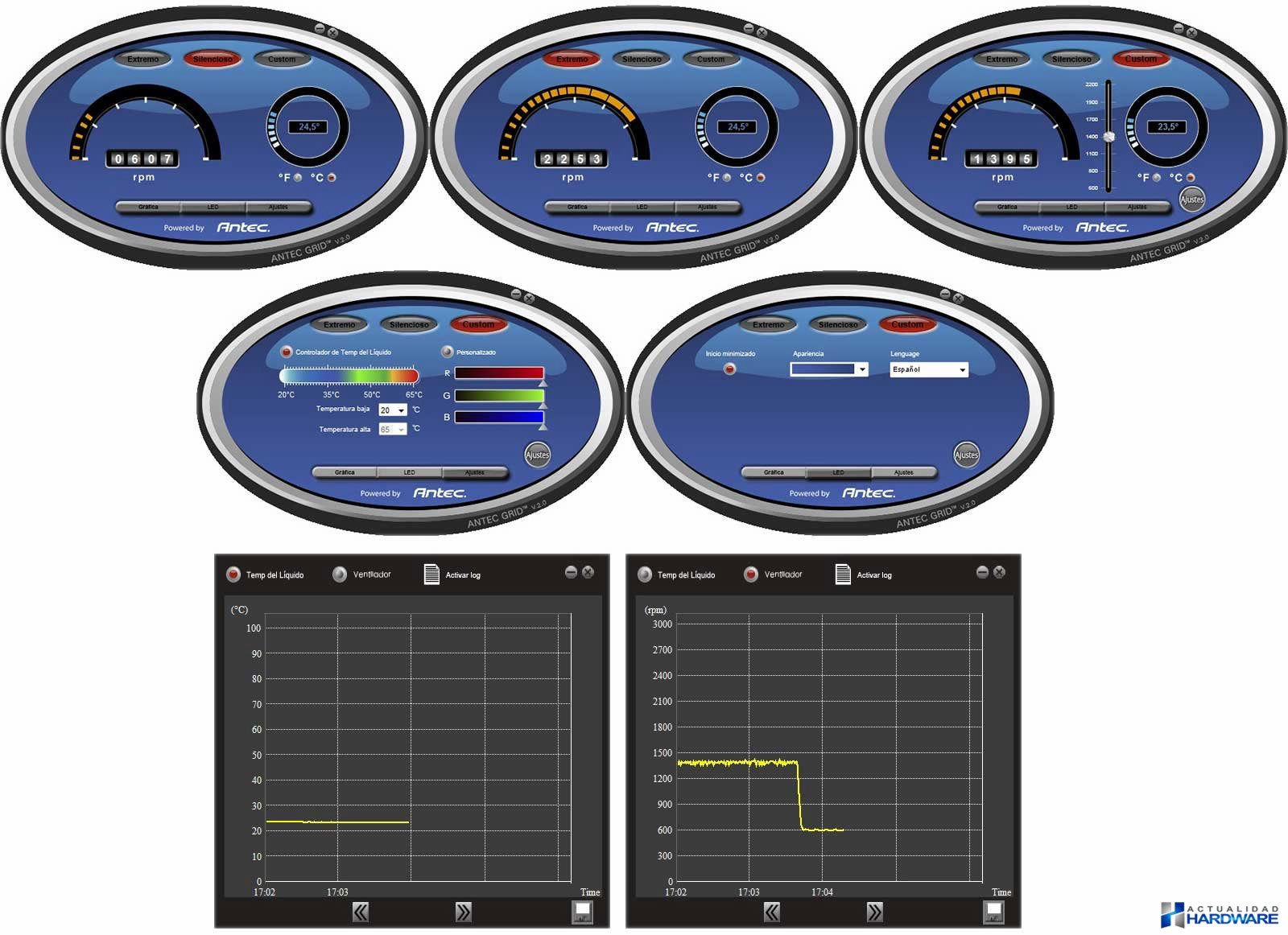 La instalación del KÜHLER H2O 1250 de ANTEC es sencilla ya que tan solo debemos colocar la tornillería en el backplate (pegaremos sobre el reverso de éste una tiras de gomas adhesivas) y lo colocaremos, luego debemos fijar el radiador, configurar el aro para Intel o AMD y fijarlo al bloque, y por último atornillar éste al backplate mediante la tornillería incluida para ello. Tras todo lo anterior nos quedaría conectar el cable USB y el cableado tanto para alimentar la bomba como para los ventiladores. Podemos utilizar los ventiladores de dos formas distintas, es decir, conectándolo al bloque y de ésta manera podemos controlar los mismos mediante el software Antec Grid o bien conectándolos directamente a la placa base y se ésta se encargará de controlar sus velocidades de giro ya que los mismos son PWM. A través de la utilidad Antec Grid podemos controlar la velcidad de giro de los ventiladores mediante tres opciones: extremo (2400rpm), silencioso (600rpm) o custom (podemos seleccionar las revoluciones a nuestro gusto). También podemos seleccionar la iluminación automática (dependiendo de la temperatura cambia la iluminación del bloque) o manual (podemos seleccionar la iluminación permanente a nuestro gusto pudiendo elegir entre seis tipos diferentes de colores). Por último a través de la aplicación Grid de Antec es posible monitorizar tanto las temperaturas como las revoluciones de los ventiladores. Una pequeña pero útil utilidad que nos permite controlar diferentes aspectos de nuestro KÜHLER H2O 1250. Para el testeo hemos utilizado la aplicación OCCT realizando la prueba Linpack durante una hora y los resultados (con una temperatura ambiente de unos 24ºC aproximadamente) han sido buenos obteniendo una temperatura en idle de 27ºC y en full de 69ºC, por tanto es un buen sistema de refrigeración líquida con el que obtendremos unas buenas temperaturas incluso si exprimimos nuestros sistema mediante OC. En cuanto a la sonoridad del conjunto podemos decir que las bombas suenan levemente pero sinceramente nos hubiese gustando que sonaran algo menos. La sonoridad de los ventiladores a bajas revoluciones es buena, a medias suenan algo más pero a tope son ruidosos por lo que desearíamos que para futuras versiones/revisiones mejoraran éste aspecto. En conjunto es buen kit de refrigeración líquida que consigue unas buenas temperaturas y una sonoridad aceptable a bajas/medias revoluciones.