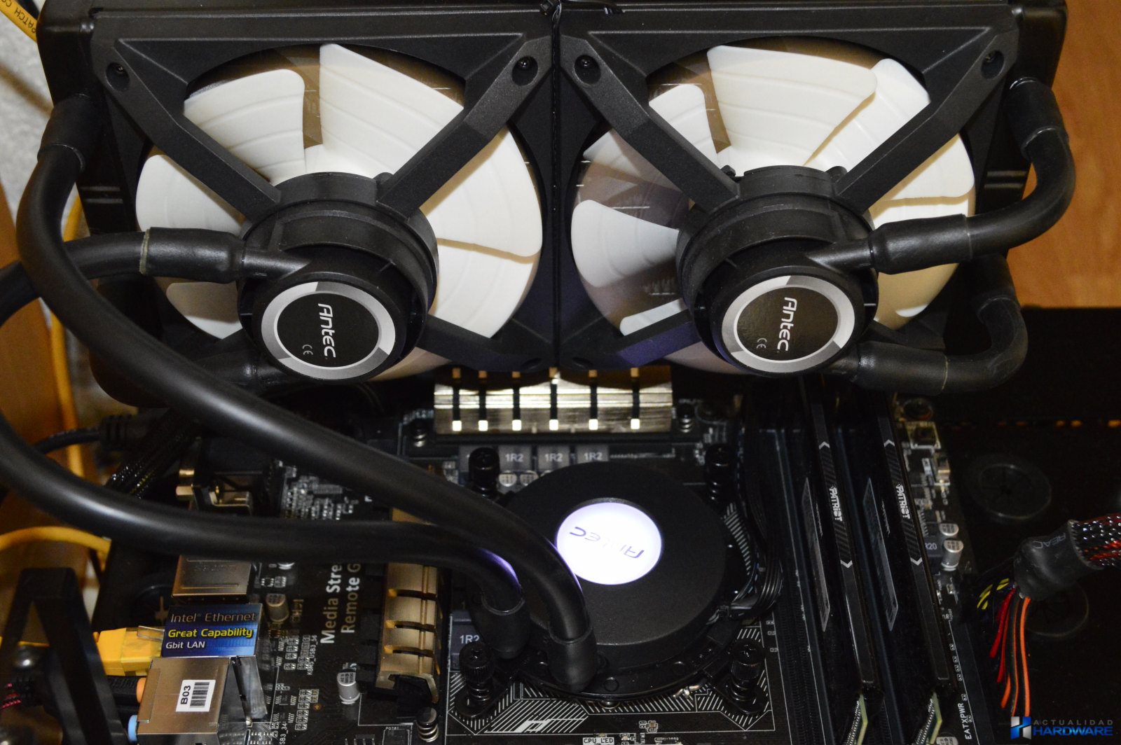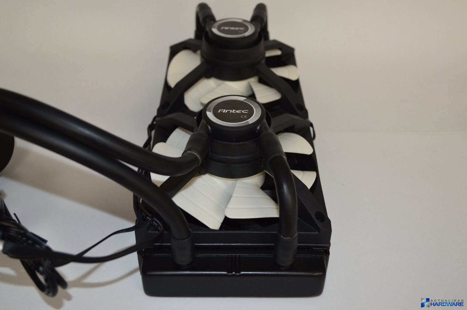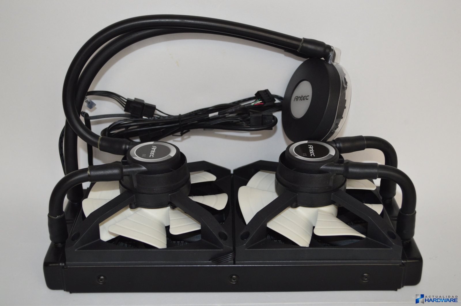 Las dos bombas incluidas son las encargadas de hacer girar el líquido refrigerante de una manera potente y constante. El bloque cuenta con una base de cobre perfectamente pulida e incorpora una fina capa de compuesto térmico aplicada. Además en su parte superior incorpora iluminación LED RGB con el logo de Antec iluminándose el mismo en varios colores dependiendo de la temperatura de la CPU en cada momento, gestionable a través del software Antec Grid. Del bloque parte el cableado que es necesario para hacer funcionar todo el conjunto (cableado para ventiladores, para placa base Fan CPU y conector para USB necesario para poder controlar el LED RGB, las revoluciones de los ventilador y la monitorización tanto de temperatura como de ventiladores).