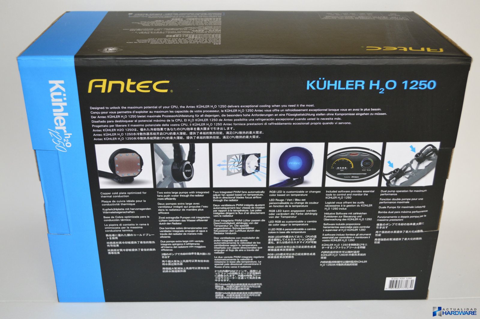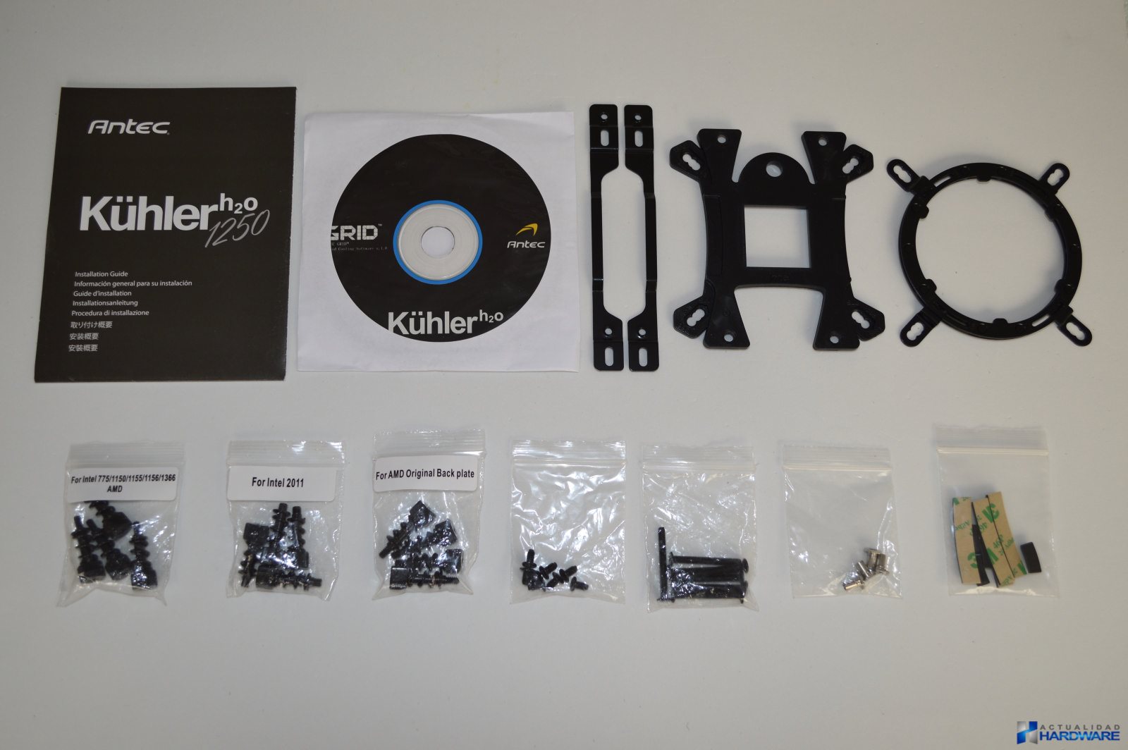 El ANTEC H2O KÜHLER 1250 se presenta en una caja de cartón donde en su parte frontal podemos ver una foto del producto e información acerca del mismo. Tanto en su parte trasera como en sus laterales se continua ofreciendo información aún más detallada acerca de sus características en varios idiomas entre ellos el español. Una vez abierto su embalaje todo viene perfectamente embalado y protegido, además de incluir los siguientes accesorios: manual de usuario en varios idiomas entre ellos el español, disco con drivers/utilidades, backplate y adaptadores para Intel/AMD, aro de sujección del bloque, almohadillas para el backplate, adaptadores para el radiador (en caso de la instalación interfiera con los componentes de la placa base) y tornillería variada necesaria para realizar la instalación en los diferentes sockets soportados. A continuación veremos detalladamente sus interesantes características.