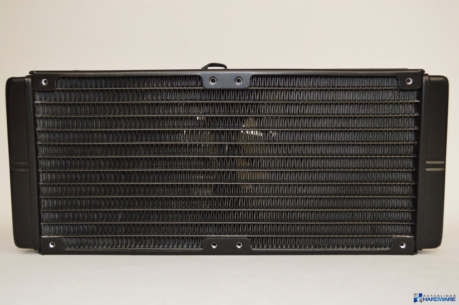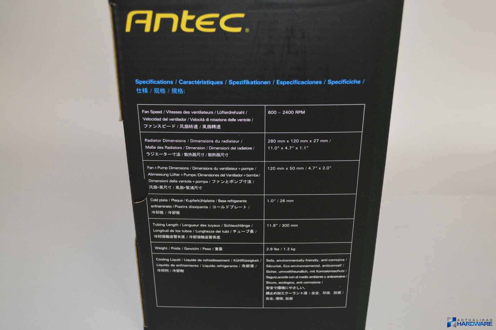 El H2O KÜHLER 1250 de ANTEC es un kit de refrigeración líquida sin mantenimiento que cuenta con un radiador doble de 240mm con unas dimensiones 280mm x 120mm x 27mm y sobre éste se sitúan dos ventiladores ANTEC de 120mm PWM que ajustan su velocidad de giro según la temperatura. Tenemos que decir que hemos recibido la versión 1.1. El radiador está fabricado en aluminio y cuenta con una gran densidad de aletas que aportan un gran poder de refrigeración. Cuenta con dos bombas situadas sobre ambos ventiladores y que son las encargadas de mover el líquido refrigerante a través de todo el circuito. La longitud de los tubos es de 300mm contando con un buen grosor y flexibilidad algo importante para una buena circulación del líquido a través de ellos. En los extremos de éstos se sitúa el bloque con base de cobre que incluye un LED RGB. Los dos ventiladores incluidos son de Antec de 120mm PWM por lo que son capaces de girar desde las 600 a las 2400rpm. Como podemos ver en las diferentes imágenes el conjunto tiene una buena construcción y acabados.