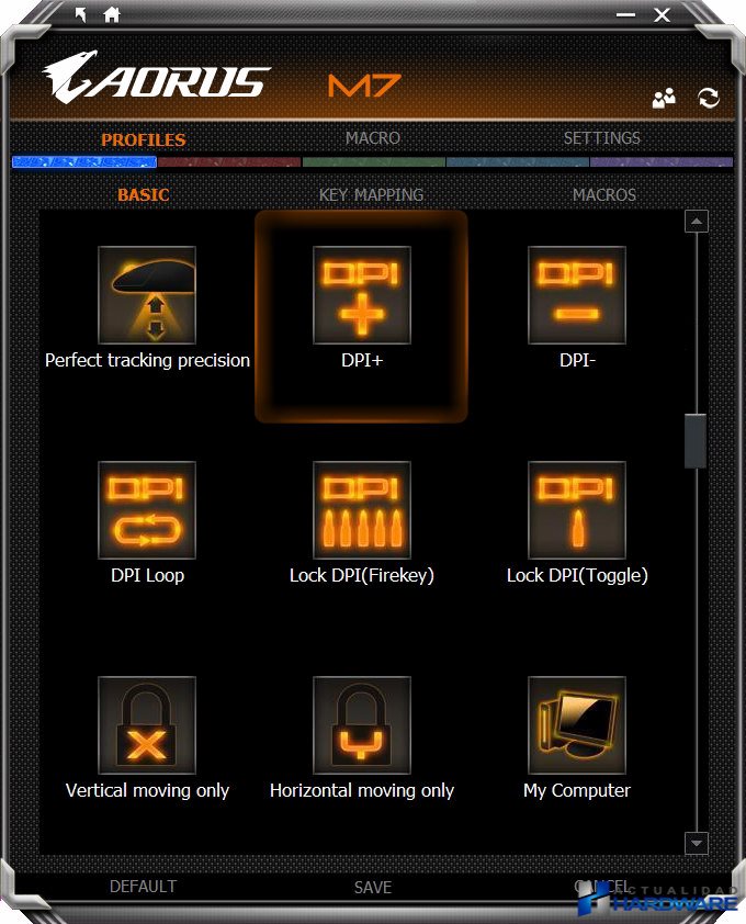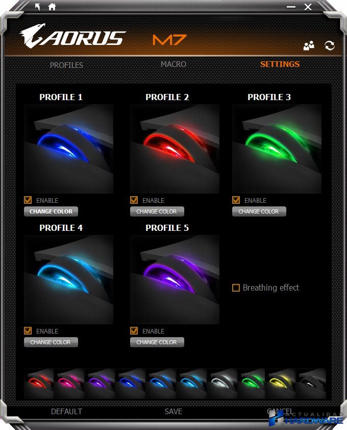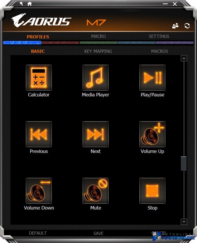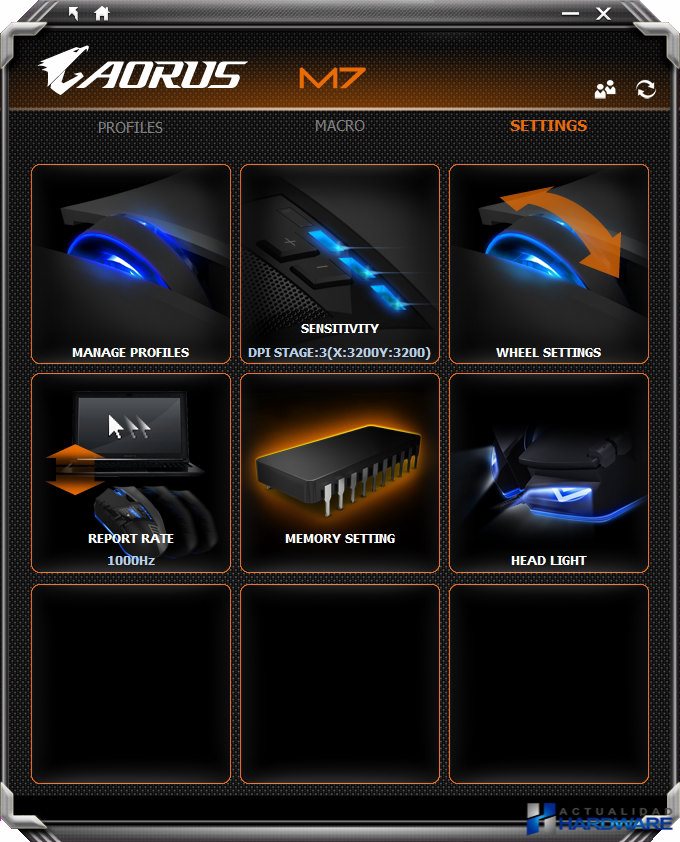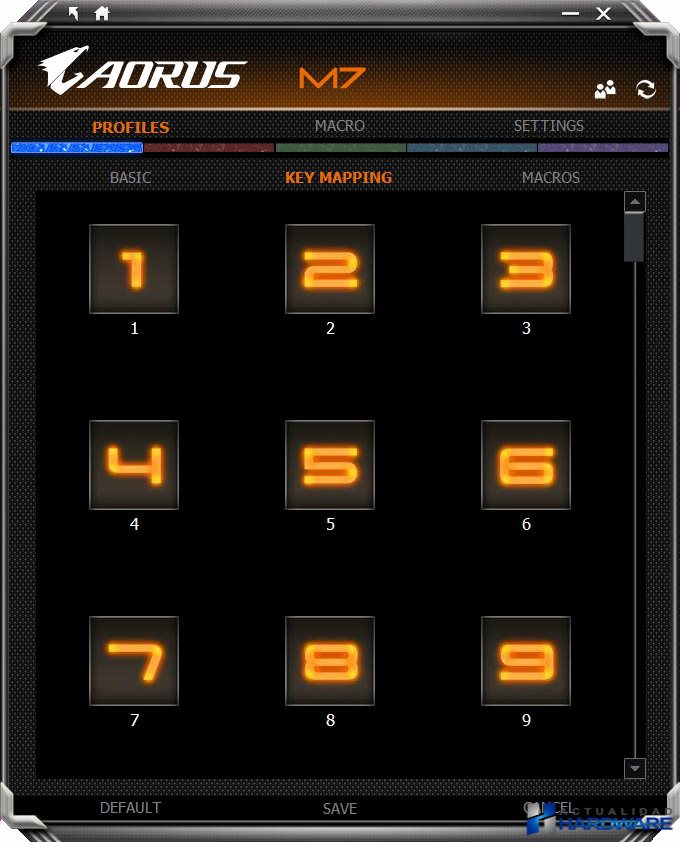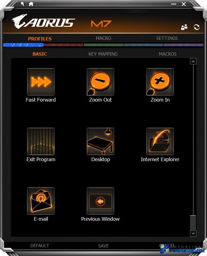 El software encargado de configurar el AORUS THUNDER M7 es muy completo en funcionalidades y se divide en tres grandes bloques de opciones que detallaremos a continuación. Mediante la opción «Profiles» podemos configurar las diferentes acciones que queramos asignarle a cada uno de los botones del ratón, todas ellas funciones básicas preconfiguradas. También podemos configurar además el mapeo de teclas y macros con un total de 70 de ellas, todo ello de una manera muy sencilla gracias a sus intuitivos iconos.