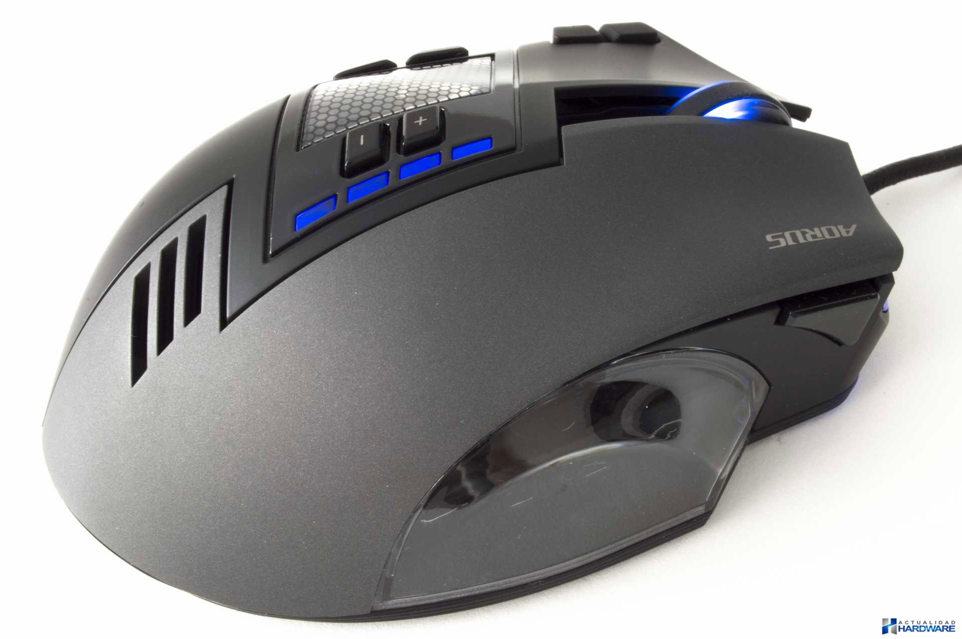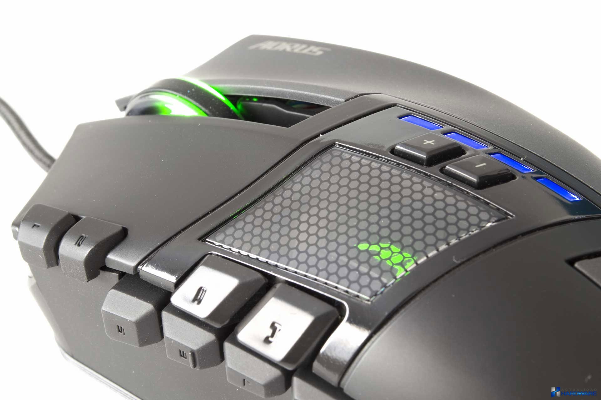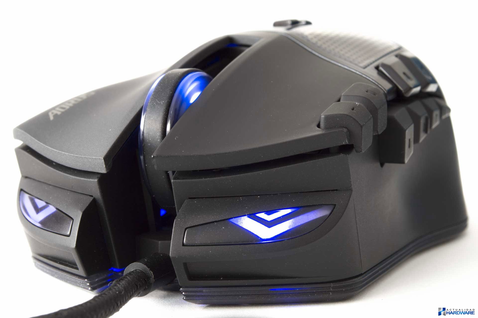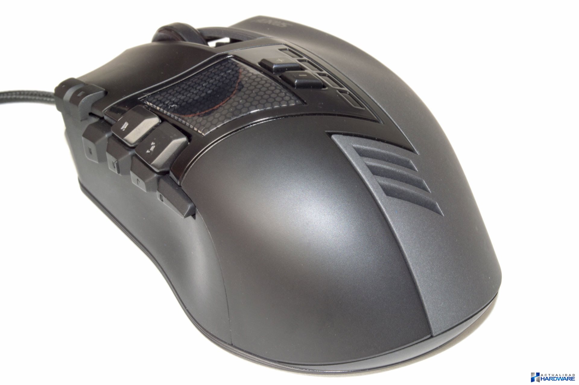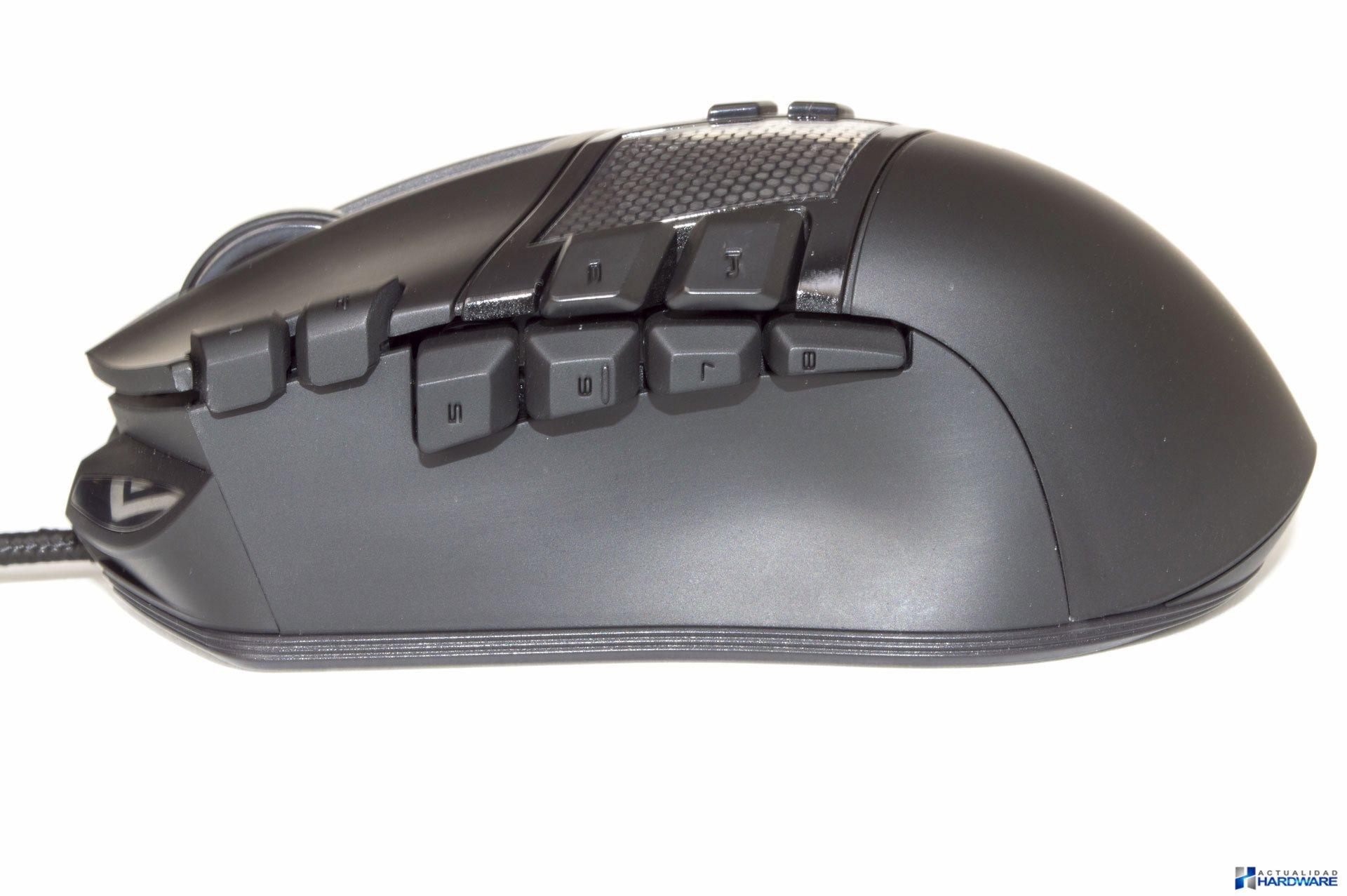 En su lado derecho incluye ocho botones configurables todos ellos y que cuentan con un gran tacto y suavidad de pulsación, están perfectamente numerados del uno al ocho contando el número seis con una muesca para conocer en todo momento la situación de los mismos tal y como ocurre en los teclados. En su parte superior cuenta con los clásicos botones click derecho/izquierda y rueda de desplazamiento, todos ellos con un gran tacto y suavidad de pulsación como los anteriormente comentados. Debemos comentar que la rueda de desplazamiento o scroll tiene un tacto liso y gomoso que además de muy suave es realmente silenciosa. Justo encima del ratón en su parte central se encuentran los botones de ajustes de dpi mediante los cuales podremos aumentar o disminuir los mismos on-the-flay (al vuelo) y al lado de éstos se encuentra un sistema de indicadores led a través de los cuales podemos visualizar la sensibilidad que tengamos seleccionada en cada momento, siendo ajustable mediante su software. Dispone además de tres ranuras que a parte de proporcionar un mejor diseño al ratón mejora la refrigeración del mismo. Como podemos ver en las imágenes dispone en su parte superior de un panel con diseño de nido de abeja y en su lateral derecho con la palabra «THUNDER» una ventana a través de lo7s cuales podemos ver su interior consistente en la imitación de un motor de un super-deportivo. En su parte derecha dispone de otro botón programable y como el resto de ellos muy agradable al tacto.