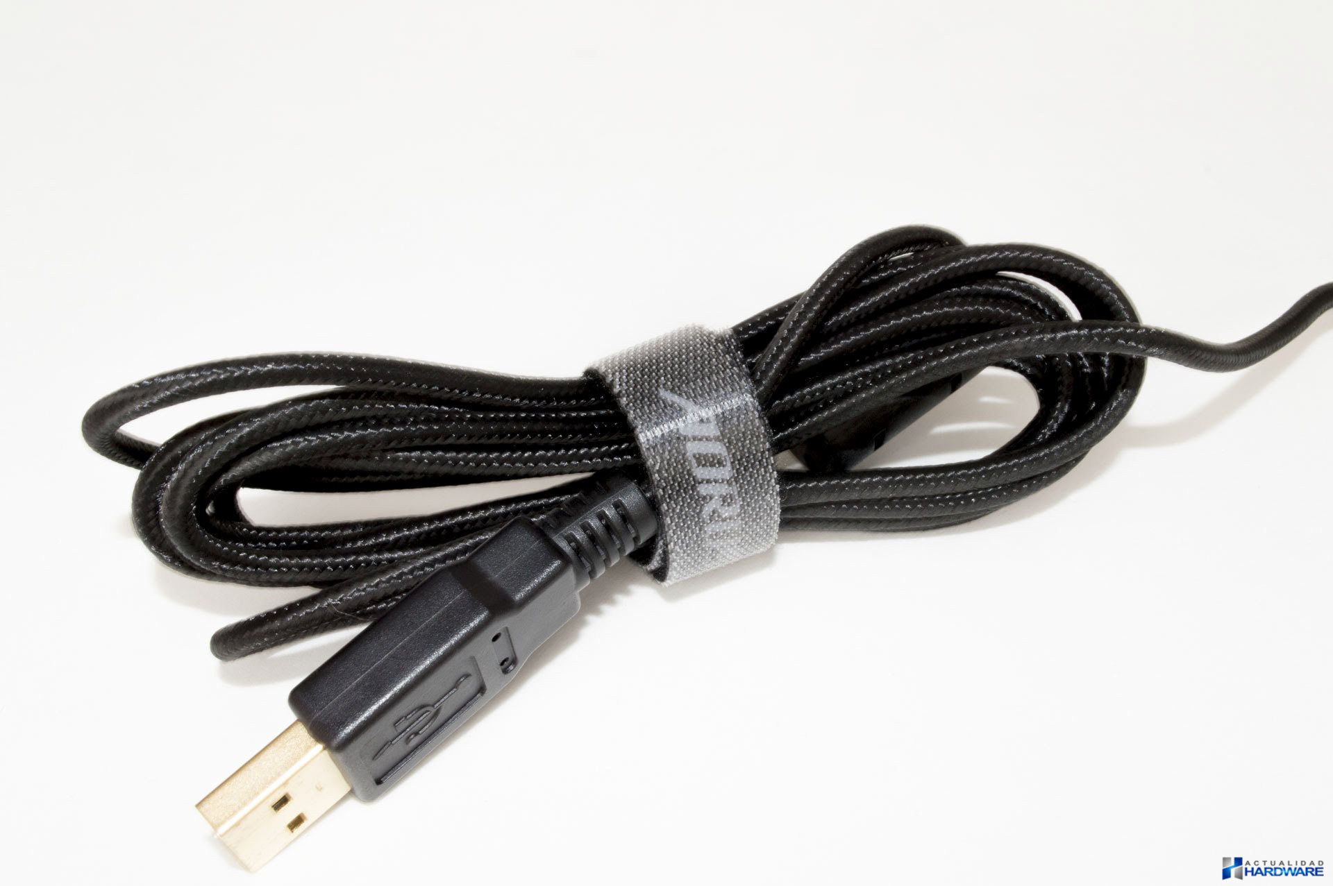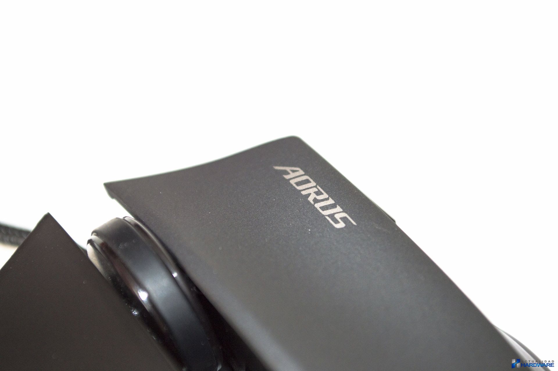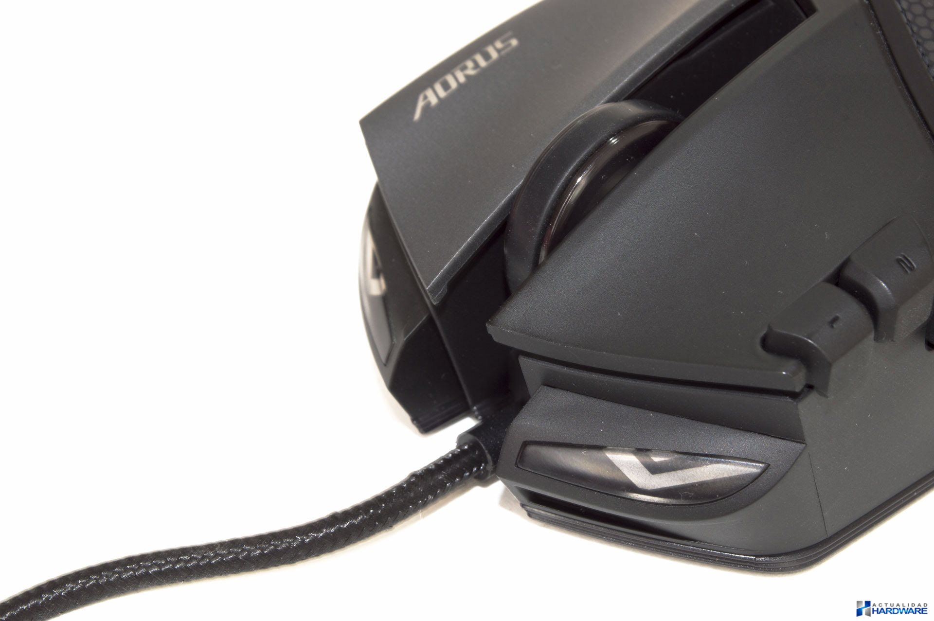 En su parte delantera dispone de dos zonas iluminables que nos recuerdan a los faros de un super-deportivo y que las veremos iluminadas más adelante. Incluye un cable mallado en nylon de color negro con una longitud de 1.8 metros y un conector bañado en oro para una mejor conectividad y resistencia al óxido. El mismo incluye una tira de belcro realmente útil para tener el cable siempre ordenado en todo momento. Como vemos en las imágenes el AORUS THUNDER M7 cuenta con un excelente diseño Gaming además de una gran construcción y terminación.