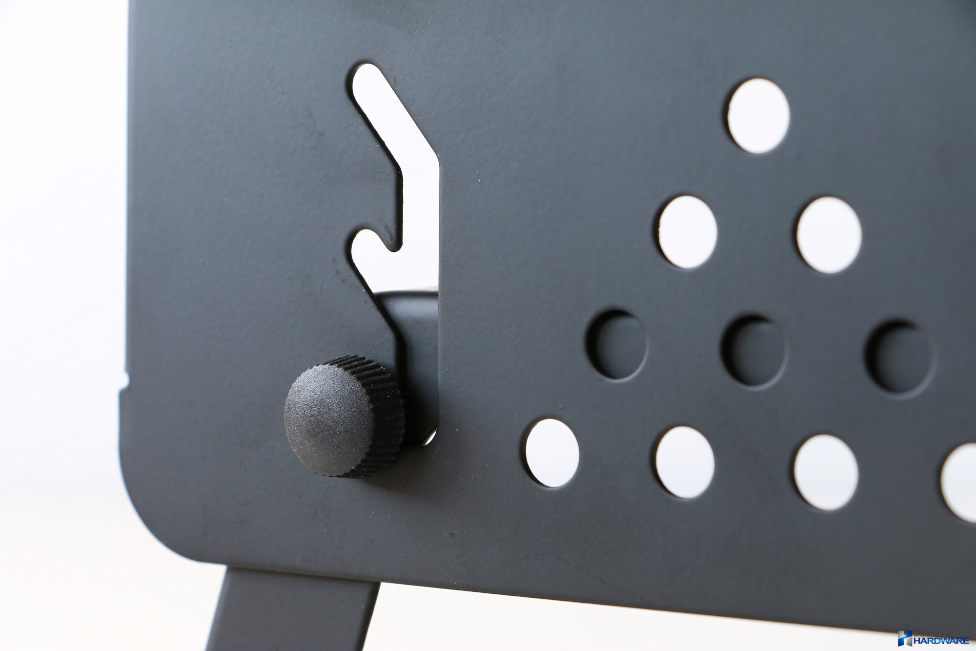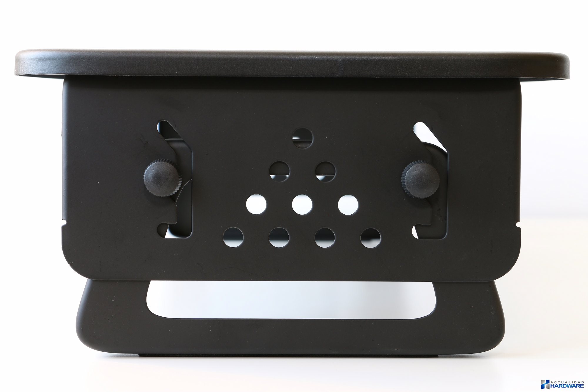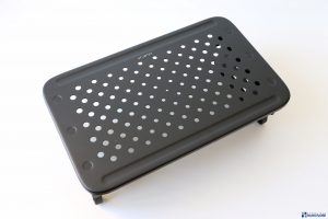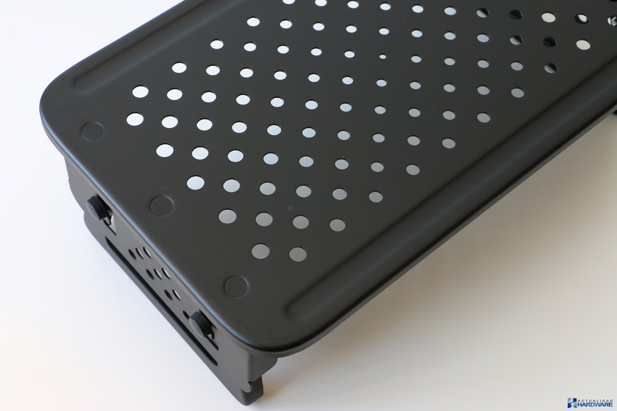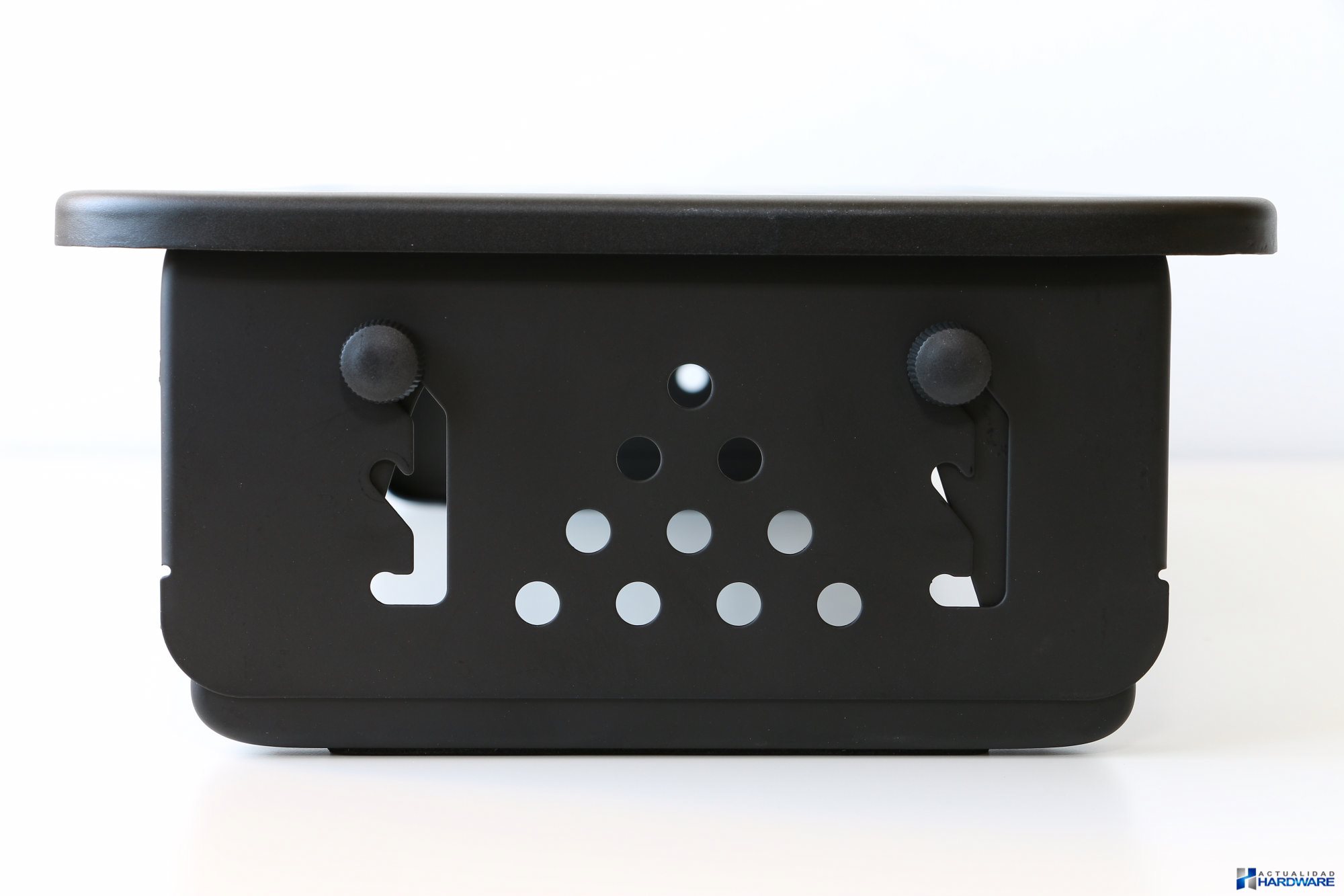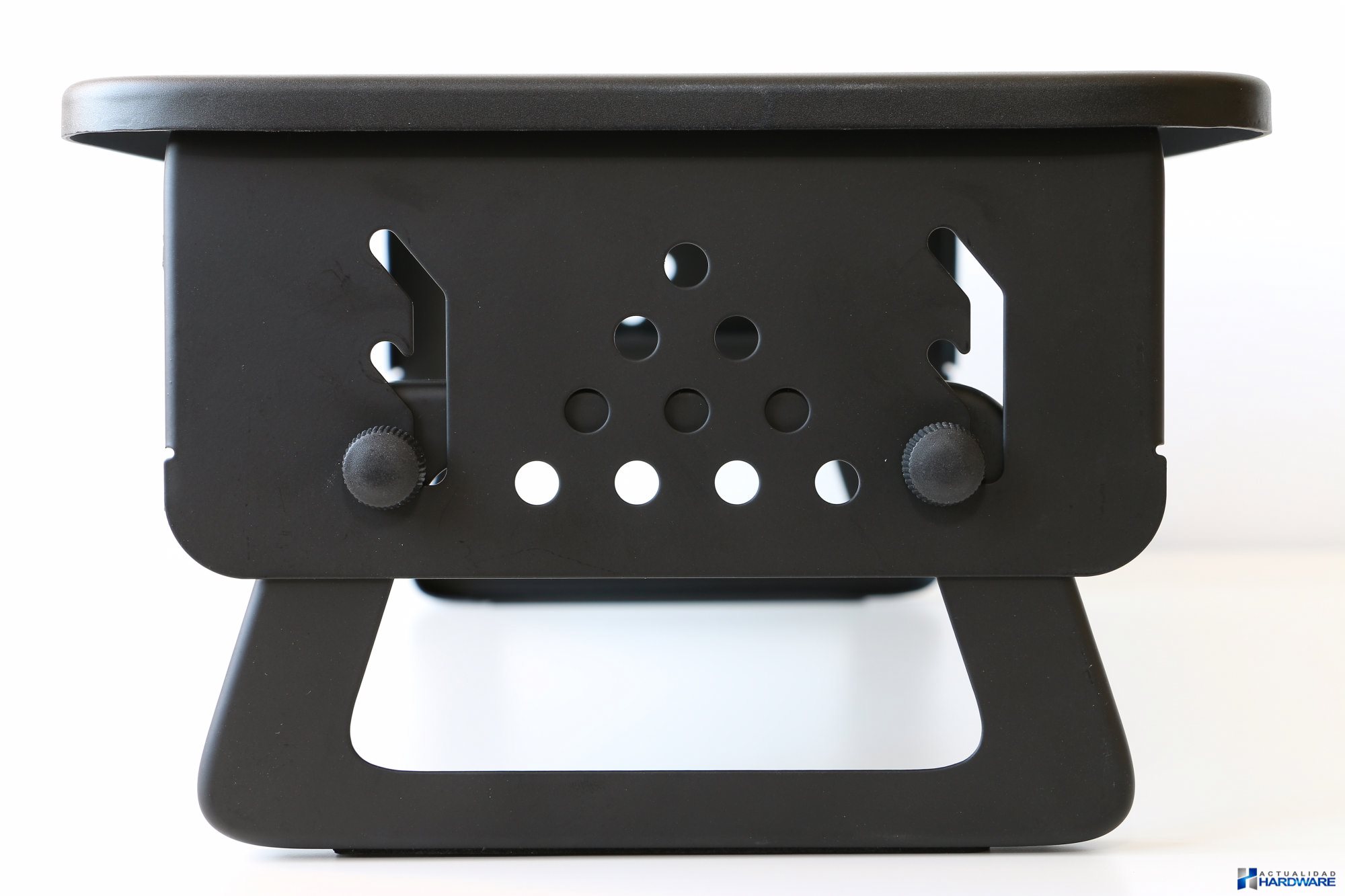 La base se encuentra perforada al igual que las patas, dichas perforaciones a la vez que reducen el peso del conjunto hace que la refrigeración mejore si colocamos un portátil sobre el mismo. El soporte es ajustable en tres alturas lo que nos permite colocarlo a nuestro gusto. Cuenta con unas dimensiones de 37x23x14cm y un peso de 2.2kg, siendo al mismo tiempo capaz de soporta hasta 16kg de peso.