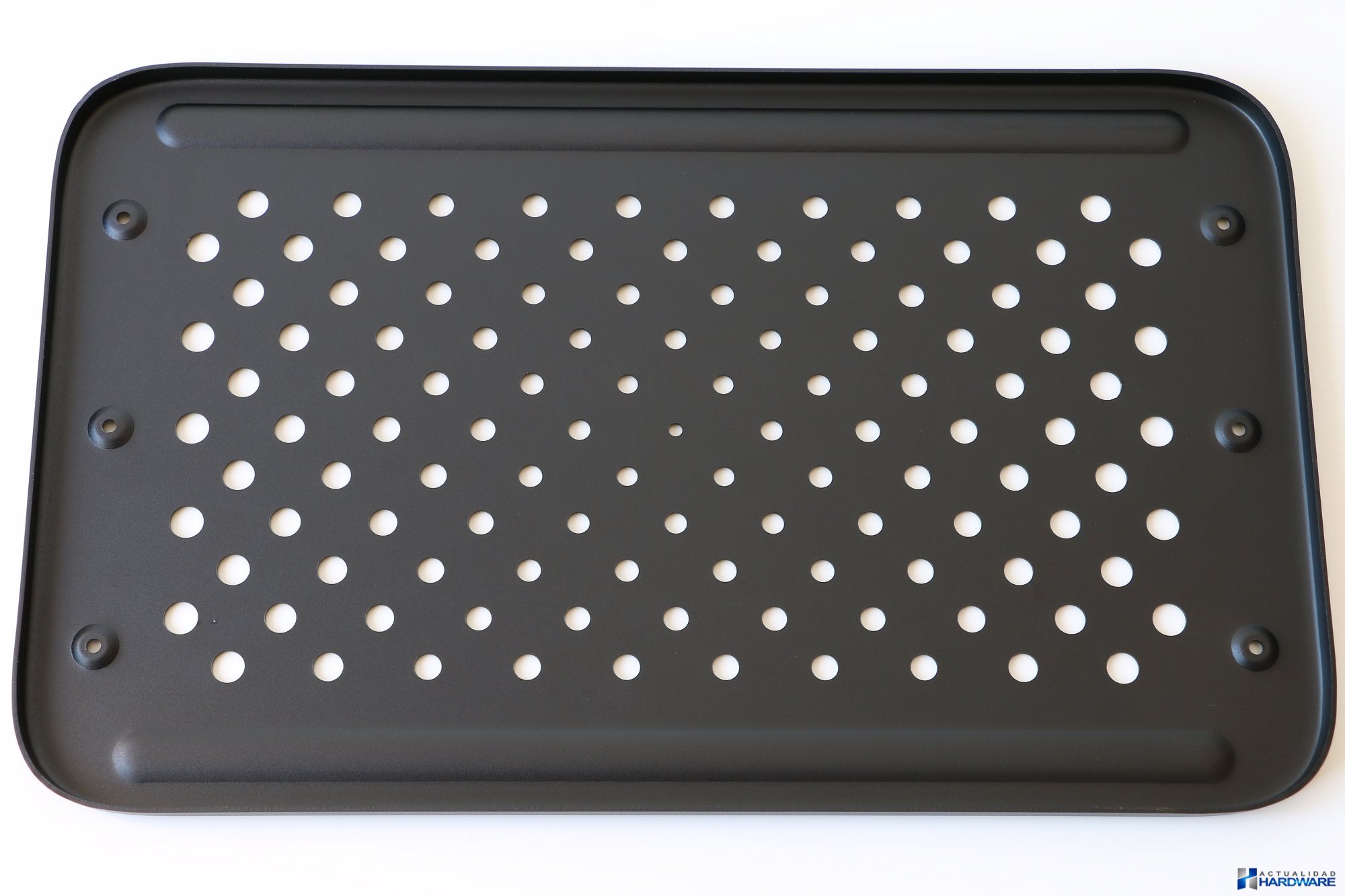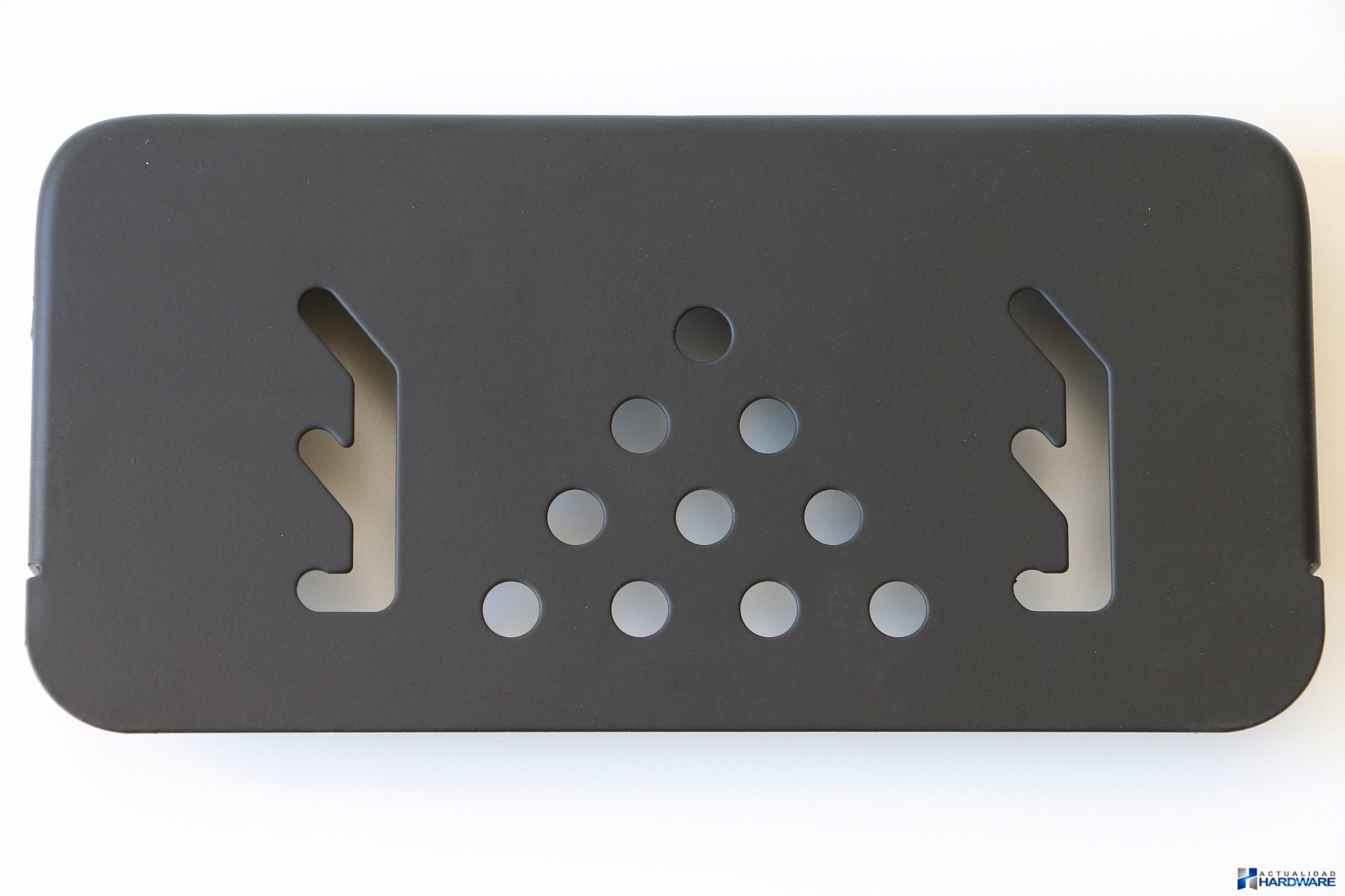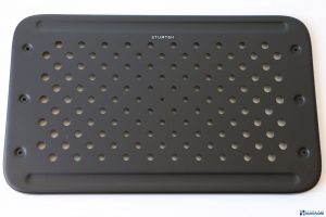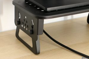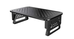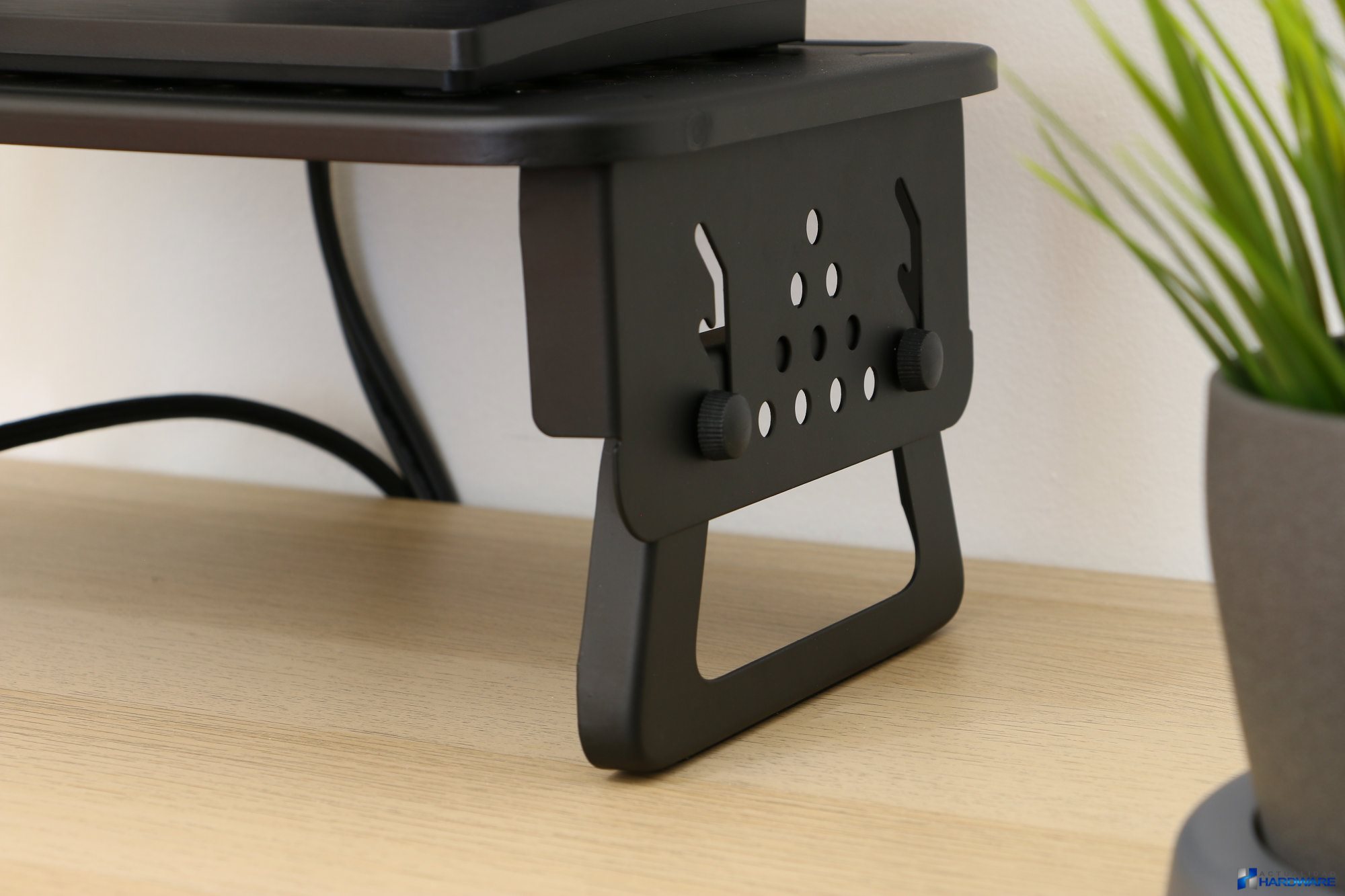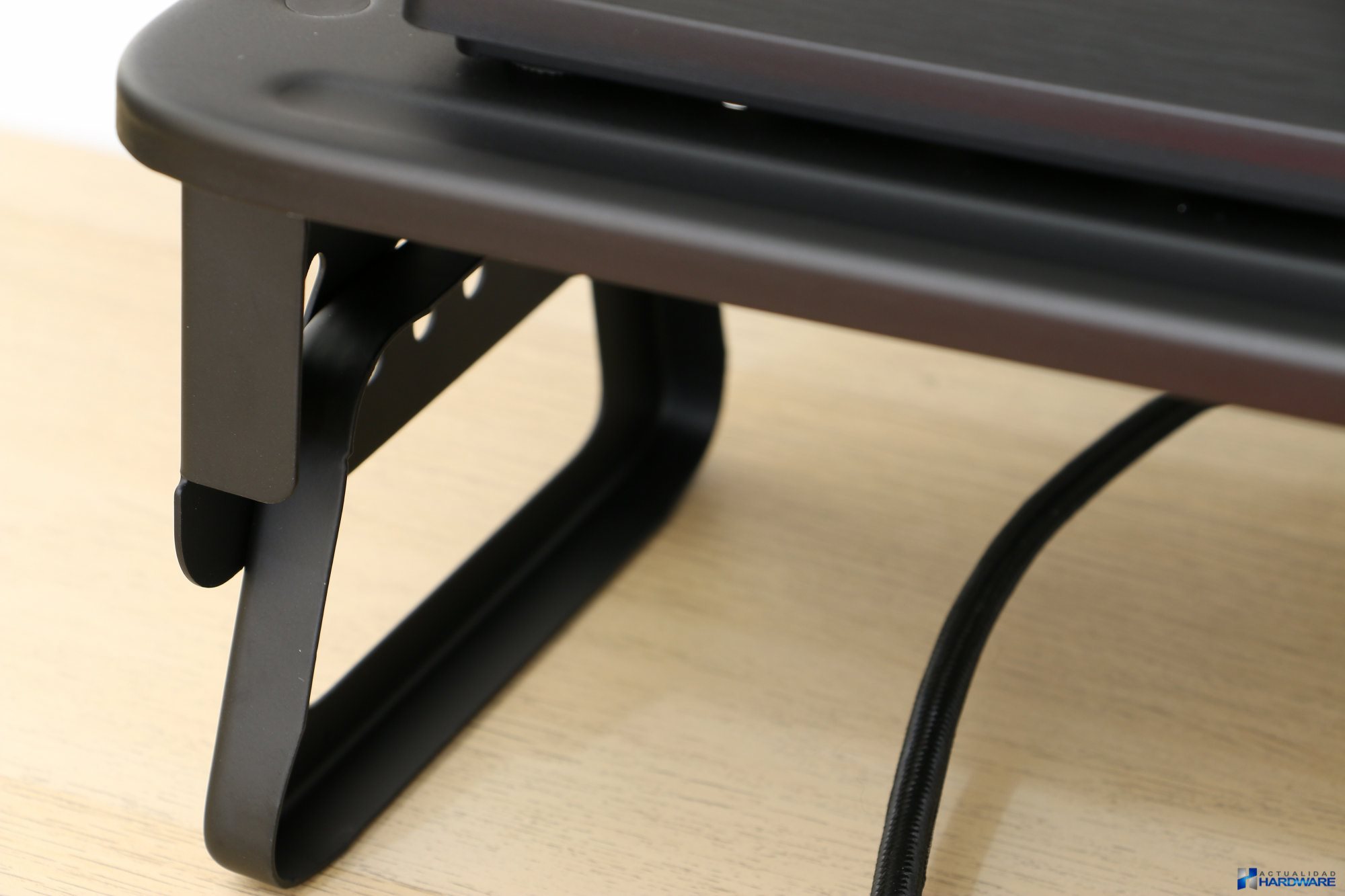 La base se encuentra perforada al igual que las patas, dichas perforaciones a la vez que reducen el peso del conjunto hace que la refrigeración mejore si colocamos un portátil sobre el mismo. El soporte es ajustable en tres alturas lo que nos permite colocarlo a nuestro gusto. Cuenta con unas dimensiones de 37x23x14cm y un peso de 2.2kg, siendo al mismo tiempo capaz de soporta hasta 16kg de peso.