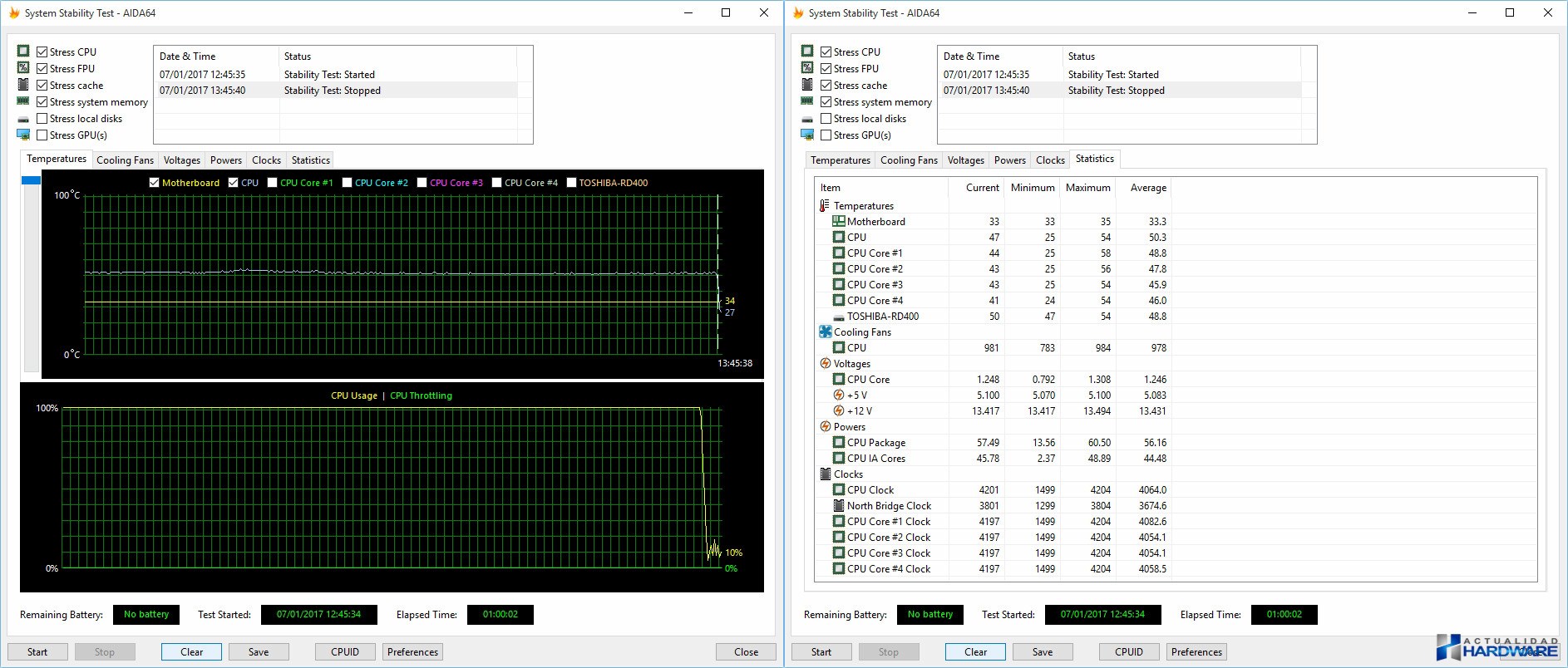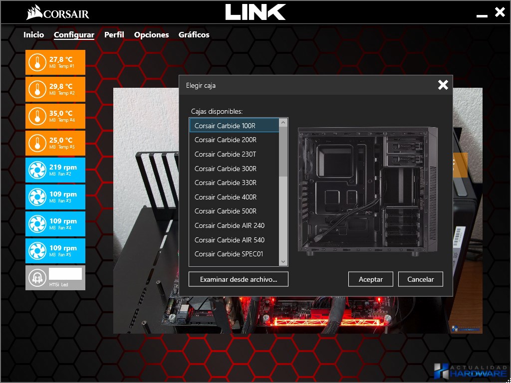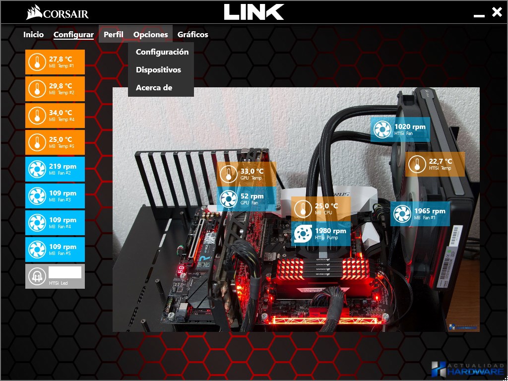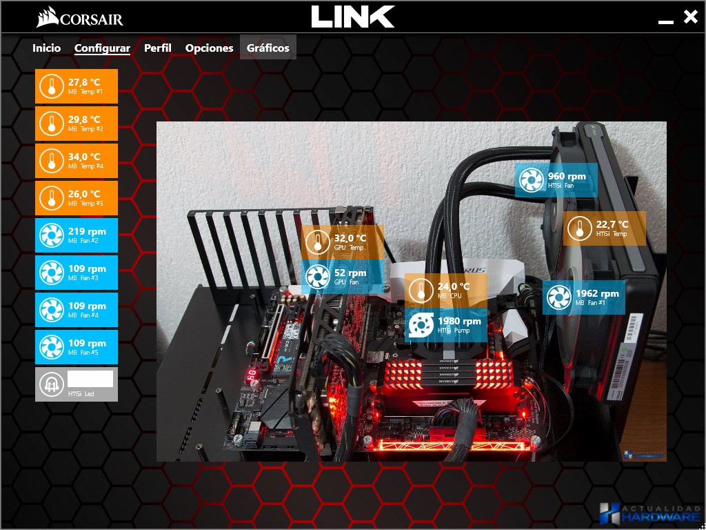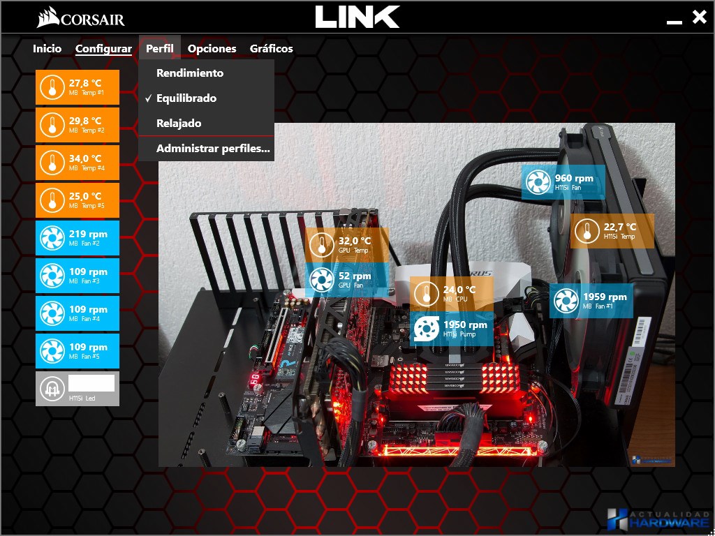 | Para testear el rendimiento del HYDRO SERIES 115i de CORSAIR, hemos utilizado la aplicación AIDA64 con su «System Stability Test» a través del cuál y tras poner nuestra sistema a pleno rendimiento podremos conocer el rendimiento del kit de refrigeración líquida objeto de nuestro review. Para ello y tras someterlo durante una hora a dicho test de estrés, ha mostrado unas muy buenas temperaturas de funcionamiento, todo ello sobre una GIGABYTE AORUS Z270X-GAMING 5, un INTEL CORE i5-7600K y unas CORSAIR VENGEANCE LED DDR4 3200MHz 32GB (4x8GB). En concreto hemos conseguido unas temperaturas en idle de 25ºC y 58ºC en full, buenísimas cifras las que ha podido conseguir, lo que nos indica que estamos ante un muy buen kit de refrigeración líquida. En cuanto a su sonoridad podemos indicar que es realmente buena, tanto la bomba como sus ventiladores. En cuanto a éstos últimos indicar que a bajas revoluciones no suenan nada, a medias suenan muy poco pero a full ya son algo más ruidosos, pero os podemos indicar que si los mantenemos a su velocidad intermedia mediante el software incluido y del que hablaremos a continuación, las temperaturas que podemos conseguir son muy buenas tal y como os hemos comentado anteriormente, donde los resultados obtenidos han sido en el rango de revoluciones medias. A través de software CORSAIR LINK podemos configurar diferentes parámetros de nuestro HYDRO SERIES 115i, el cual se organiza y divide en diferentes pestañas. En la primera de ellas denominada «Inicio», tendremos disponibles las temperaturas y revoluciones de todos los componentes de nuestro equipo, incluido lógicamente los del H115I. En «Configurar» podemos seleccionar un modelo de torre de CORSAIR o seleccionar la nuestra mediante una imagen, tal y como nosotros hemos hecho con una foto de nuestra benchtable, en este caso podemos además ubicar cada unos de los componentes y su correspondientes temperaturas/revoluciones de funcionamiento. En la pestaña «Perfil», tenemos la posibilidad de seleccionar si deseamos que el HIDRO SERIES se comporte con un rendimiento en modo «Relajado», «Equilibrado» o «Rendimiento», en nuestro caso y en las pruebas realizadas hemos seleccionado el modo por defecto «Equilibrado», que ofrece el mejor equilibrio entre rendimiento y sonoridad de funcionamiento. Además tenemos la opción de crearnos un perfil a nuestro gusto y según nuestras preferencias. En la pestaña «Opciones», podemos configurar diferentes aspectos del kit tal y como podemos ver en las imágenes. Y por último en «Gráficos», tal y como indica podemos ver en forma gráfica la evolución de las temperaturas de los diferentes componentes de nuestro PC. Un aspecto interesante y que podemos configurar es la iluminación RGB del bloque, ya que este aunque de forma predeterminada se ilumina en color blanco, podemos hacer que en función de las lecturas de temperaturas, cambie su iluminación al color que deseemos para de este modo podamos conocer en todo momento con solo mirar el bloque, la temperatura de funcionamiento que tiene nuestro equipo en cualquier momento. En definitiva un buen software para configurar y monitorizar las temperaturas de funcionamiento de nuestro equipo, todo ello de una manera fácil y con la potencia que nos ofrece la aplicación CORSAIR LINK. | ||