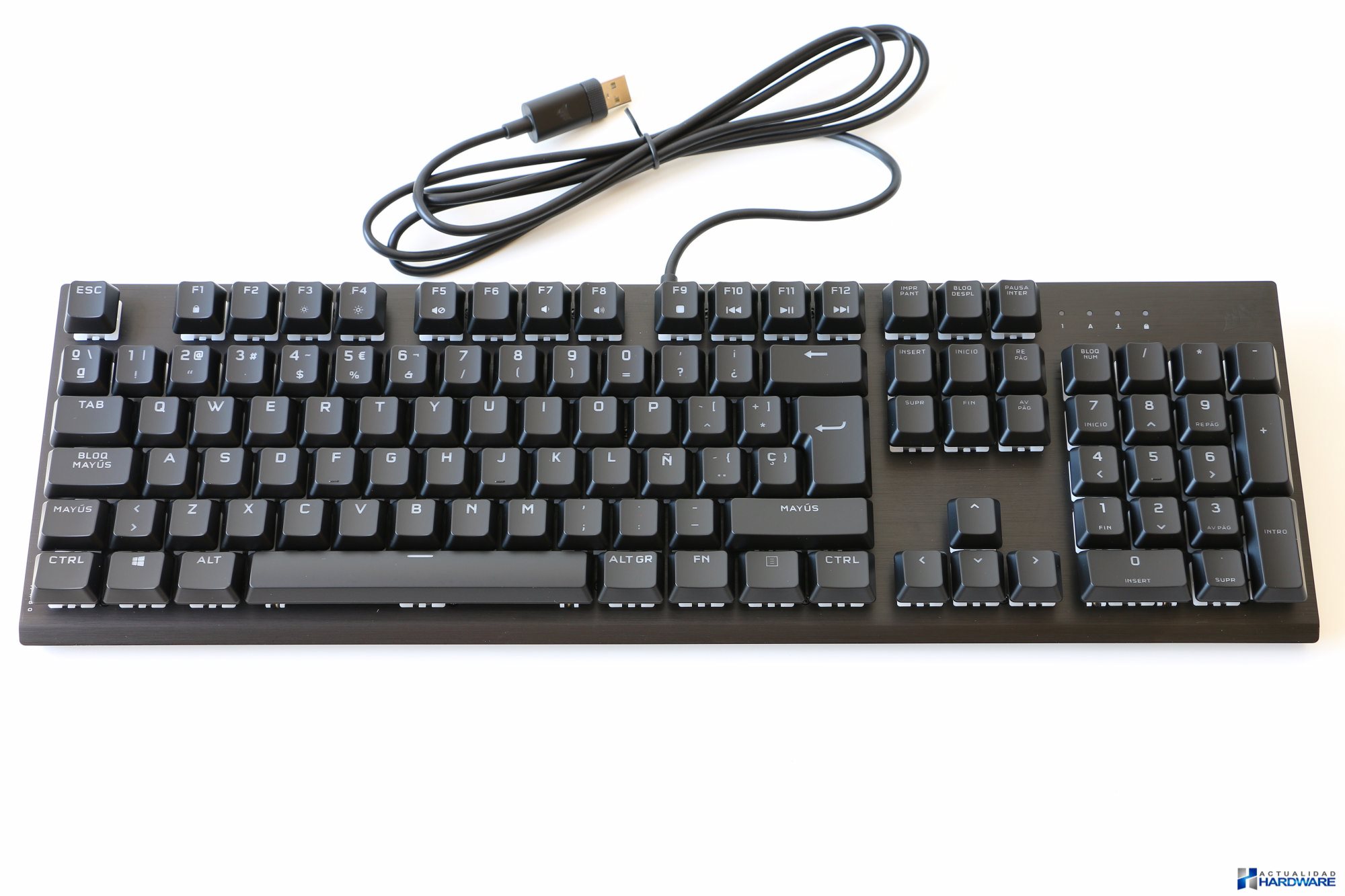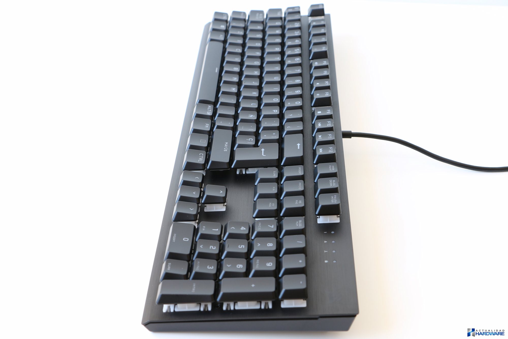 Como podemos ver en las diferentes imágenes el CORSAIR K60 RGB PRO cuenta distribución/layout “QWERTY”, “Español – ISO”, es decir, incluyela tecla “ñ” y “Enter” doble. En su parte superior derecha junto al logo de Corsair se encuentran los indicadores de bloqueo de mayúsculas, numérico y de desplazamiento. Las teclas se encuentran fabricadas en plástico ABS de bajo perfil de buena calidad y durabilidad. En su reverso además de la etiqueta del producto se incluyen cinco surfers/almohadillas de goma de generosas dimensiones además de dos patas elevadoras con las que podremos configurar al altura de teclado a nuestro gusto. No incluye reposamuñecas pero si que vemos dos orificios encargados de poder albergarlo en un futuro como en la versión SE del mismo. El cableUSB que incluye no se encuentra mallado simplemente cuenta con un recubrimiento gomoso, contando el mismo con un buen grosor, rigidez y longitud, concretamente de 182cm, contando en su extremo con un conector USB 3.0 Type-A.