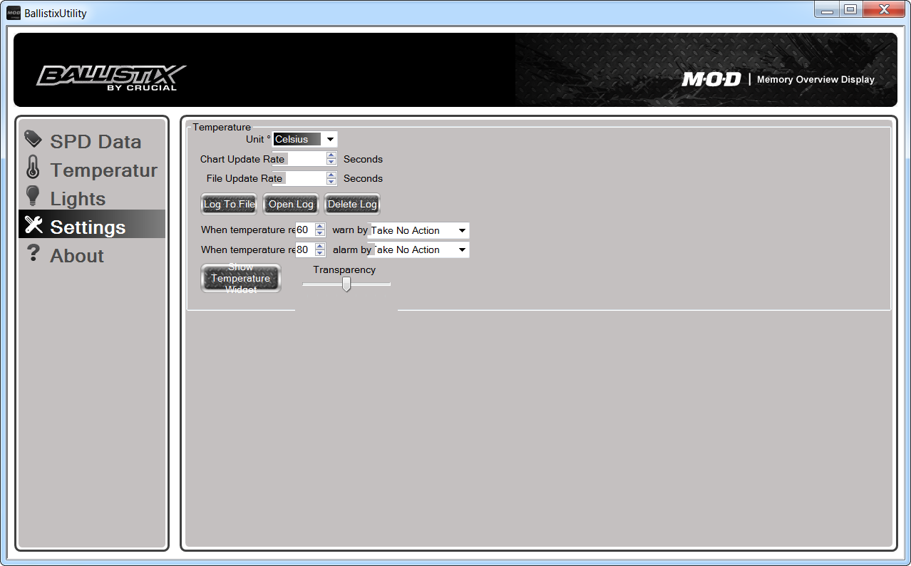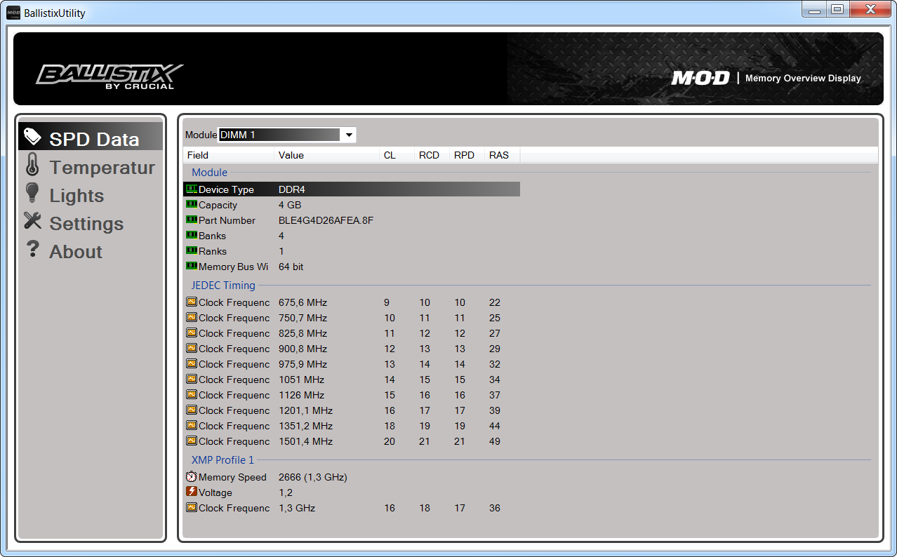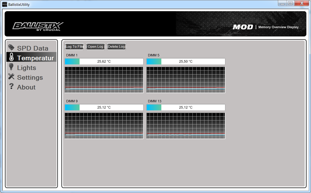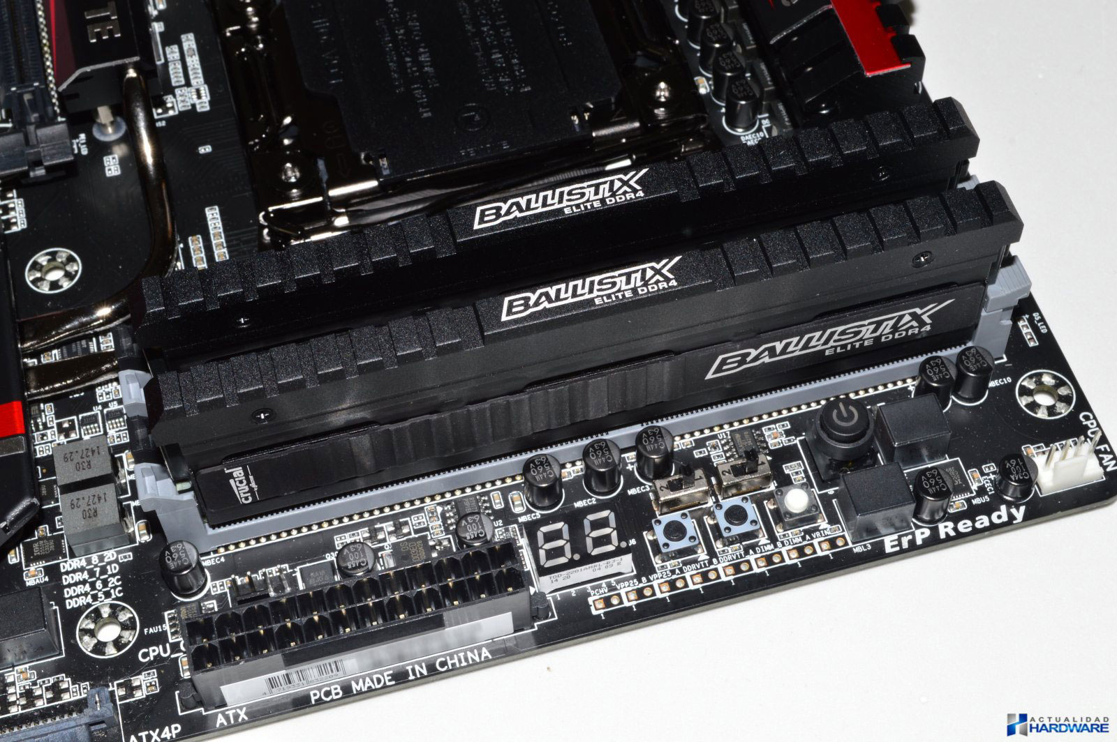| Para las pruebas hemos utilizado una placa base Gigabyte X99 Gaming G1 Wi-Fi junto con un disipador Noctua NH-D15 y hemos de comentar que la instalación de las Ballistix Elite ha sido perfecta ya que la altura de sus disipadores no es excesiva, siendo la altura total de cada módulo de 4cm, por lo que en ningún momento rozan con el disipador utilizado. Una vez realizada la instalación de las memorias sobre la placa base utilizada podemos decir que le aportan un gran aspecto al conjunto. A través de la aplicacion Ballistix M.O.D | Memory Overview Display es posible monitorizar las temperaturas de cada módulo individualmente en tiempo real, realmente útil para tener en todo momento controladas las temperaturas de trabajo de los mismos. Además nos muestra información de timmings y voltajes tanto de JEDEC como de XMP. Una opción que puede resultar interesante es la opción que nos ofrece esta aplicación de poder tener un widget en el que poder visualizar de una manera directa las temperaturas de trabajo de nuestras memorias. Si tuvieramos en nuestras manos los módulos de la serie Ballistix Tactical Tracer podríamos configurar la iluminación de los mismos a través de dicha aplicación, opción no disponible para los Ballistix Elite ya que éstos no disponen de iluminación led. | ||