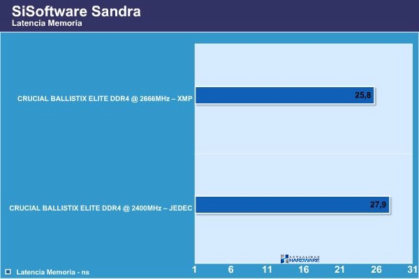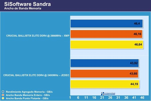 | Para testear las BALLISTIX ELITE hemos optado por utilizar tanto la configuración JEDEC (2400MHz) como en XMP 2.0 (2666MHz) bajo el mismo software de testeo, todo ello para medir el rendimiento real de este kit Quad Channel. Lo hemos conectado a nuestro equipo de pruebas en el que hemos utilizado una placa base Gigabyte X99 Gaming G1 WIFI acompañada de un Intel Core i7 5820k . El micro lo hemos mantenido a su velocidad de stock con el modo turbo activado así como las memorias que han sido testeadas también a dicha velocidad. Tras realizar dichas pruebas y como podemos ver en las diferentes gráficas de rendimiento podemos decir que su performance es muy bueno. La diferencia entre utilizar los módulos bajo JEDEC a 2400MHz y XMP 2.0 a 2666MHz es notable como vemos en los resultados obtenido bajo diferentes pruebas. Por comentar algunos resultados podemos decir que el rendimiento en aida64 (lectura/escritura/copia/latencia) bajo JEDEC ha sido de 46116MB/s, 46799MB/s, 50579MB/s y una latencia de 69.9ns, son unas buenas cifras pero se han visto superadas cuando activamos el perfil Intel XMP 2.0, consiguiendo unas cifras de 48653MB/s, 46893MB/s, 53760MB/s con una latencia de 64.9ns. El resultado obtenido en el resto de pruebas se ha mantenido destacando que bajo el perfil Intel XMP 2.0 las mismas se autoconfiguran a una velocidad de 2666MB/s consiguiendo por tanto un gran rendimiento en relación con la configuración de componentes que hemos utilizado para este review y que mediante la unión de todos ellos hemos conseguido un equipo Gaming de gran rendimiento con los últimos componentes del mercado bajo la plataforma X99 LGA2011-3. A través de la aplicación Ballistix M.O.D | Memory Overview Display hemos podido conocer que la temperatura de trabajo en idle que ha sido de unos 25ºC y a full de 31ºC, cifras que no hacen más que confirmar que estamos ante un kit Quad Channel de gran calidad, obteniendo unas grandes temperaturas de trabajo. | ||