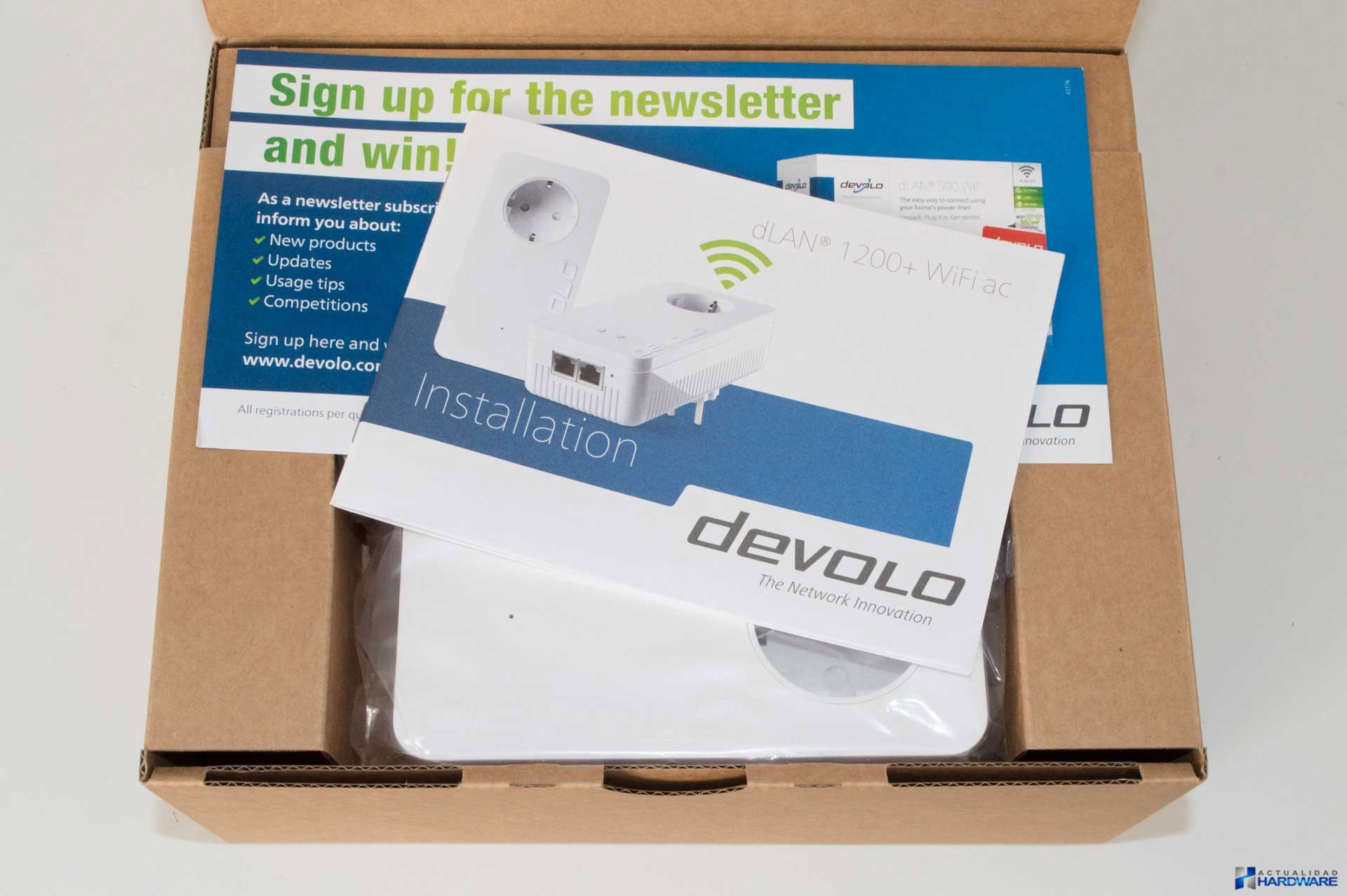 El DEVOLO DLAN 1200+ WiFi AC STARTER KIT se presenta en un caja de cartón blanca donde a lo largo y ancho de la misma se muestra información muy detallada y gráfica acerca de sus características y especificaciones, todo ello en perfecto español, las cuales las iremos comentado a lo largo del review. Una vez abierto su embalaje vemos que todo viene perfectamente embalado y protegido dentro de una caja de cartón marrón. Como accesorios se incluye una guía de instalación rápida y un cable de red Ethernet CAT5e.