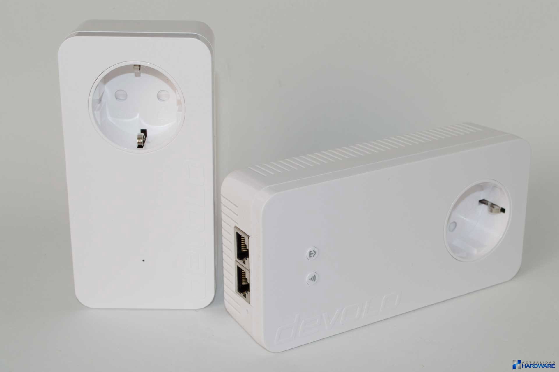 El DEVOLO DLAN 1200+ WiFi AC STARTER KIT es un kit PLC con conectividad Ethernet 10/100/1000 Mbps, powerline 200/500/600/1200 Mbps (gracias a la tecnología MIMO con hasta 1,2 gigabits por segundo) y Wi-Fi de doble banda 2,4 GHz a 300mbps y 5 GHz a 867 mbps. La funcionalidad Powerline tiene un rango de alcance de 400 metros y la Wi-Fi de 300 metros por lo que tendremos una amplia cobertura. El adaptador dLAN 1200+ ac (el más grande) cuenta con cuatro antenas gracias a las cuales tendremos la posibilidad de contar con conectividad Wi-Fi en ambas bandas simultaneamente. Una vez puestos los DEVOLO sobre nuestra mesa de trabajo damos cuenta del excelente diseño y construcción, estando los mismos construidos en un robusto plástico de color blanco glaciar. Este pack de PLC cuenta con dos adaptadores, el dLAN 1200+ (el más pequeño) es el que conectaremos a nuestro router mediante cable Ethernet y el dLAN 1200+ ac (el más grande) es el encargado de proporcionarnos conectividad a través de un cable Ethernet o Wi-Fi. Como podemos ver en las diferentes imágenes cuentan con un diseño minimalista realmente atractivo y que una vez enchufados no desentonarán con nada en la estancia donde lo coloquemos, es más, una vez colocados quedan realmente bien aportando un toque de diseño que nunca viene mal.