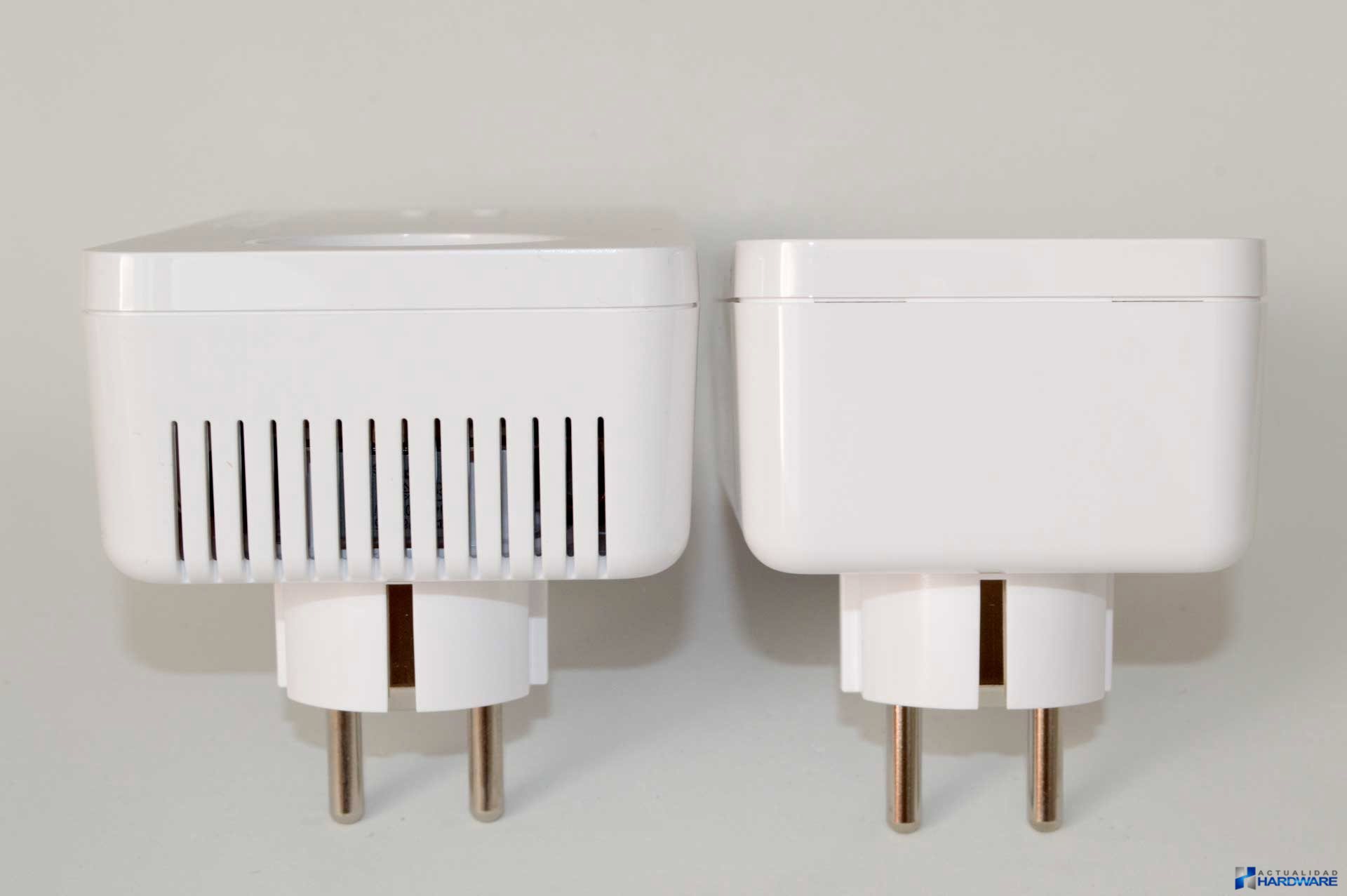 Ambos adaptadores incluyen un conector de enchufe hembra en la que podremos enchufar otros dispositivos y de esta manera no desperdiciaremos un enchufe de nuestro hogar. El adaptador dLAN 1200+ (el más pequeño) en su parte frontal únicamente dispone de un enchufe de toma de corriente y de un Led de encendido/actividad, en su parte inferior cuenta con un conector Ethernet 10/100/1000 Mbps y en su lateral derecho dispone de un botón de sincronización con el otro PLC. El adaptador dLAN 1200+ ac (el más grande) en su parte frontal dispone de un enchufe de toma de corriente, y de botones con iluminación Leds que indican el encendido y la actividad Wi-Fi, y en su parte inferior cuenta con dos puertos Ethernet 10/100/1000 Mbps. Ambos adapadores en su parte trasera incluyen los enchufes de conexión a la red eléctrica así como la etiqueta de producto con información de los mismos en cuanto a direcciones MAC de los adaptadores tanto Ethernet como Wi-Fi e información acerca de la máxima potencia de los dispositivos que podemos conectar a los mismos, siendo la misma de un máximo de 3600W. El adaptador dLAN 1200+ ac incluye a lo largo de sus laterales de ranuras encargadas de refrigerar el interior del mismo ya que incluye conectividad Wi-Fi por lo que es necesario un extra en refrigeración.