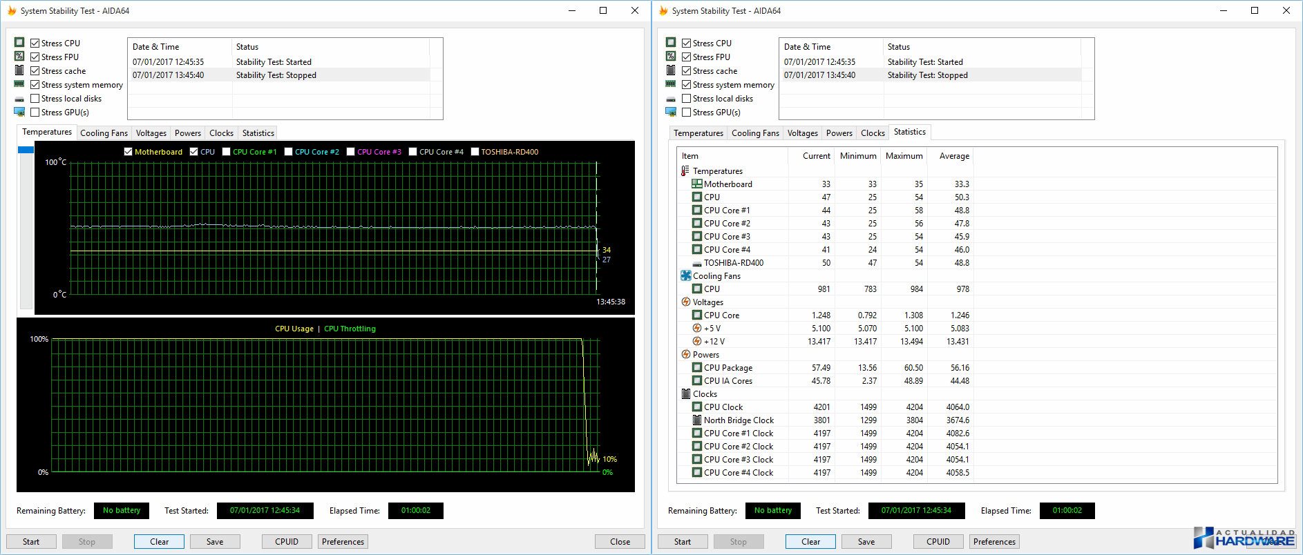 Para testear la nueva GIGABYTE AORUS Z270X-GAMING 5, hemos instalado sobre ella el nuevo Intel Core i5-7600K Kaby Lake junto con las memorias Corsair Vengeance Led DDR4 32GB a 3200Mhz, la tarjeta gráfica Gigabyte Radeon R9 280 OC, el kit de refrigeración líquida Corsair Hydro Series H115i 280mm, el MVMe M.2 Toshiba OCZ RD400 de 480GB y la fuente de alimentación Antec High Current Pro 1300W Platinum, todo ello montado sobre la benchtable de Phobya. Esta configuración es realmente interesante por su relación calidad/precio y rendimiento como hemos podido conocer de primera en este review. Primeramente bajo Cpu-z hemos podido conocer que las especificaciones tanto de la placa base como de la Cpu utilizados, son coincidentes con las facilitadas por los respectivos fabricantes. El performance obtenido bajo el software Aida64 tanto en ancho de banda como en latencia ha sido muy bueno, tal y como podemos ver en las capturas, aunque no difieren en exceso a los resultados obtenidos bajo la anterior plataforma, podemos decir que son algo mejores. Tanto en Cinebench como en wPrime, el rendimiento obtenido ha sido también satisfactorio. Para comprobar hasta donde podíamos llegar en cuanto a OC, hemos optado a realizarlo bajo la aplicación EastyTune en modo automático, donde en tal solo un click de ratón y esperar un par de minutos, hemos podido subir la frecuencia del i5-7600K hasta los 4.8GHz, aunque con un voltaje de 1.344v, siendo éste algo más elevado que si hubiese sido un OC manual, pero por lo demás ha sido un juego de niños subirlo hasta esa frecuencia,lo que nos dice que estamos ante una placa base con grandes opciones y posibilidades de OC. El rendimiento del NVMe ha sido excelente consiguiendo unas grandes cifras, concretamente bajo CrystalDiskMark,2.582MB/s en lectura y 1.440MB/s en escritura, que hace que nuestro sistema vuele. En definitiva el conjunto se ha mostrado realmente establey con buenas temperaturas de funcionamiento, del que podemos destacar que la GIGABYTE AORUS Z270X-GAMING 5 se ha comportado de forma estupenda, siendo una placa base realmente interesante si necesitamos montarnos un equipo de altas prestaciones.