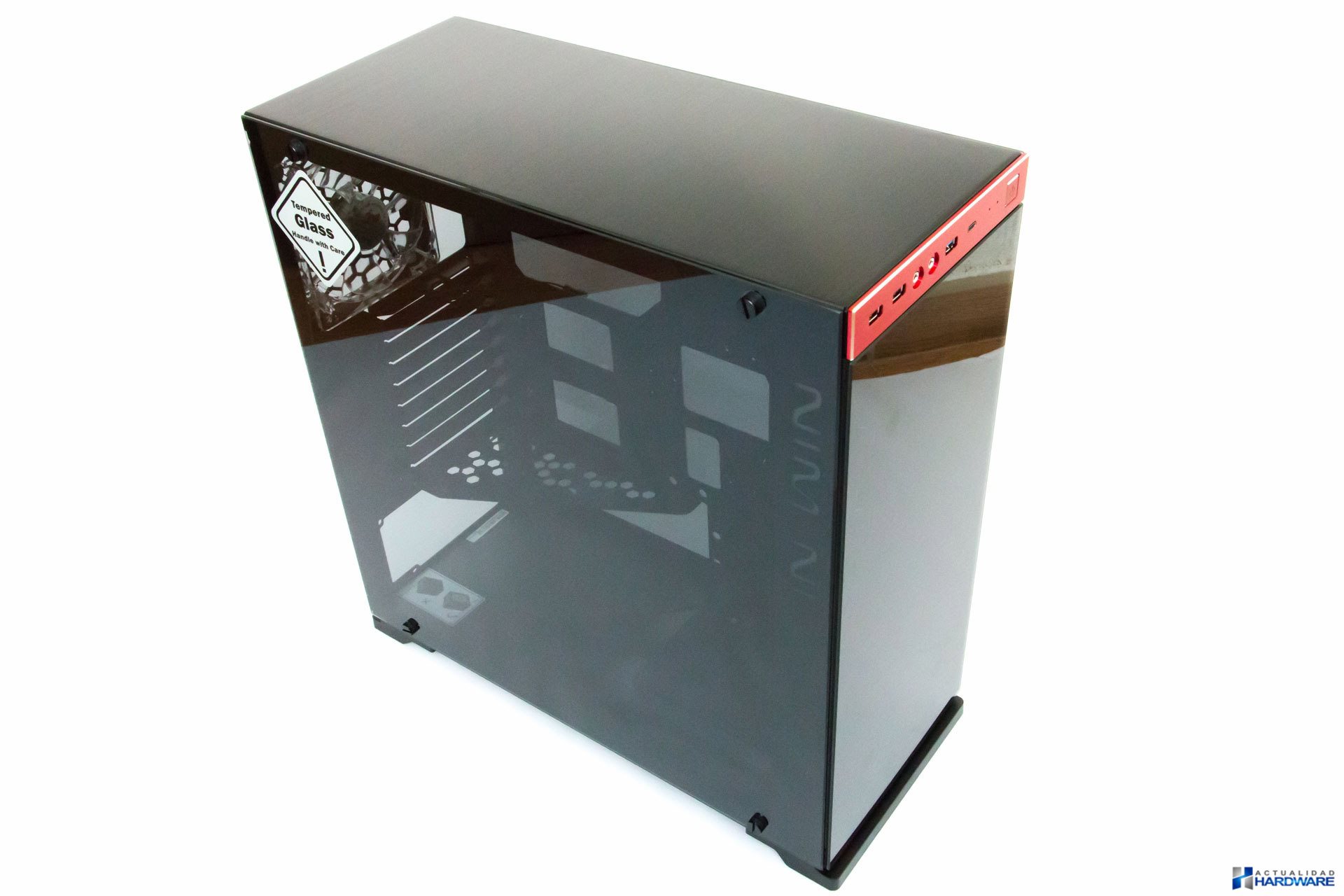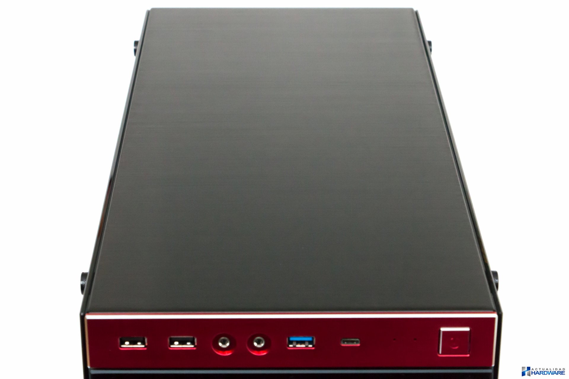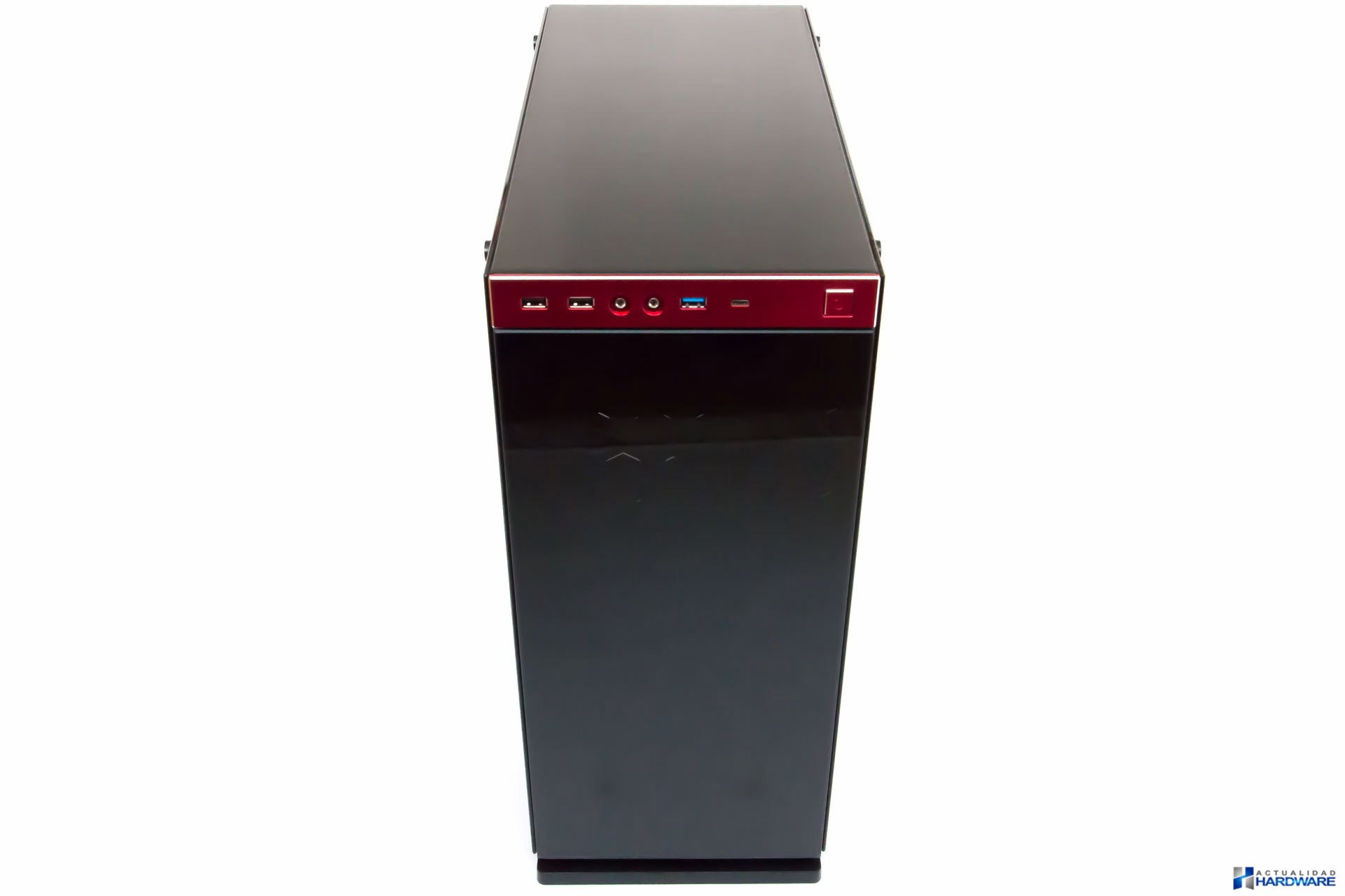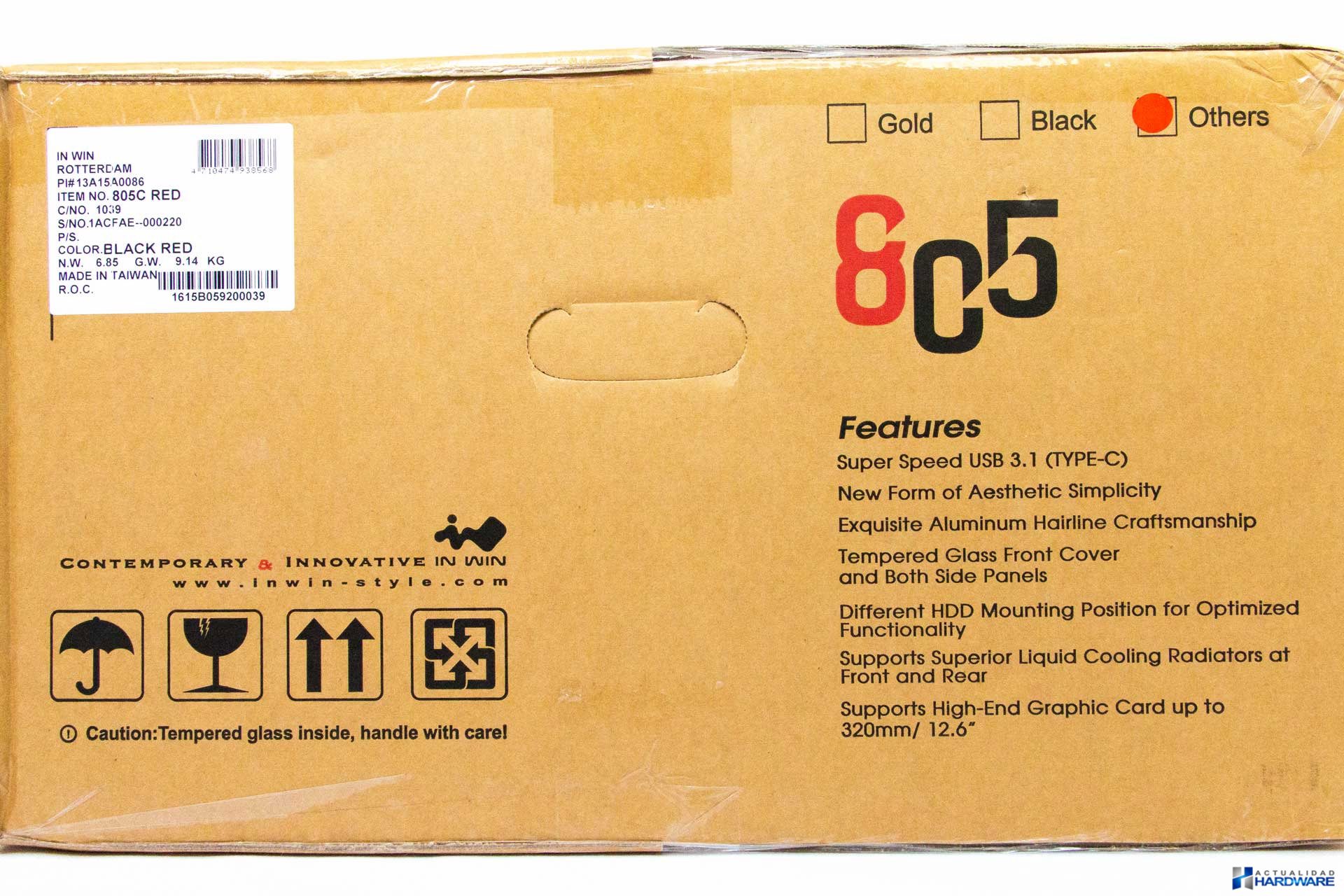 Nada más sacada la IN WIN 805 de su embalaje y situada sobre nuestra mesa de trabajo damos cuenta del excelente diseño y construcción de la misma. La IN WIN 805 es una Mid-Tower compatible con los formatos de placa base ATX, Micro-ATX y Mini-ITX. Hemos recibido la IN WIN 805 en la combinación de colores negro-rojo pero también existen varias combinaciones, concretamente en negro-negro y negro-oro. La IN WIN 805 se encuentra totalmente construida en aluminio de calidad, estando el mismo en su parte exterior cepillado, que le aporta un gran aspecto al conjunto. La misma incluye paneles construidos en vidrio templado tal y como veremos más adelante en detalle. La 805 cuenta con unas dimensiones de 476 x 205 x 455mm y un peso aproximado de 7kg. En la parte superior de su frontal se encuentra un panel construido en aluminiocepillado de color rojo y que alberga en este orden: 2x USB 2.0, 2x conectores audio HD, 1x USB 3.0, 1x USB 3.1 Type-C, 1x Led «Power», 1x Led HD y 1x botón «Power». La IN WIN no incorpora ningún hueco para unidades de 5.25″ en su frontal y bajo nuestra opinión cada vez son menos necesarias el uso de este tipo de unidades. El frontal cuenta con una lámina de vidrio templado al igual que sus paneles laterales que se encuentran construidos bajo el mismo material.