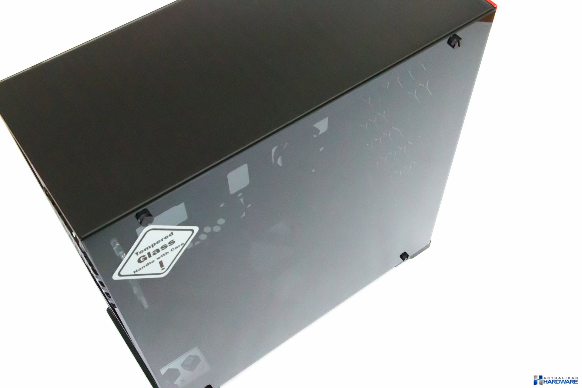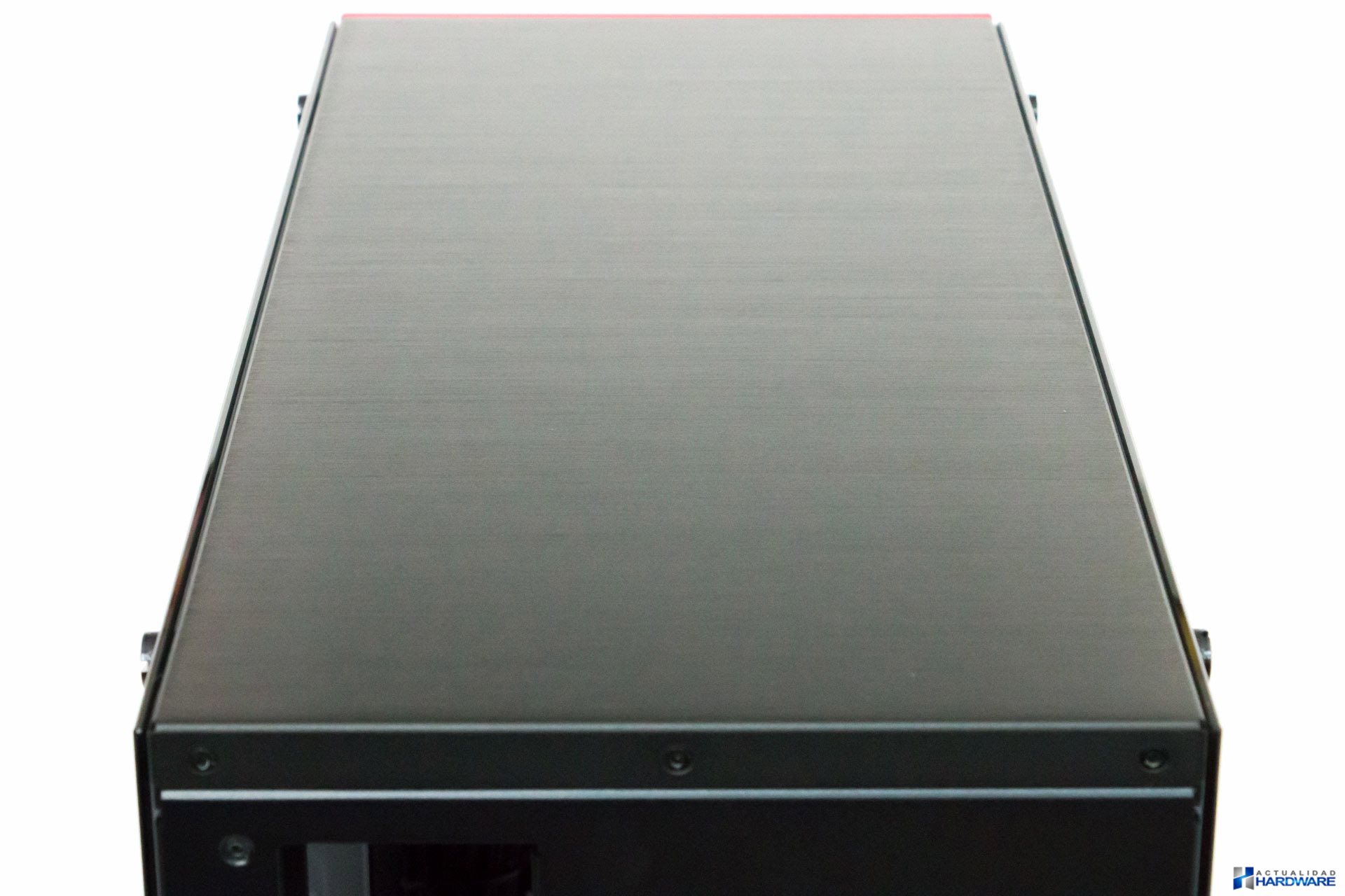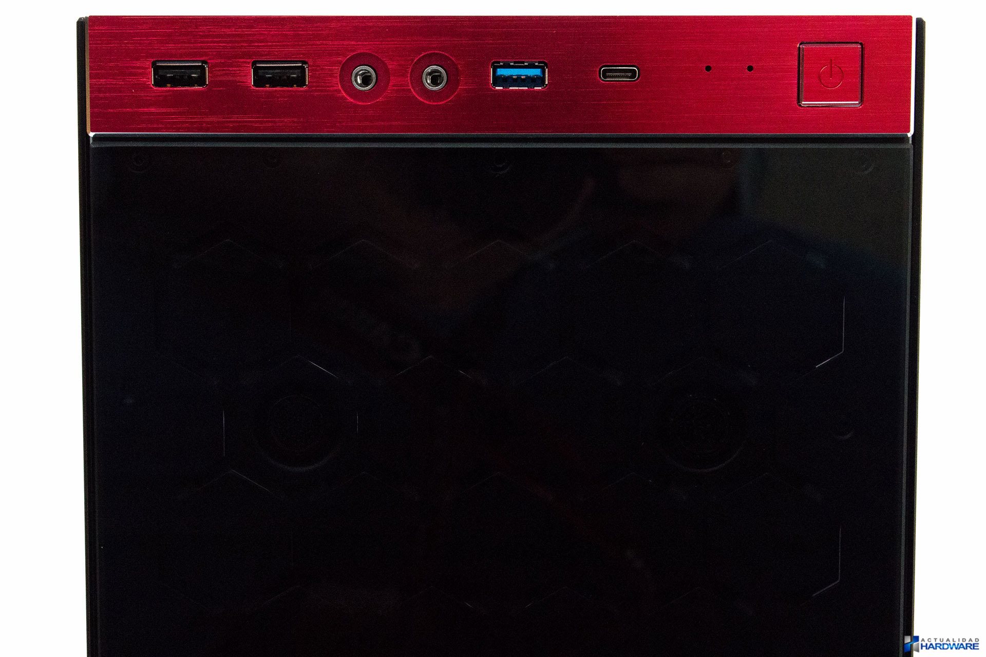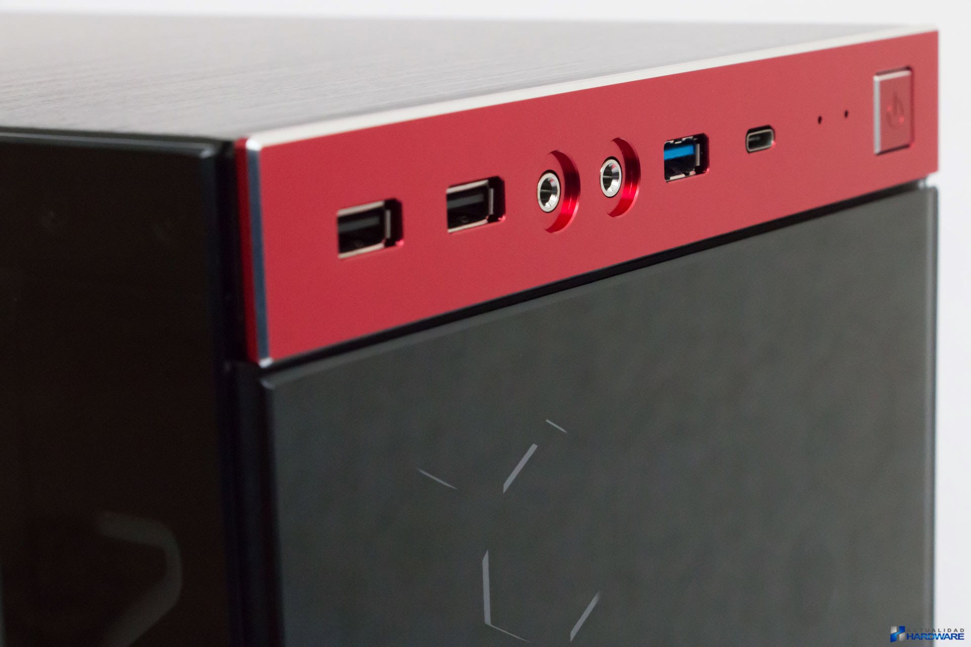 Nada más sacada la IN WIN 805 de su embalaje y situada sobre nuestra mesa de trabajo damos cuenta del excelente diseño y construcción de la misma. La IN WIN 805 es una Mid-Tower compatible con los formatos de placa base ATX, Micro-ATX y Mini-ITX. Hemos recibido la IN WIN 805 en la combinación de colores negro-rojo pero también existen varias combinaciones, concretamente en negro-negro y negro-oro. La IN WIN 805 se encuentra totalmente construida en aluminio de calidad, estando el mismo en su parte exterior cepillado, que le aporta un gran aspecto al conjunto. La misma incluye paneles construidos en vidrio templado tal y como veremos más adelante en detalle. La 805 cuenta con unas dimensiones de 476 x 205 x 455mm y un peso aproximado de 7kg. En la parte superior de su frontal se encuentra un panel construido en aluminiocepillado de color rojo y que alberga en este orden: 2x USB 2.0, 2x conectores audio HD, 1x USB 3.0, 1x USB 3.1 Type-C, 1x Led «Power», 1x Led HD y 1x botón «Power». La IN WIN no incorpora ningún hueco para unidades de 5.25″ en su frontal y bajo nuestra opinión cada vez son menos necesarias el uso de este tipo de unidades. El frontal cuenta con una lámina de vidrio templado al igual que sus paneles laterales que se encuentran construidos bajo el mismo material.