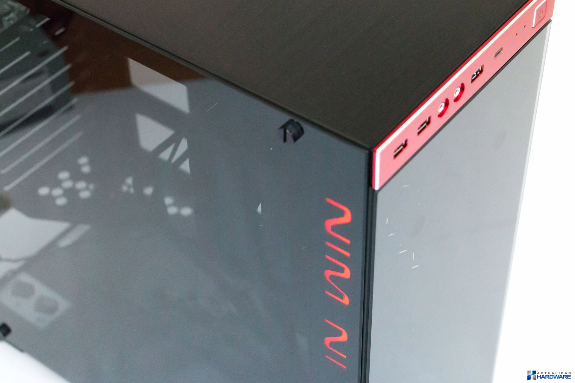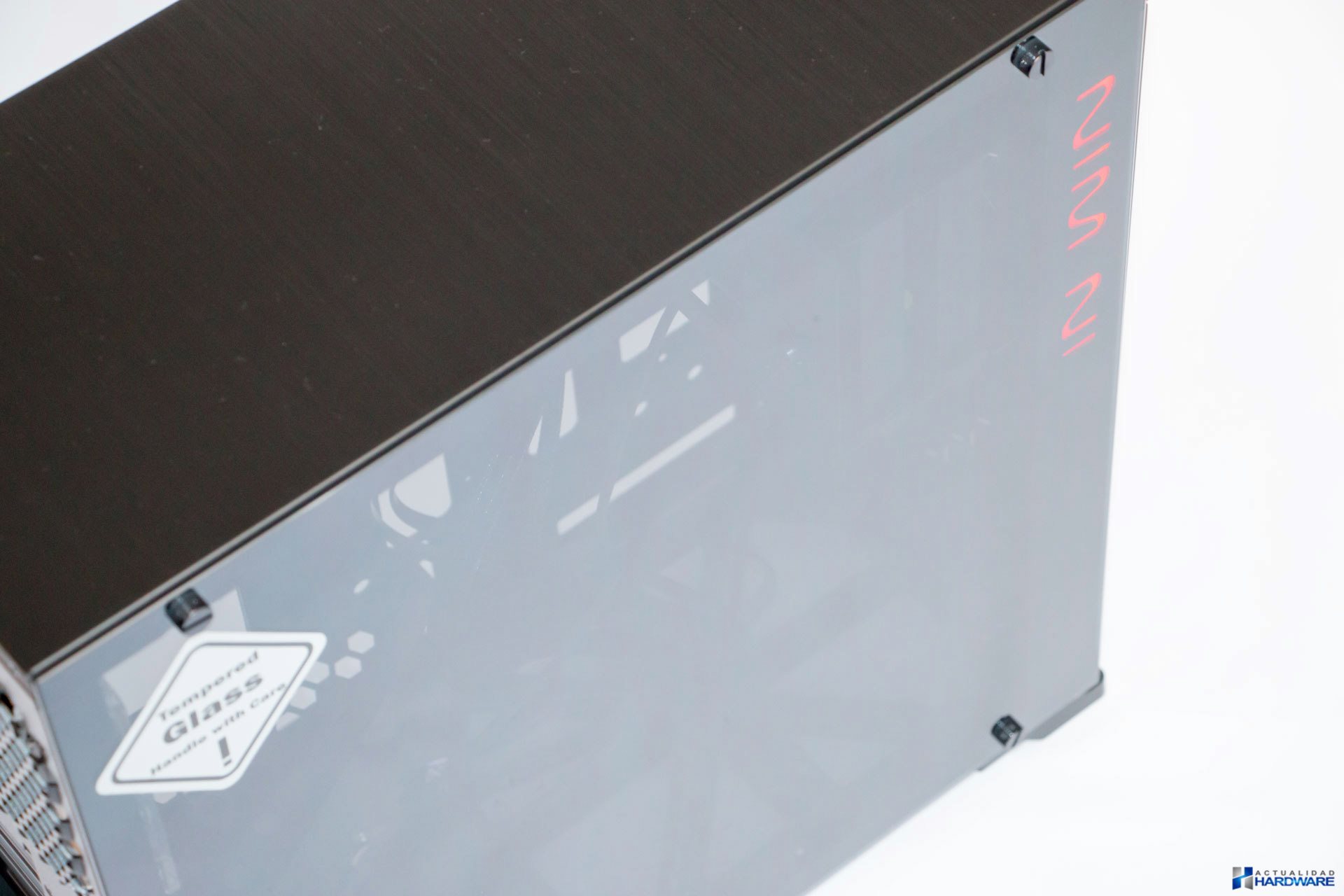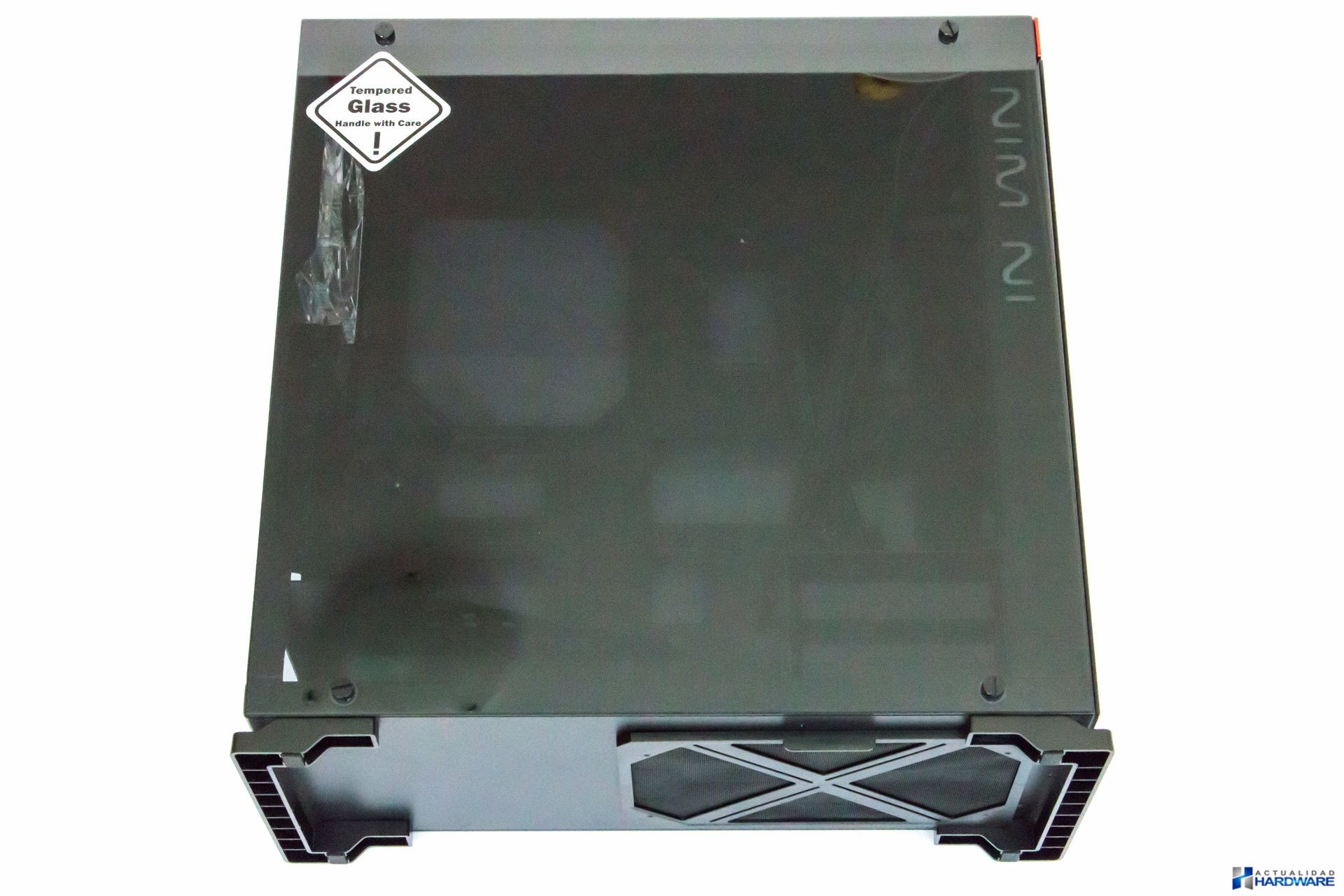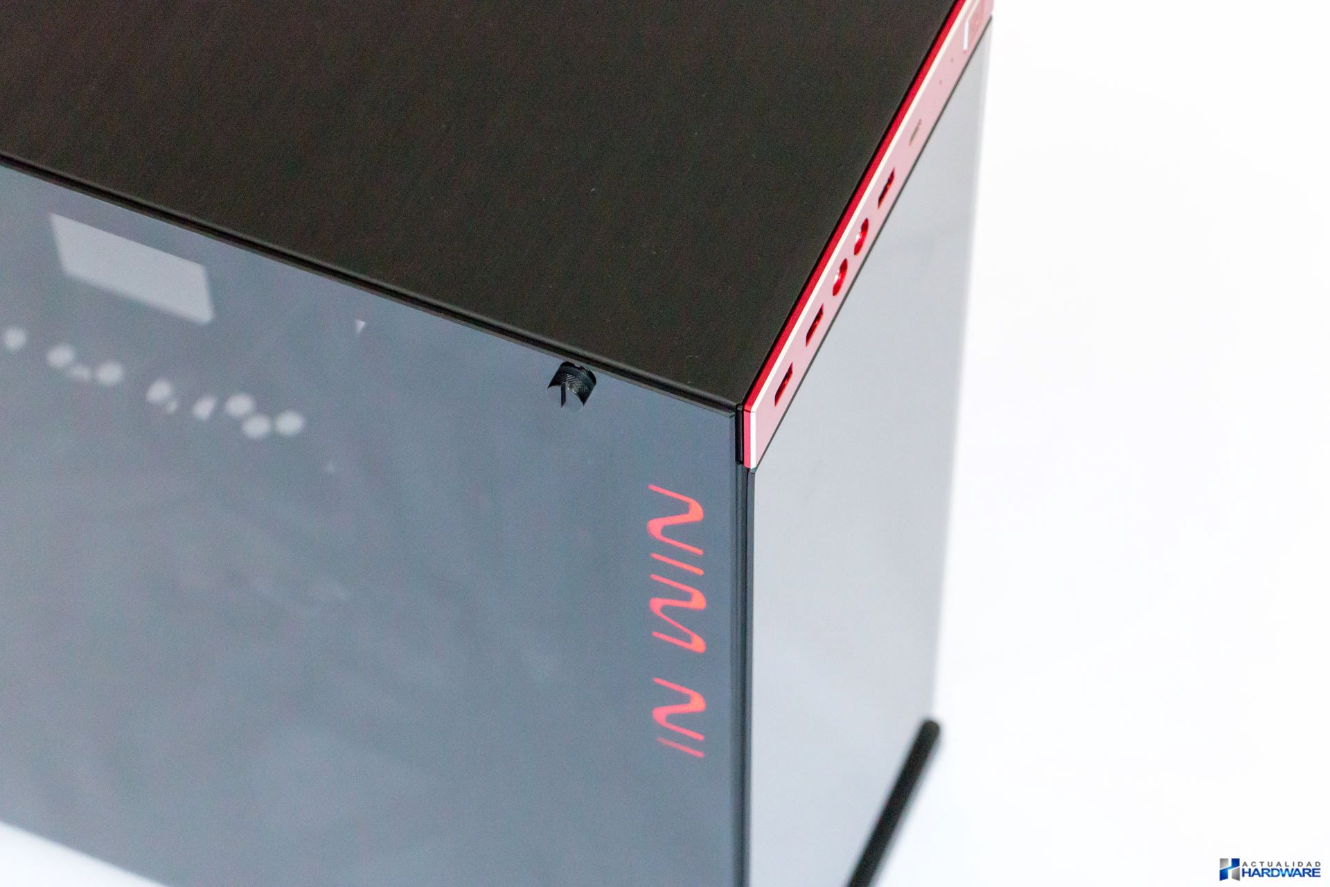 Nada más sacada la IN WIN 805 de su embalaje y situada sobre nuestra mesa de trabajo damos cuenta del excelente diseño y construcción de la misma. La IN WIN 805 es una Mid-Tower compatible con los formatos de placa base ATX, Micro-ATX y Mini-ITX. Hemos recibido la IN WIN 805 en la combinación de colores negro-rojo pero también existen varias combinaciones, concretamente en negro-negro y negro-oro. La IN WIN 805 se encuentra totalmente construida en aluminio de calidad, estando el mismo en su parte exterior cepillado, que le aporta un gran aspecto al conjunto. La misma incluye paneles construidos en vidrio templado tal y como veremos más adelante en detalle. La 805 cuenta con unas dimensiones de 476 x 205 x 455mm y un peso aproximado de 7kg. En la parte superior de su frontal se encuentra un panel construido en aluminiocepillado de color rojo y que alberga en este orden: 2x USB 2.0, 2x conectores audio HD, 1x USB 3.0, 1x USB 3.1 Type-C, 1x Led «Power», 1x Led HD y 1x botón «Power». La IN WIN no incorpora ningún hueco para unidades de 5.25″ en su frontal y bajo nuestra opinión cada vez son menos necesarias el uso de este tipo de unidades. El frontal cuenta con una lámina de vidrio templado al igual que sus paneles laterales que se encuentran construidos bajo el mismo material.