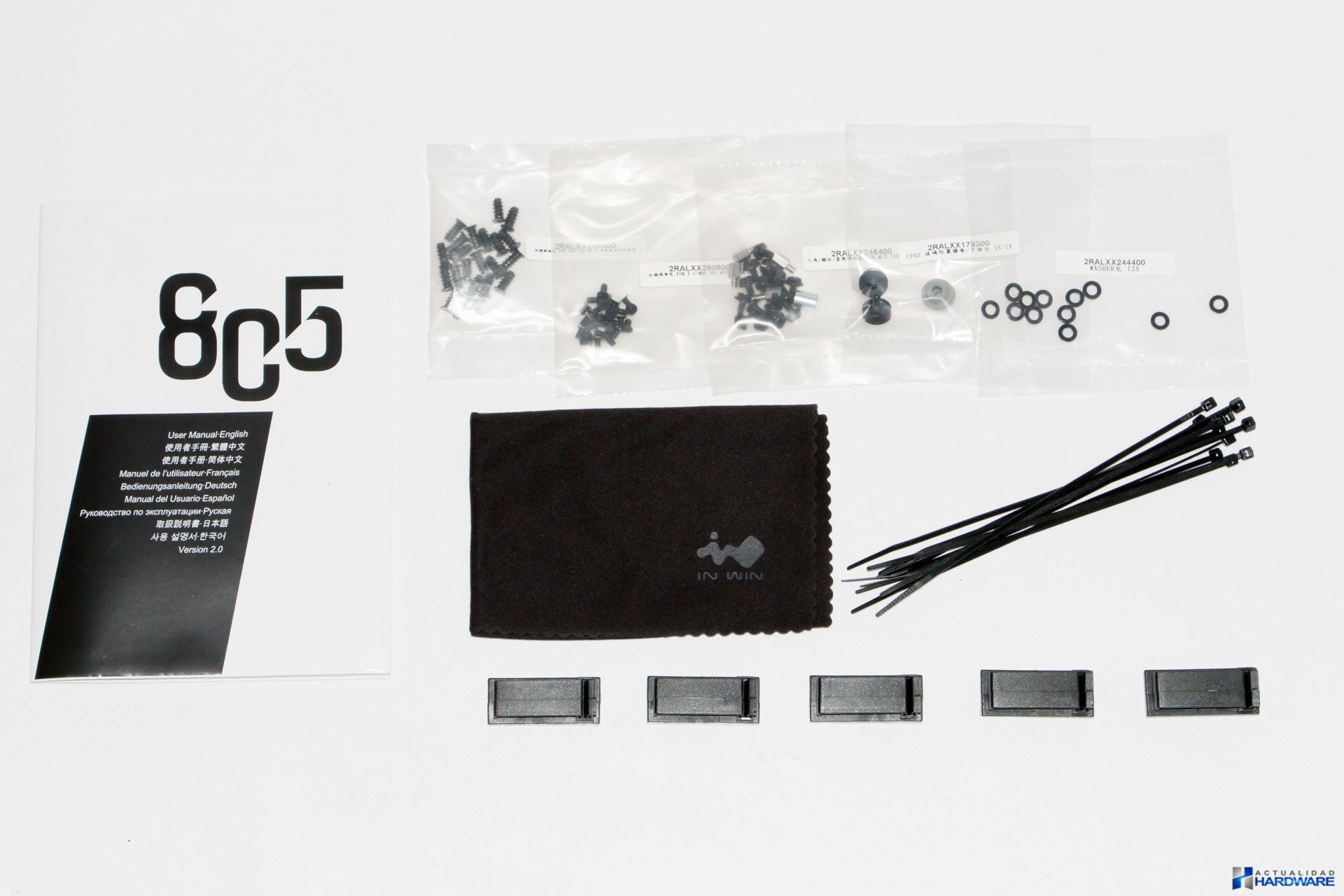 La IN WIN 805 se presenta en una caja de cartón de grandes dimensiones de color marrón, donde únicamente se muestra el logo del fabricante junto con el modelo de la caja. En ambos laterales se muestra información acerca de tanto sus características como sus especificaciones, las cuales iremos viendo a lo largo del review. Como vemos en su laterales, la unidad recibida es de color negra/roja, estando disponible en colores negro y oro. Una vez abierto su embalaje vemos que todo se presenta perfectamente embalado y protegido, la torre lo hace dentro de una bolsa de tela negra, rodeada por bloques poliespan, algo realmente importante para que la misma llegue en perfectas condiciones al usuario final. Los accesorios se presentan dentro de una bolsa de plástico con sistema autocierre, entre los que se encuentran: manual de usuario en varios idiomas entre ellos el español, tornillería variada, gamuza para la limpieza de la torre, bridas de plástico, soportes de plástico para la organización del cableado interno de la torre y soporte-ventosa para colocar nuestros auriculares, éste último lo veremos en detalle más adelante.