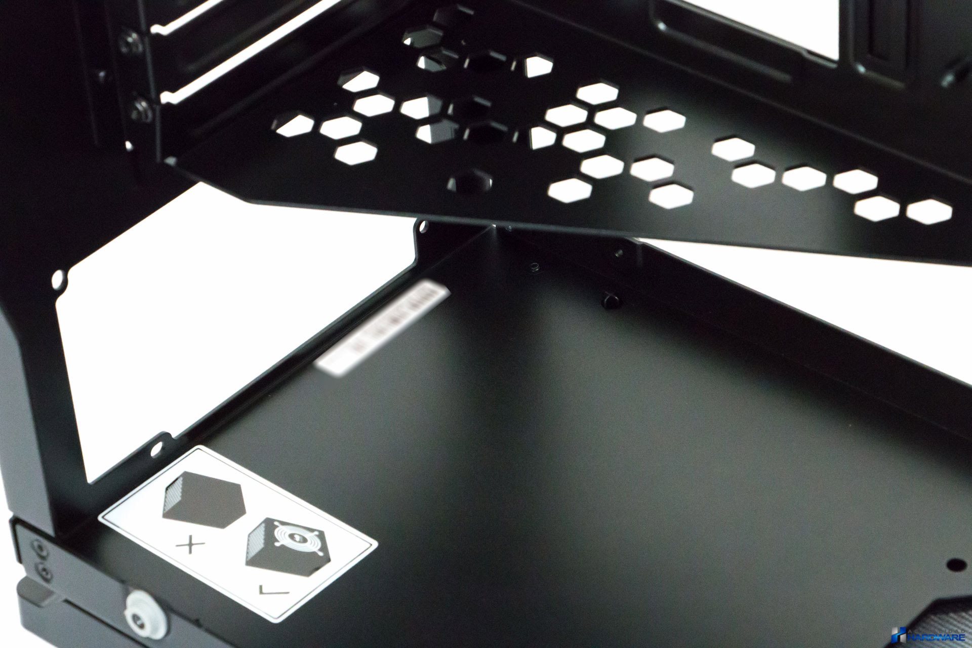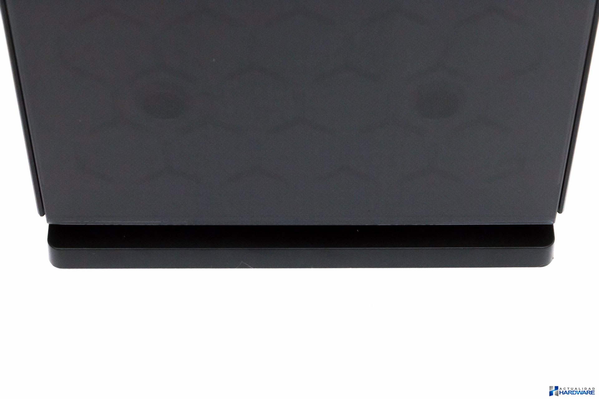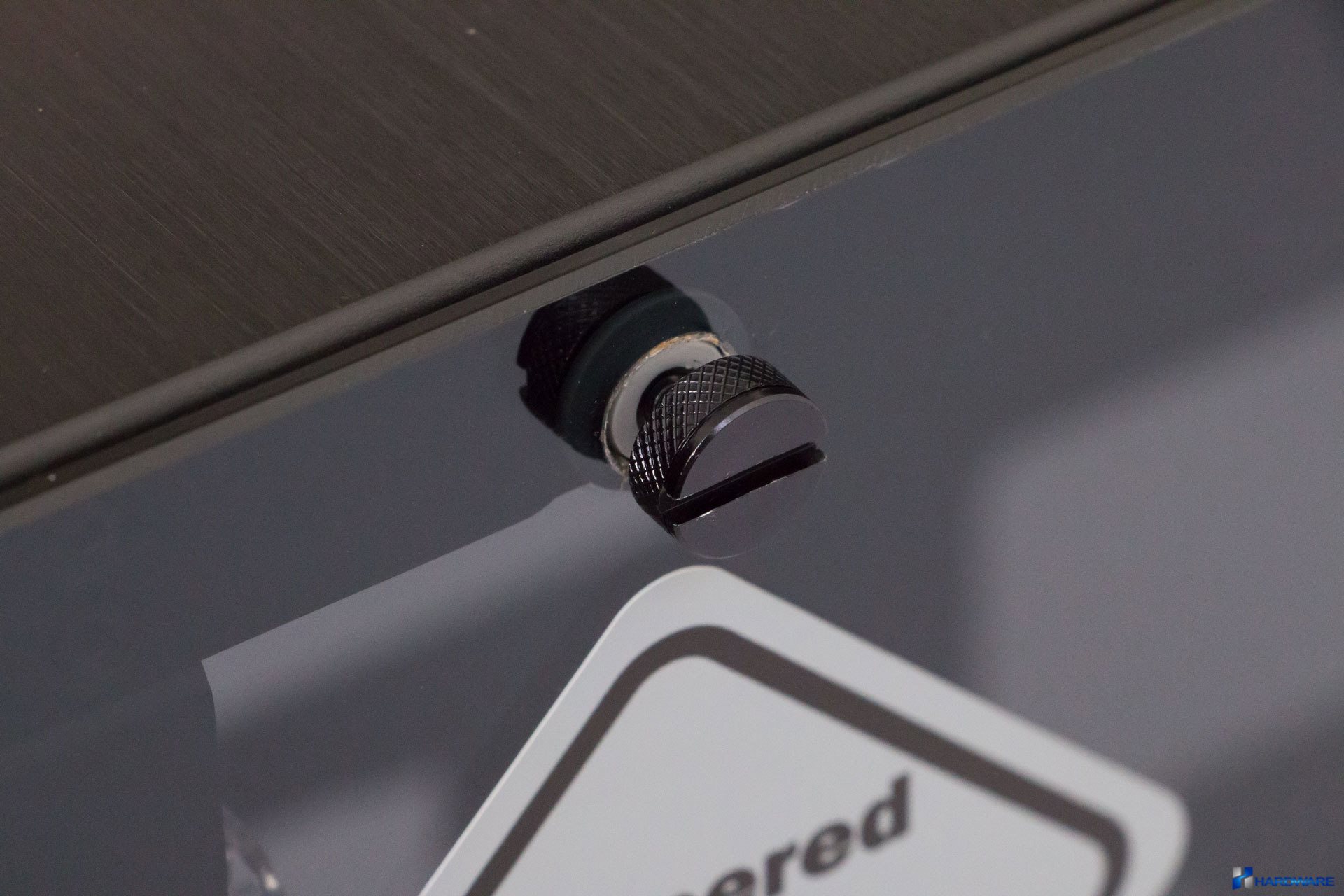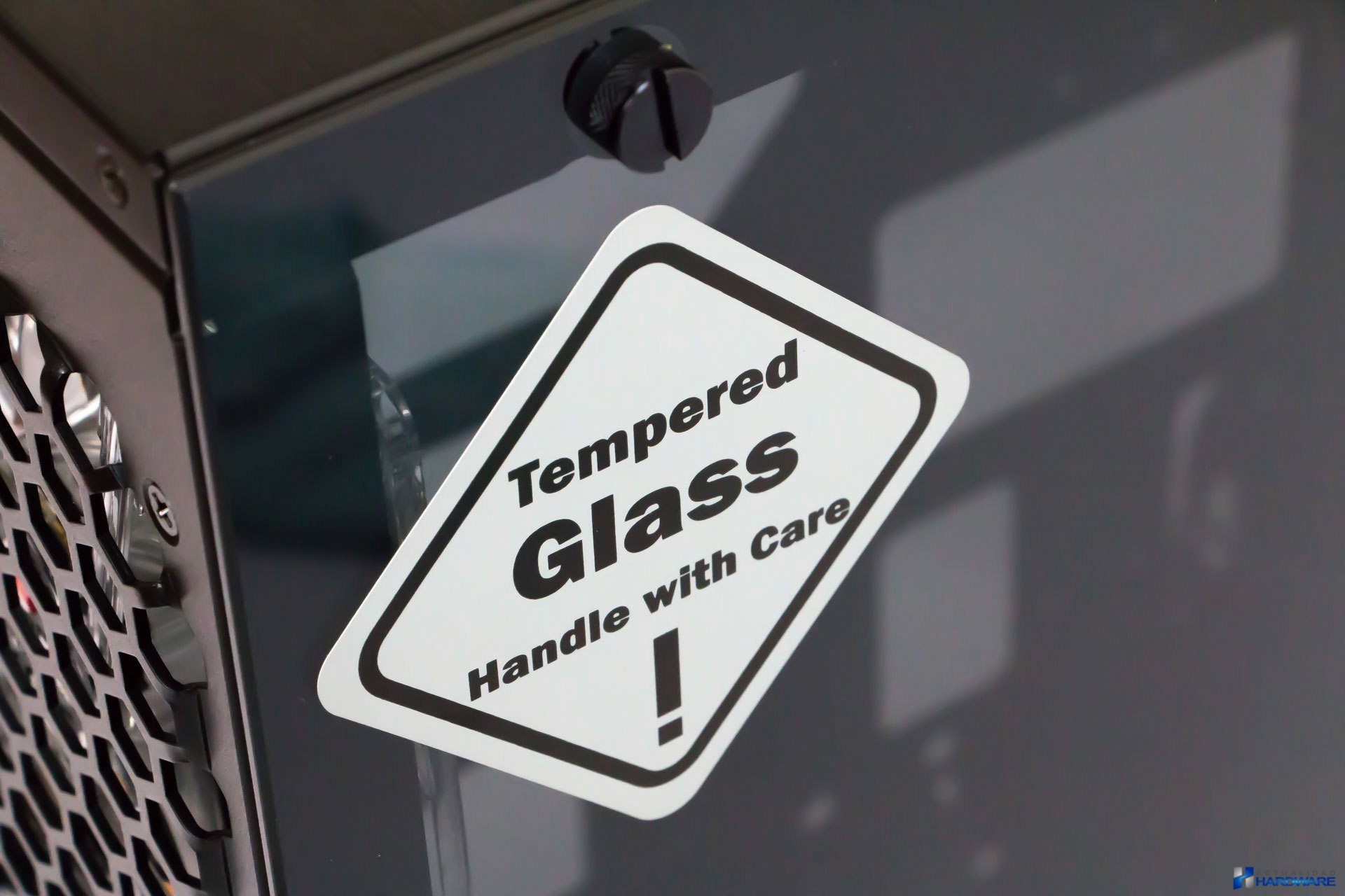 En su zona inferior, la IN WIN 805, cuenta con patas con terminación gomosa en forma de plataforma, que realmente le aporta un gran aspecto a la misma. Justo debajo de la zona destinado al rack de las unidades de almacenamiento se encuentra un filtroremovible, lavable y con sujecciónmagnética, siendo realmente cómodo de retirar gracias a este novedoso sistema mediante imanes. Para la retirada de las tapas laterales incluye tornillería de aperturarápida sin herramientas, algo imprescindible en las torres actuales. En uno de sus laterales incluye una pegatina para recordarnos que los mismos se encuentran construidos en vidrio templado por lo que tendremos que tener especial cuidado a la hora trastear con ella.