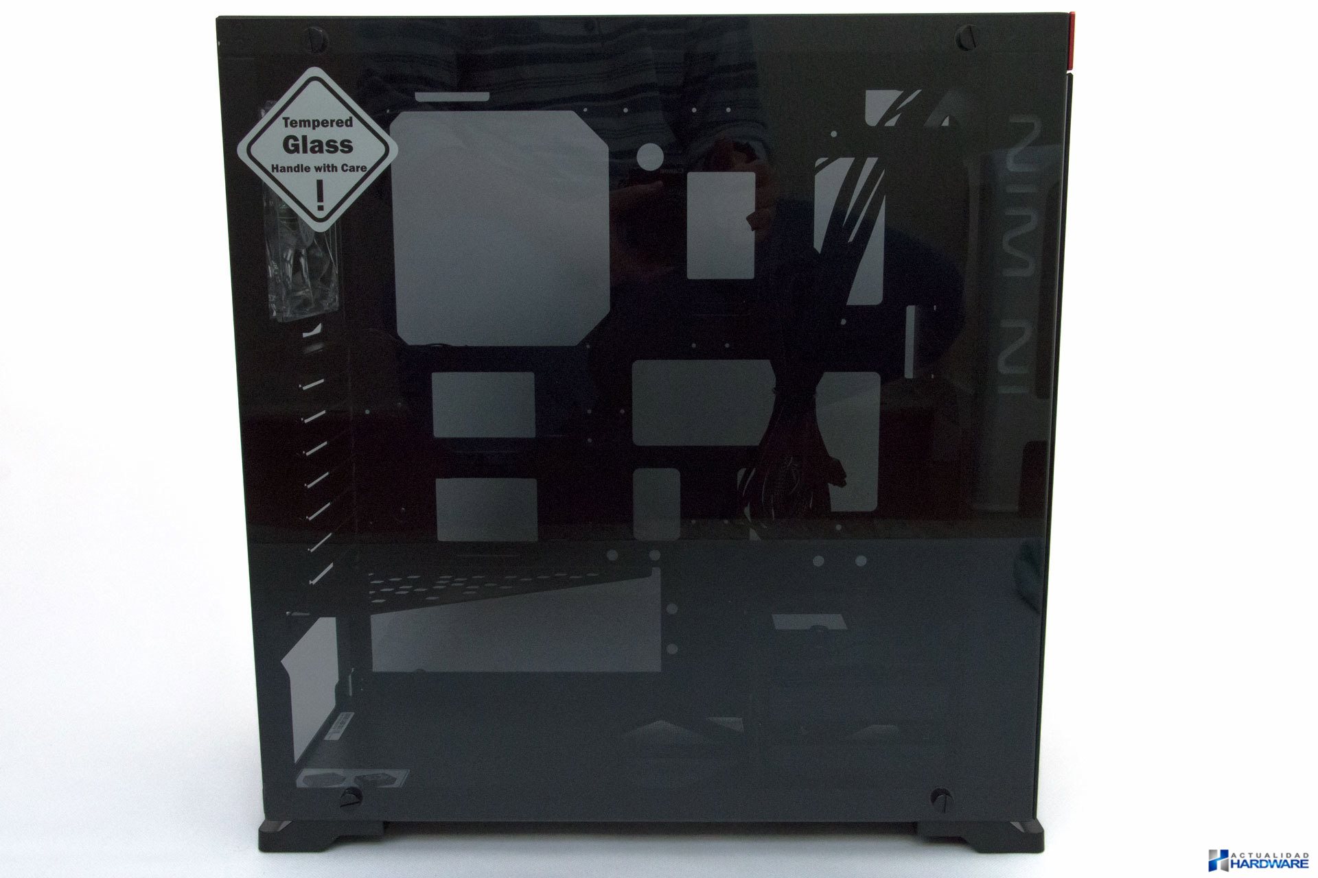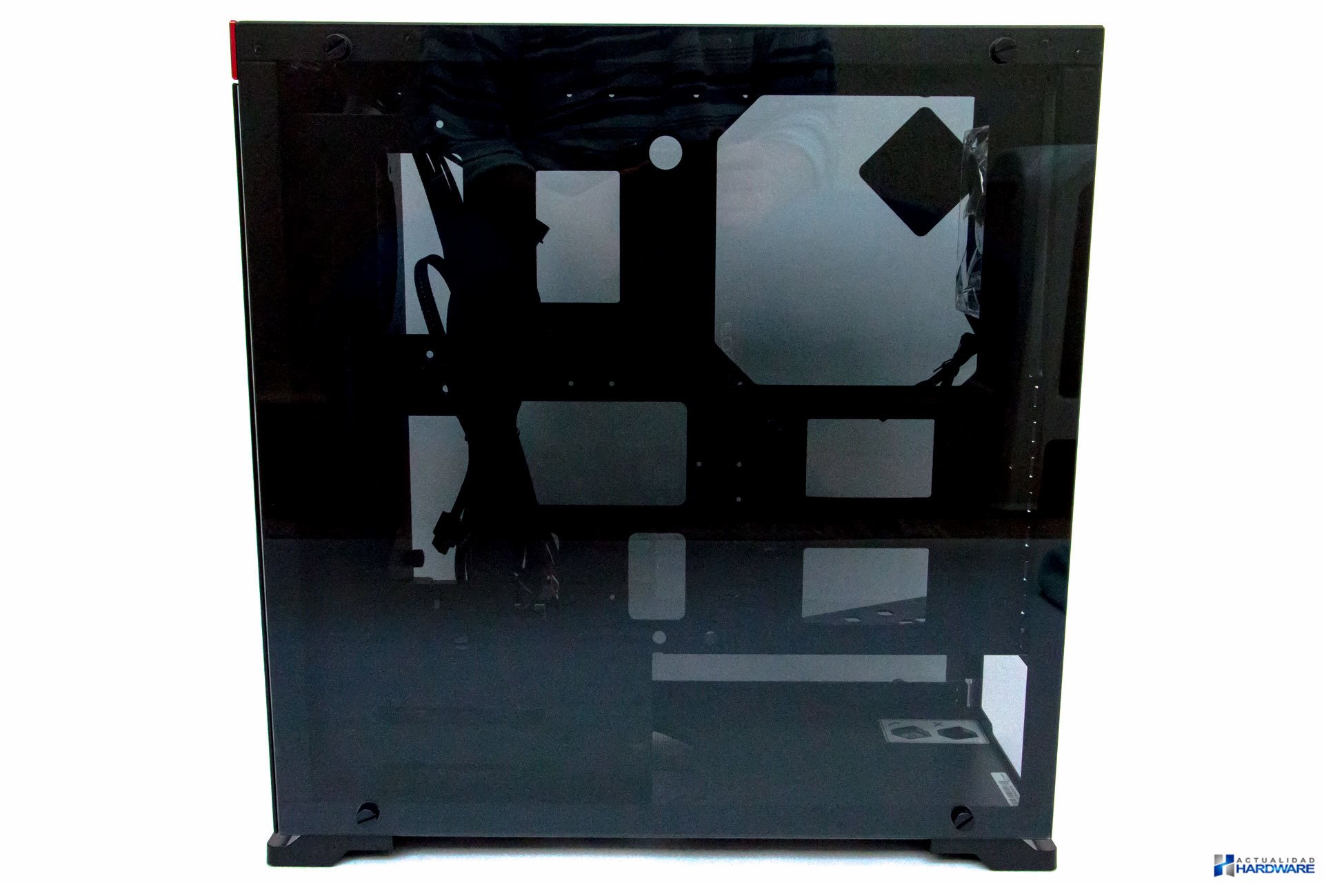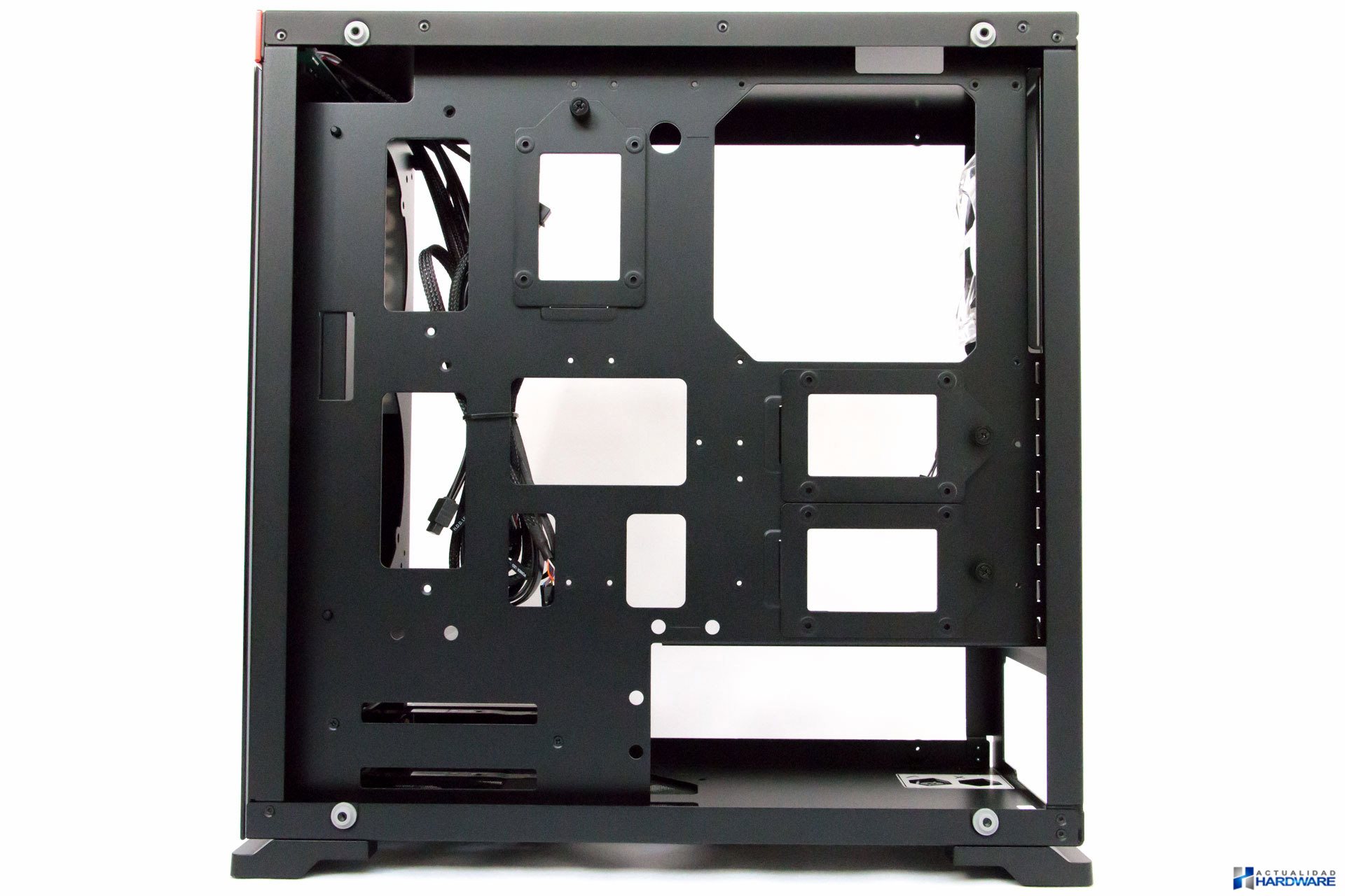 Como podemos ver en la primera de las imágenes, el vidrio templado utilizado en la fabricación de sus tapas laterales cuenta con un buen grosor, concretamente de 3mm y excelente terminación al igual que el resto de la torre. Una vez retirados ambas tapas, podemos ver que la IN WIN 805 cuenta con un espacioso interior donde poder instalar nuestros componentes de una manera muy cómoda. Sobre la misma es posible instalar disipadores de CPU dehasta 156mm de altura,tarjetas gráficas de hasta 320mm de longitud yfuentes de alimentación ATX con hasta 220mm de longitud. La bandeja de la placa base cuenta con un gran hueco destinado para facilitar la instalación del backplate de nuestros disipador de CPU o bloque de refrigeración líquida. En el apartado de refrigeración podemos instalar sobre ella en su parte frontal, 2x ventiladores de 120/140mm, ideal para la instalación de un radiador para refrigeraciónlíquida (grosor de 60mm) de 120/140/240/280mm, en su parte trasera además del ventilador de 120mm incluido, es posible instalar un radiador de hasta 35mm de grosor y en su parte inferior previa retirada del rack de las unidades de almacenamiento, un ventilador de 120mm. Podemos ver que el interior de la 805 de IN WIN, incluye numerosos huecos-pasacables destinados a la organización del cableado, siendo imprescindible si deseamos mejorar tanto la estética como la refrigeración de nuestra torre, y más si la misma cuenta con paneles laterales de vidrio templado a través de los cuales es posible ver todo el interior de la caja.