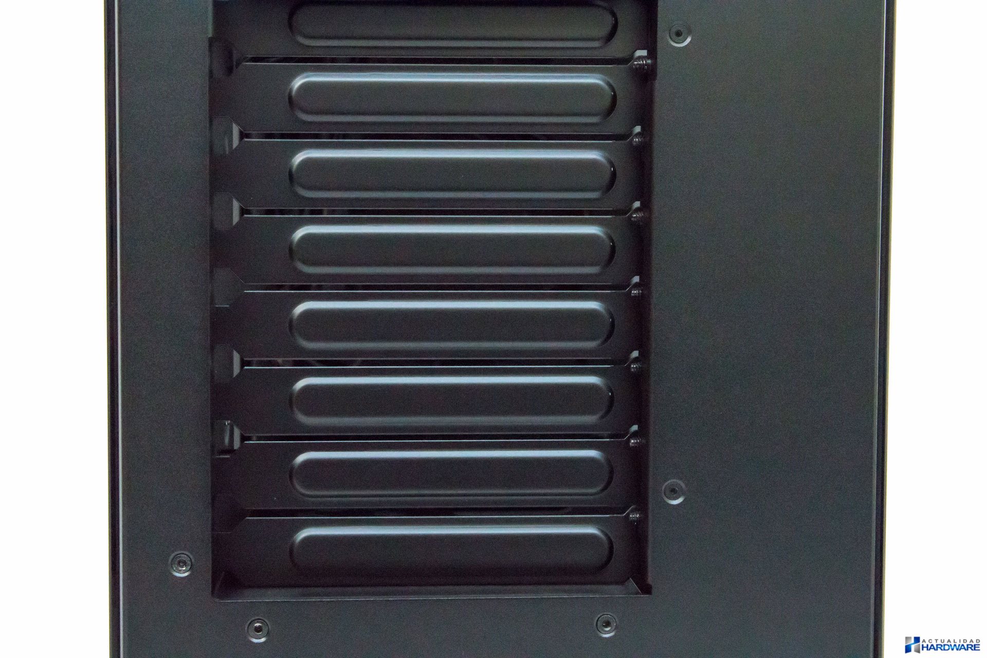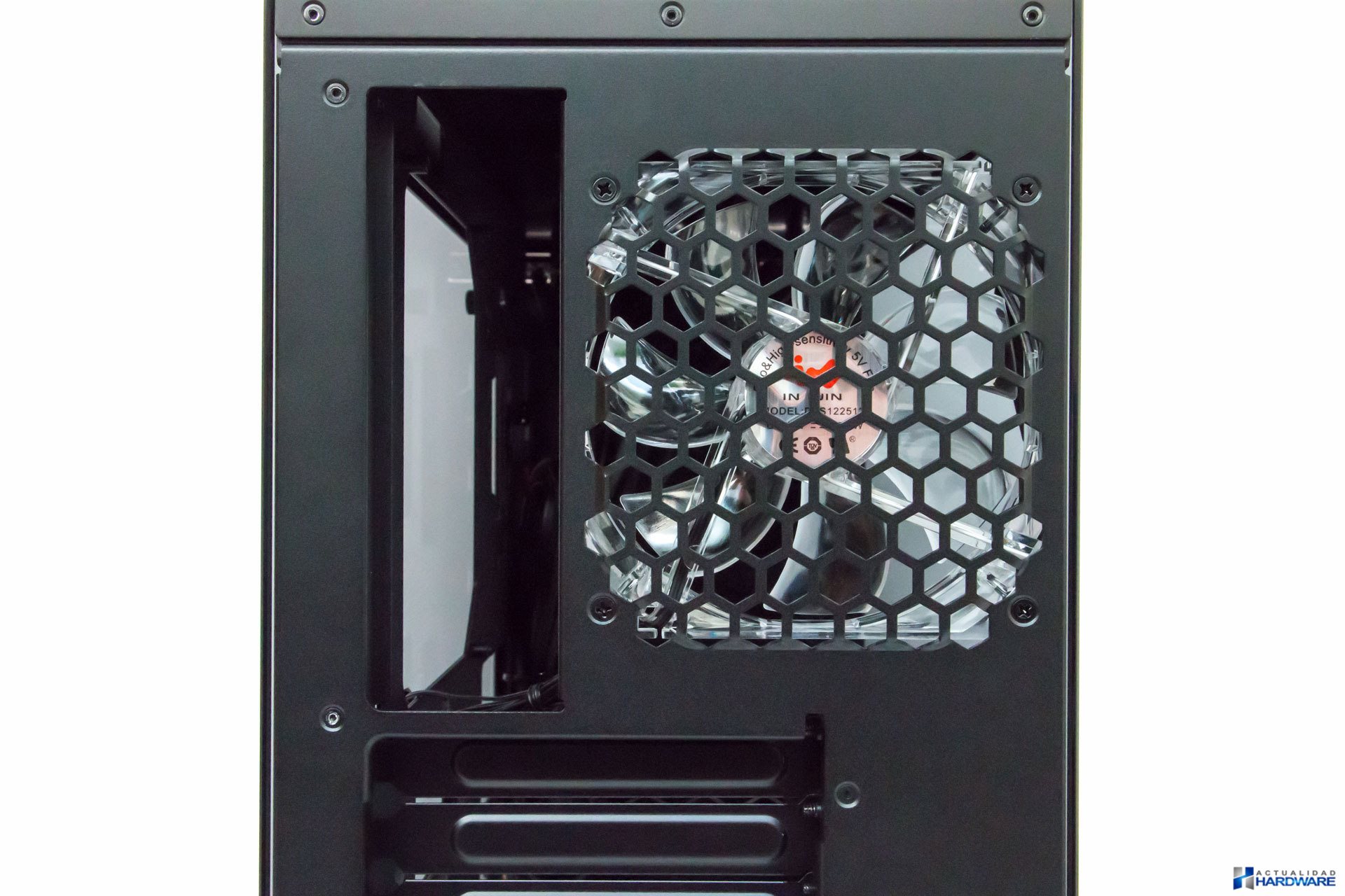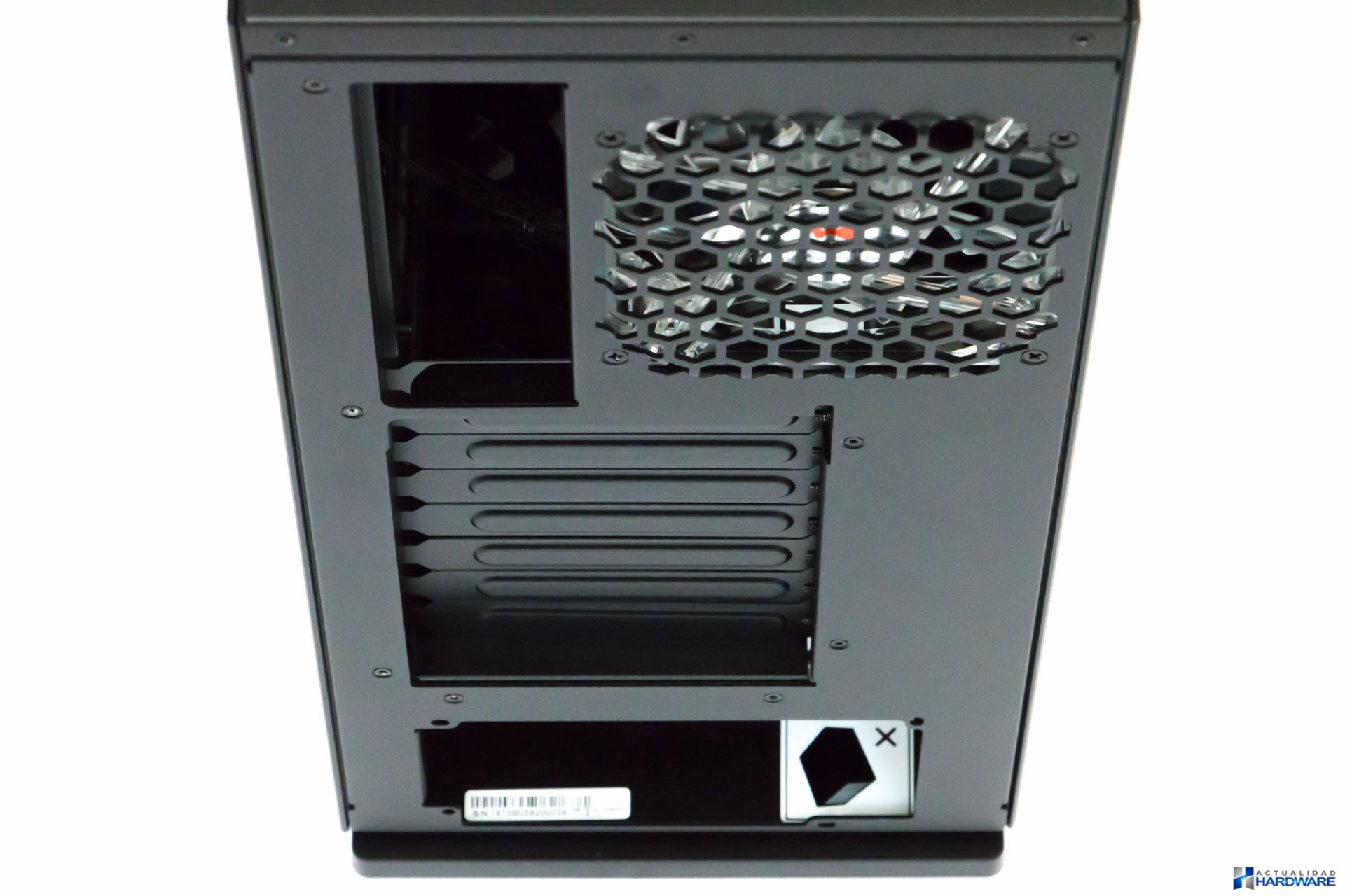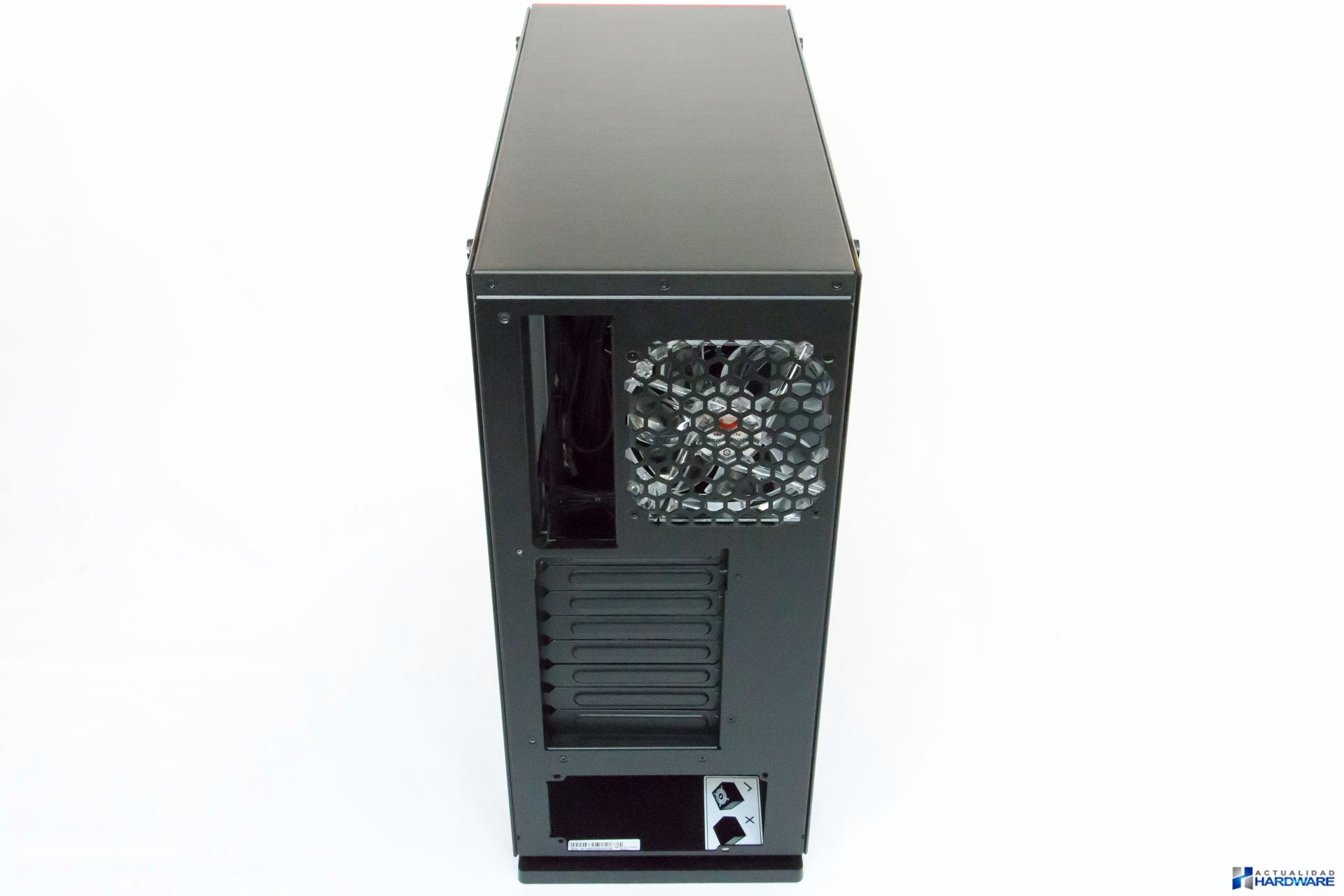 En su parte trasera se incluye el hueco para el panel I/O Shield de la placa base, hueco con rejilla para ventilador en el que se incluye de serie uno Led de color rojo de 120mm, 8 slots de expansión PCI y hueco para la instalación de una fuente de alimentación en su zona inferior, aunque debemos comentar que no nos termina de convencer la posición en la que debemos instalar la PSU, ya que es necesario instalarla con el ventilador mirando hacia dentro de la torre lo que hace que el aire caliente proveniente de la misma se quede dentro de la caja. Todo ello con una excelenteconstrucción y ensamblaje, debemos comentar que la torre en vivo gana muchísimo más que en las fotos realizadas por nosotros. La misma no incluye orificios para la instalación de tubos de sistemas de refrigeración líquida.