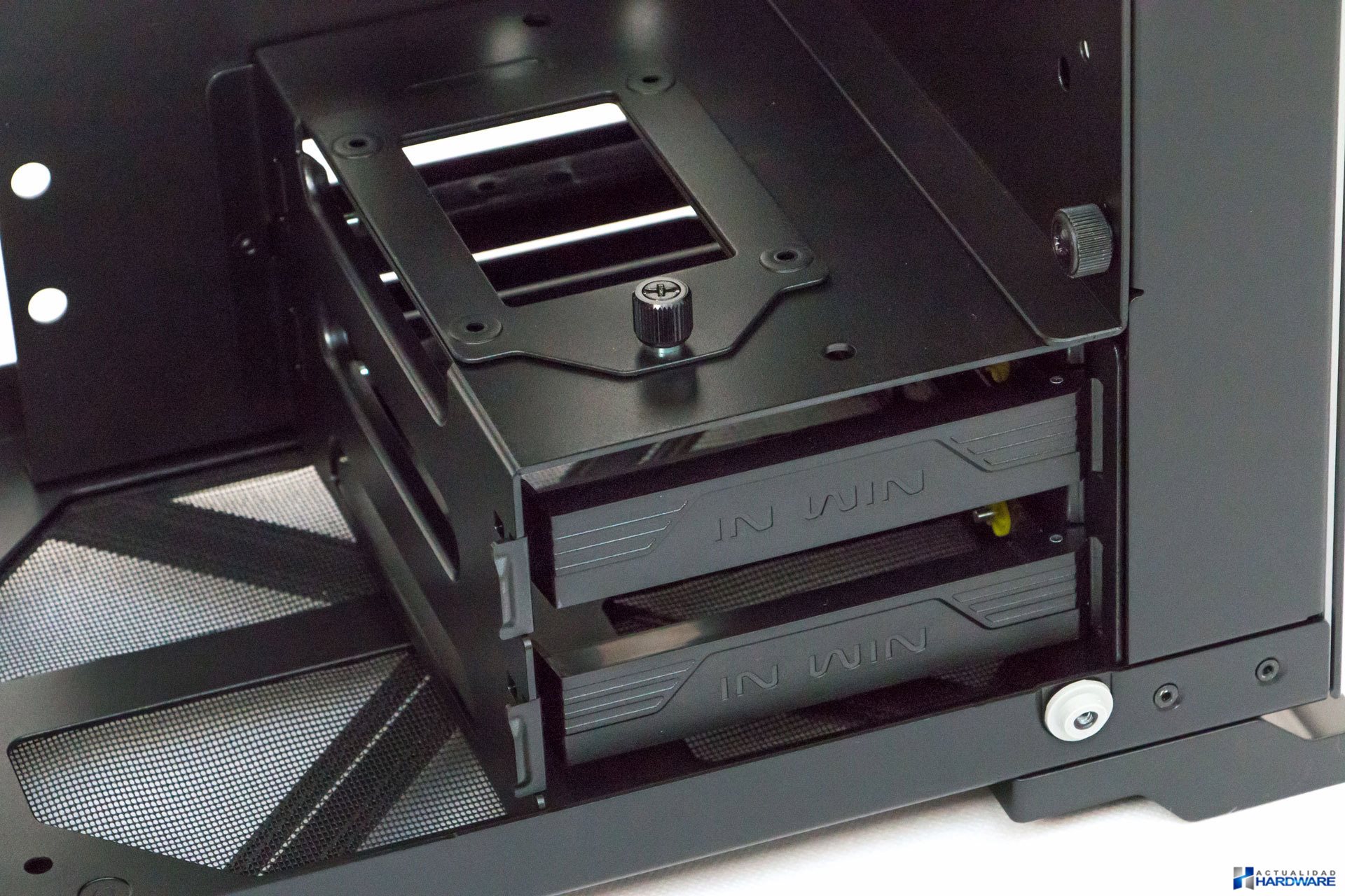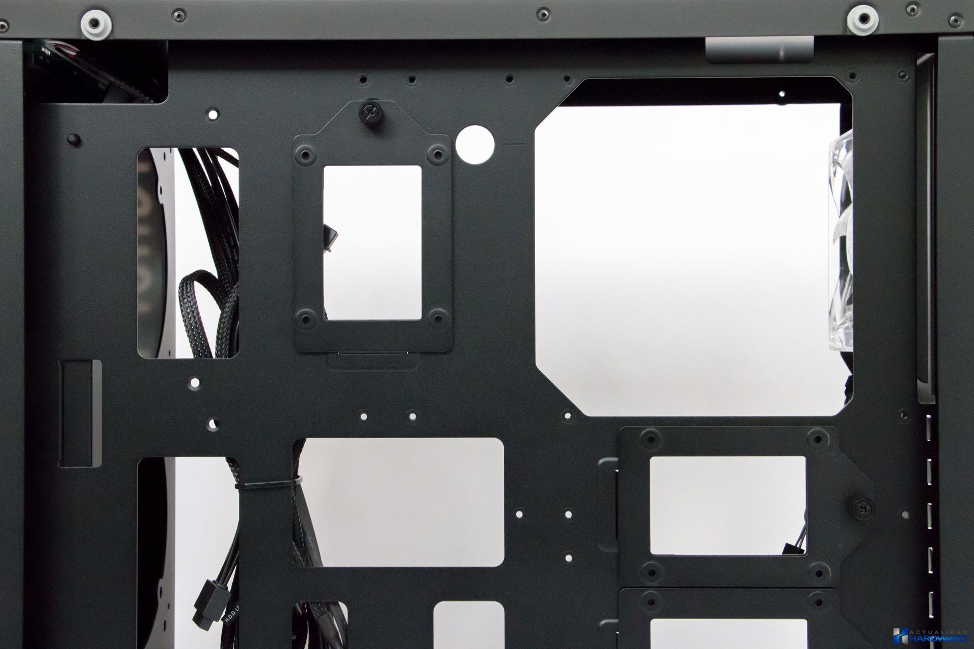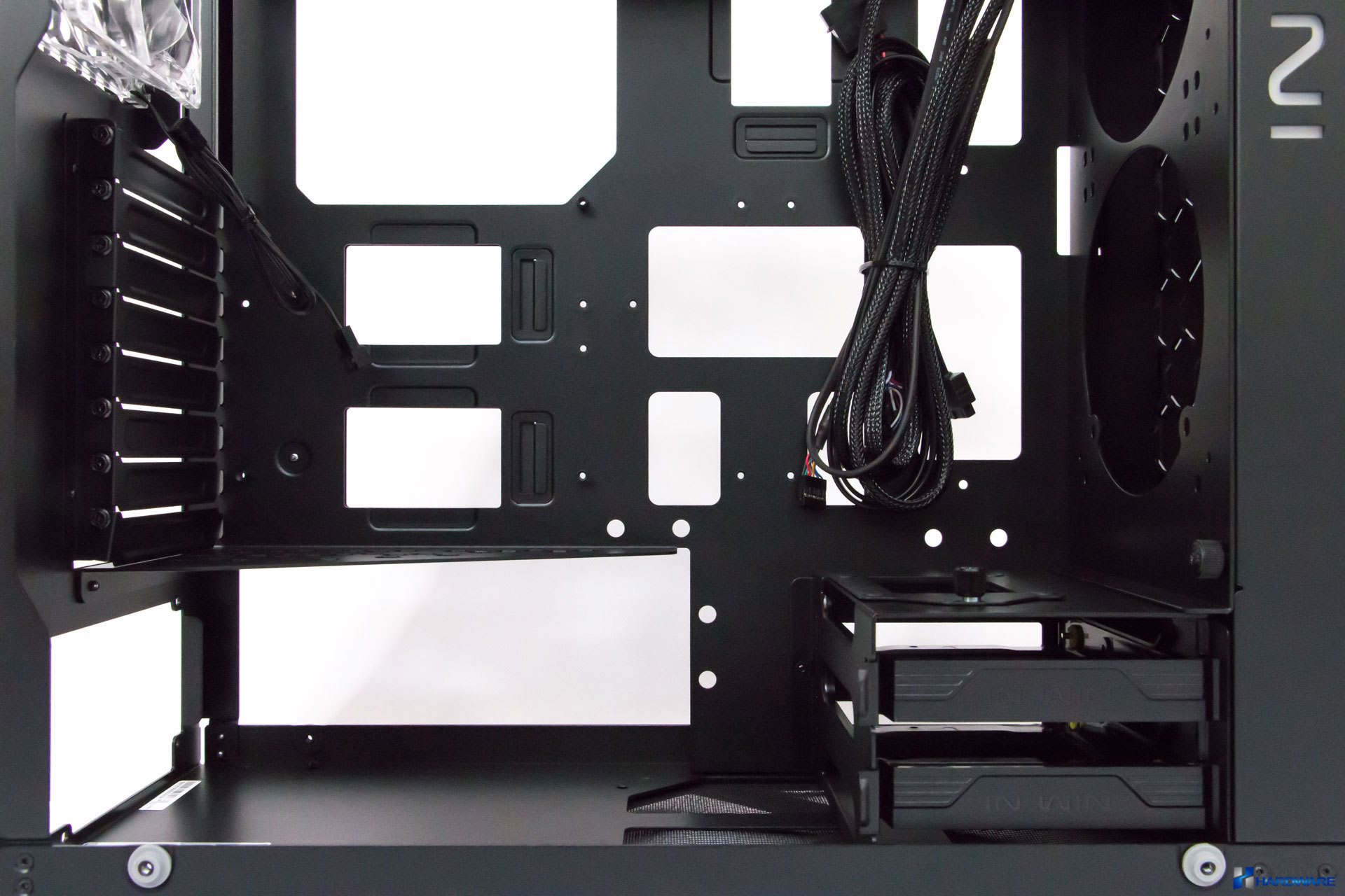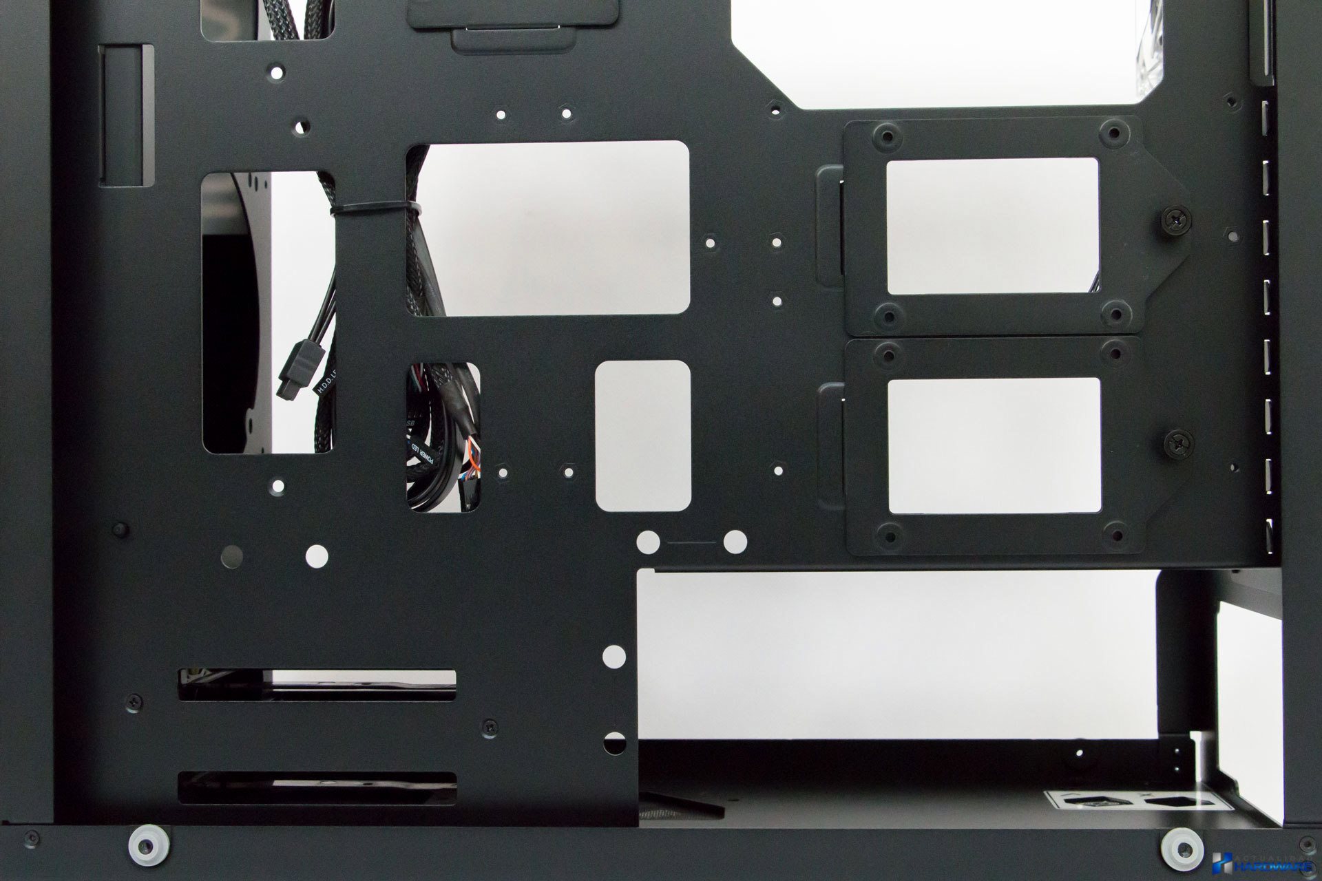 Incluye un rack para unidades de almacenamiento, siendo el mismo removible para la instalación de tarjetas gráficas de gran tamaño. El rack incluye dos bahías de plástico en las que podremos realizar la instalación de unidades de disco duro tanto de 3.5″ como de 2.5″, todo ello de una manera muy fácil. Encima del rack tenemos la posibilidad de instalar una unidad de 2.5″. Detrás de la bandeja de la placa base podemos instalar además tres unidades SSD de 2.5″, por lo que en aparato de almacenamiento estamos bien servidos. Como ya hemos tenido la oportunidad de comentaros, la IN WIN 805, cuenta con numerosos huecos pasa-cables destinados a mejorar tanto la estética así como la organización del cableado interno de la torre para de este modo mejorar la refrigeración del conjunto. Cuenta además con un gran hueco detrás de la placa base en la que podremos realizar una instalación limpia del cableado interno de la torre.