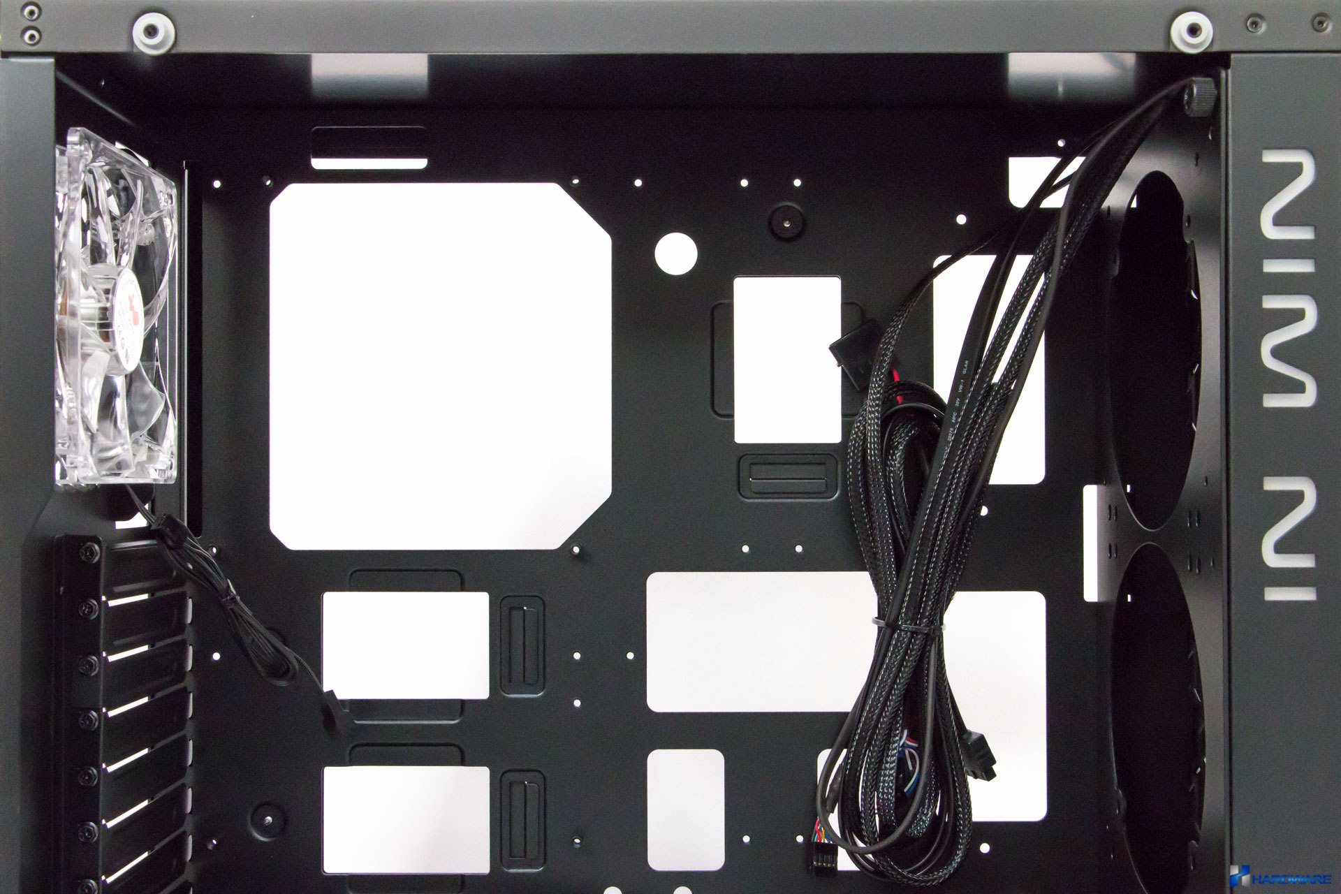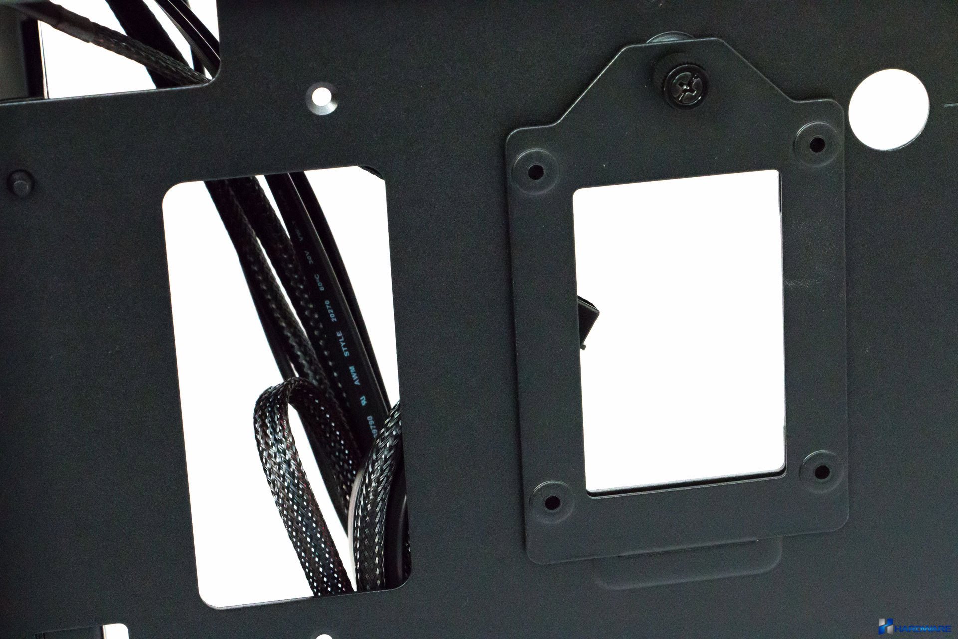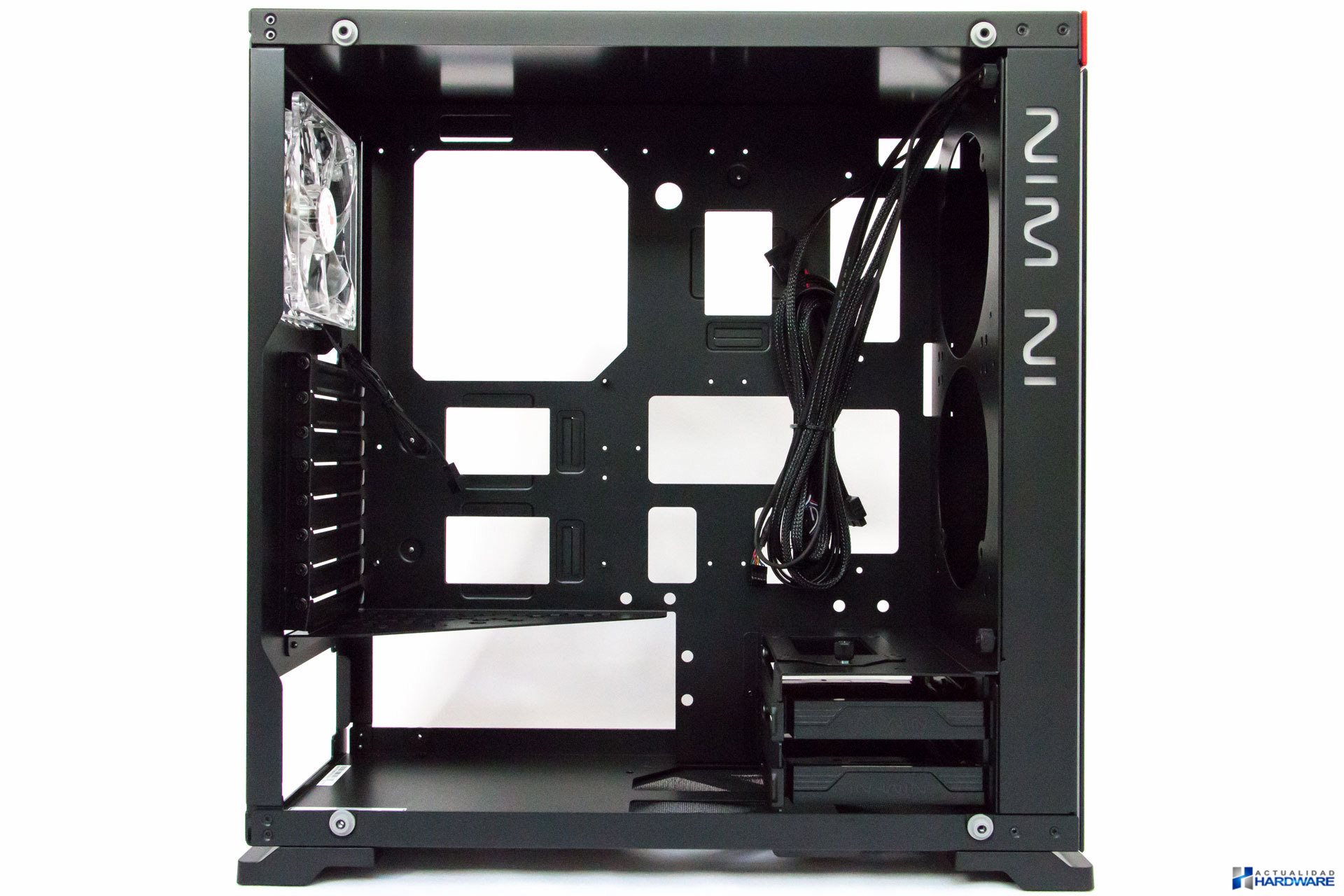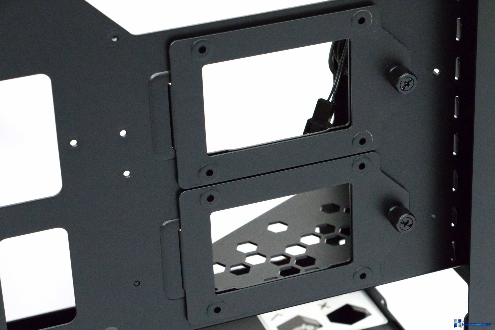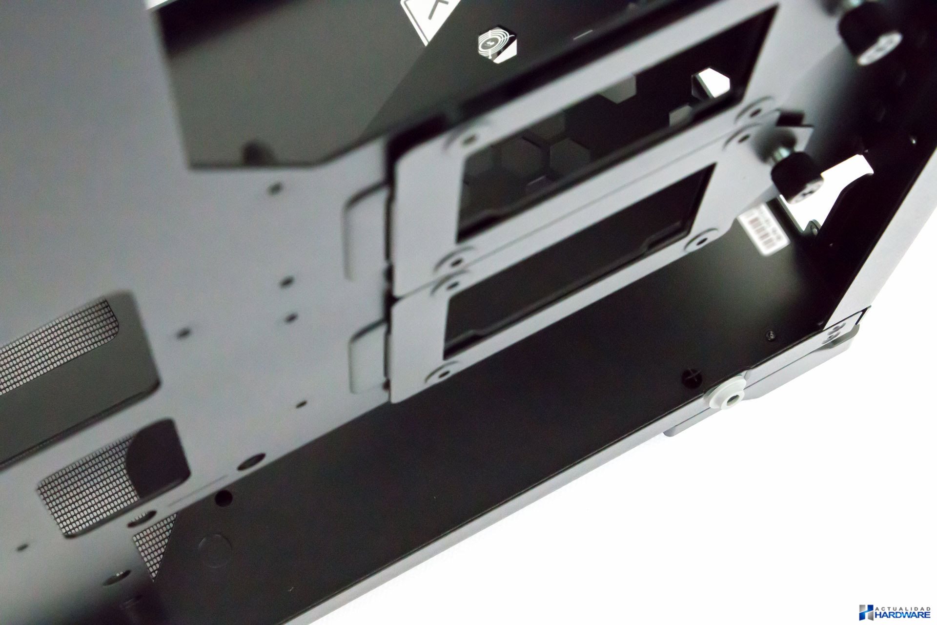Incluye un rack para unidades de almacenamiento, siendo el mismo removible para la instalación de tarjetas gráficas de gran tamaño. El rack incluye dos bahías de plástico en las que podremos realizar la instalación de unidades de disco duro tanto de 3.5″ como de 2.5″, todo ello de una manera muy fácil. Encima del rack tenemos la posibilidad de instalar una unidad de 2.5″. Detrás de la bandeja de la placa base podemos instalar además tres unidades SSD de 2.5″, por lo que en aparato de almacenamiento estamos bien servidos. Como ya hemos tenido la oportunidad de comentaros, la IN WIN 805, cuenta con numerosos huecos pasa-cables destinados a mejorar tanto la estética así como la organización del cableado interno de la torre para de este modo mejorar la refrigeración del conjunto. Cuenta además con un gran hueco detrás de la placa base en la que podremos realizar una instalación limpia del cableado interno de la torre.