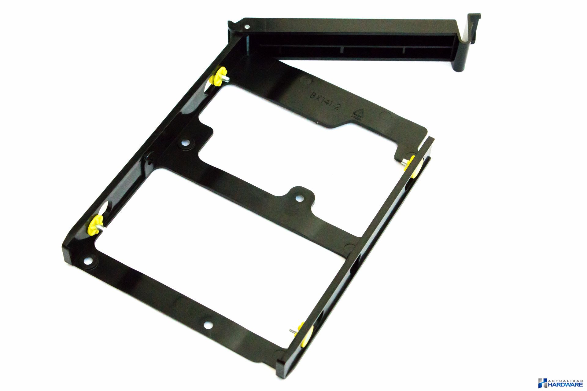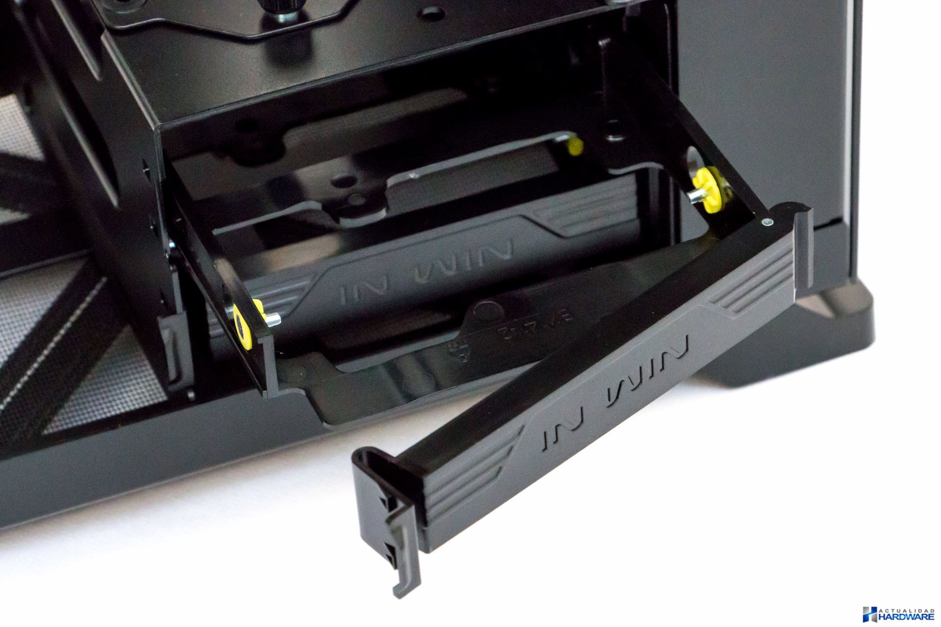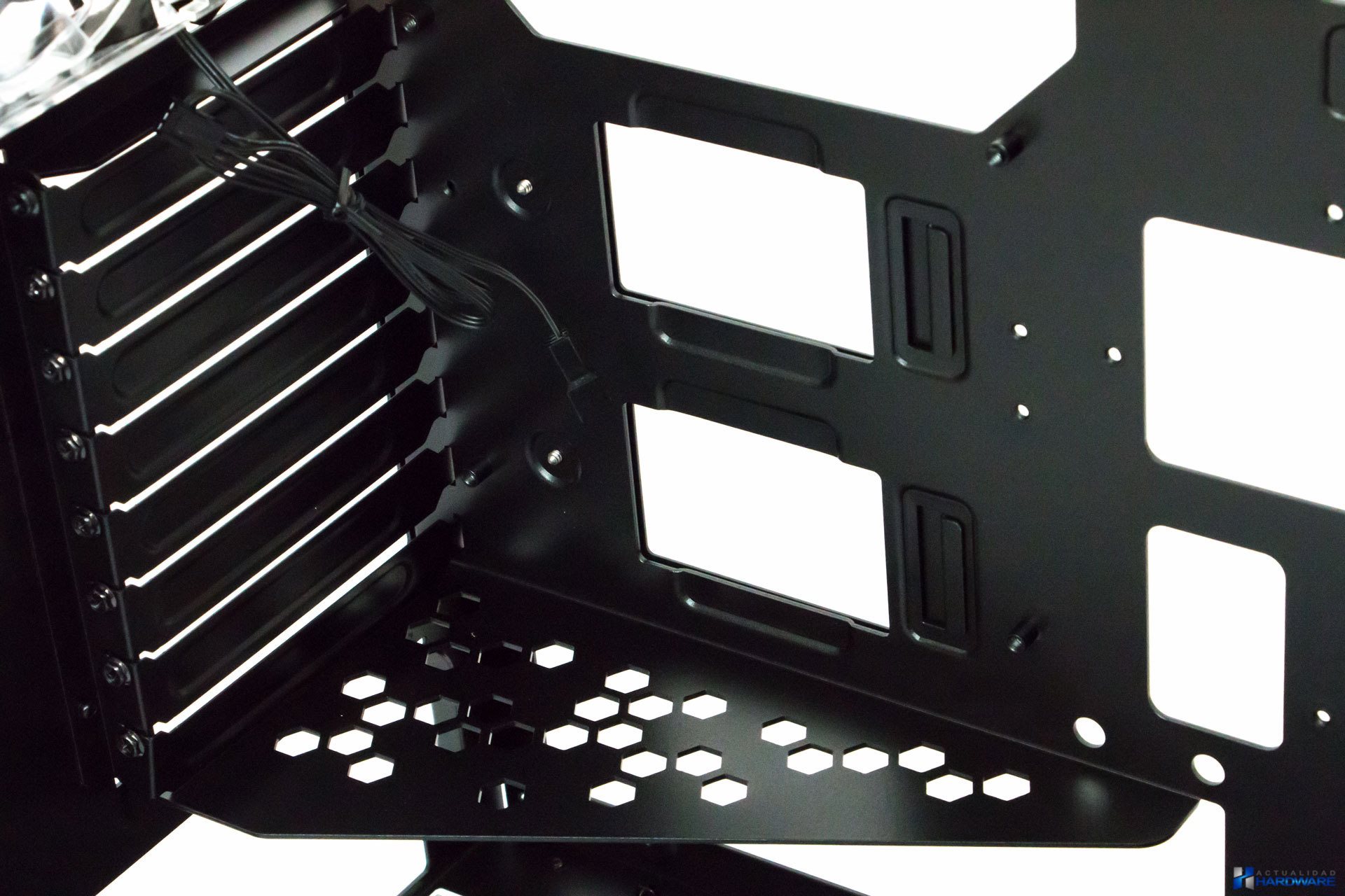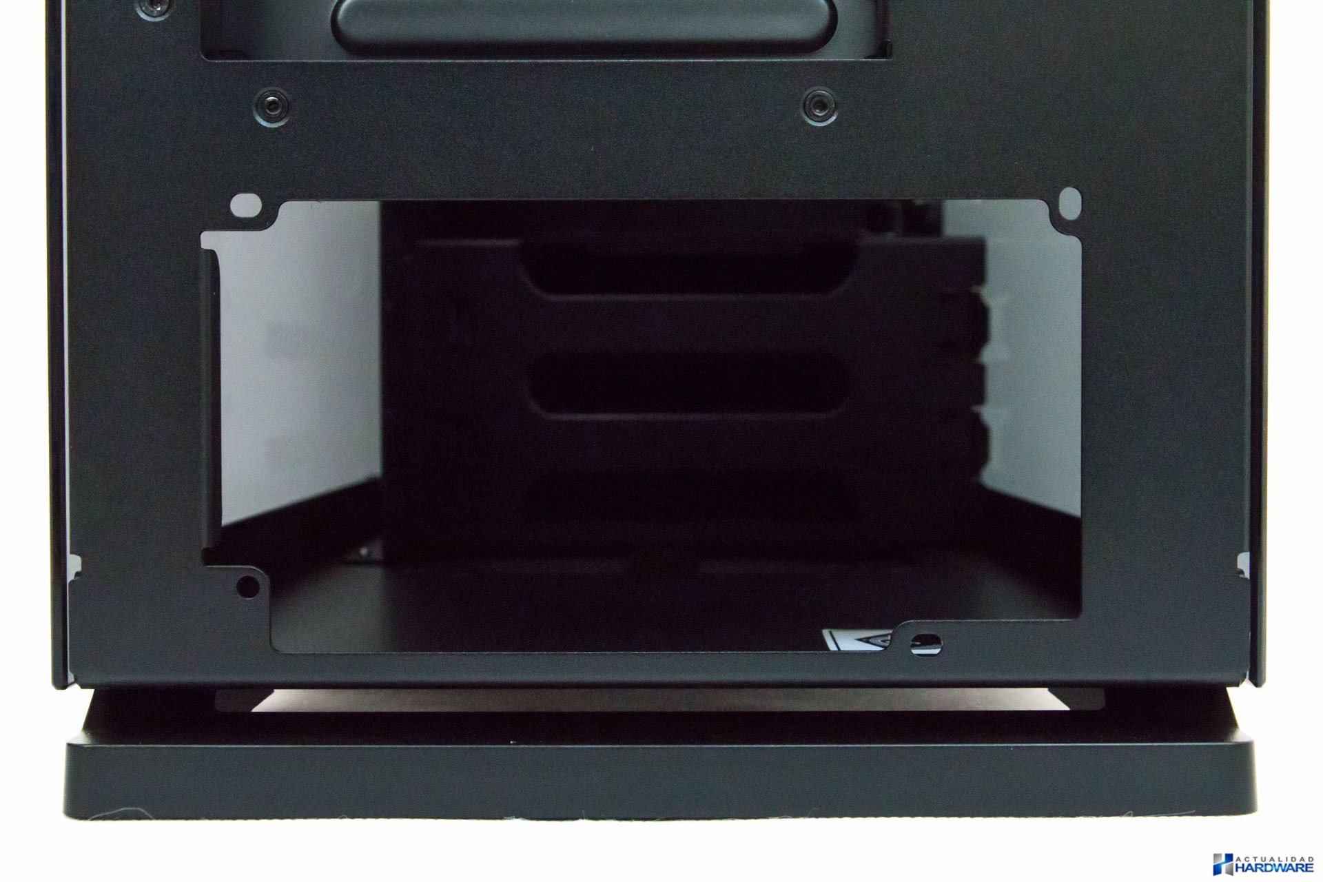 Incluye un rack para unidades de almacenamiento, siendo el mismo removible para la instalación de tarjetas gráficas de gran tamaño. El rack incluye dos bahías de plástico en las que podremos realizar la instalación de unidades de disco duro tanto de 3.5″ como de 2.5″, todo ello de una manera muy fácil. Encima del rack tenemos la posibilidad de instalar una unidad de 2.5″. Detrás de la bandeja de la placa base podemos instalar además tres unidades SSD de 2.5″, por lo que en aparato de almacenamiento estamos bien servidos. Como ya hemos tenido la oportunidad de comentaros, la IN WIN 805, cuenta con numerosos huecos pasa-cables destinados a mejorar tanto la estética así como la organización del cableado interno de la torre para de este modo mejorar la refrigeración del conjunto. Cuenta además con un gran hueco detrás de la placa base en la que podremos realizar una instalación limpia del cableado interno de la torre.