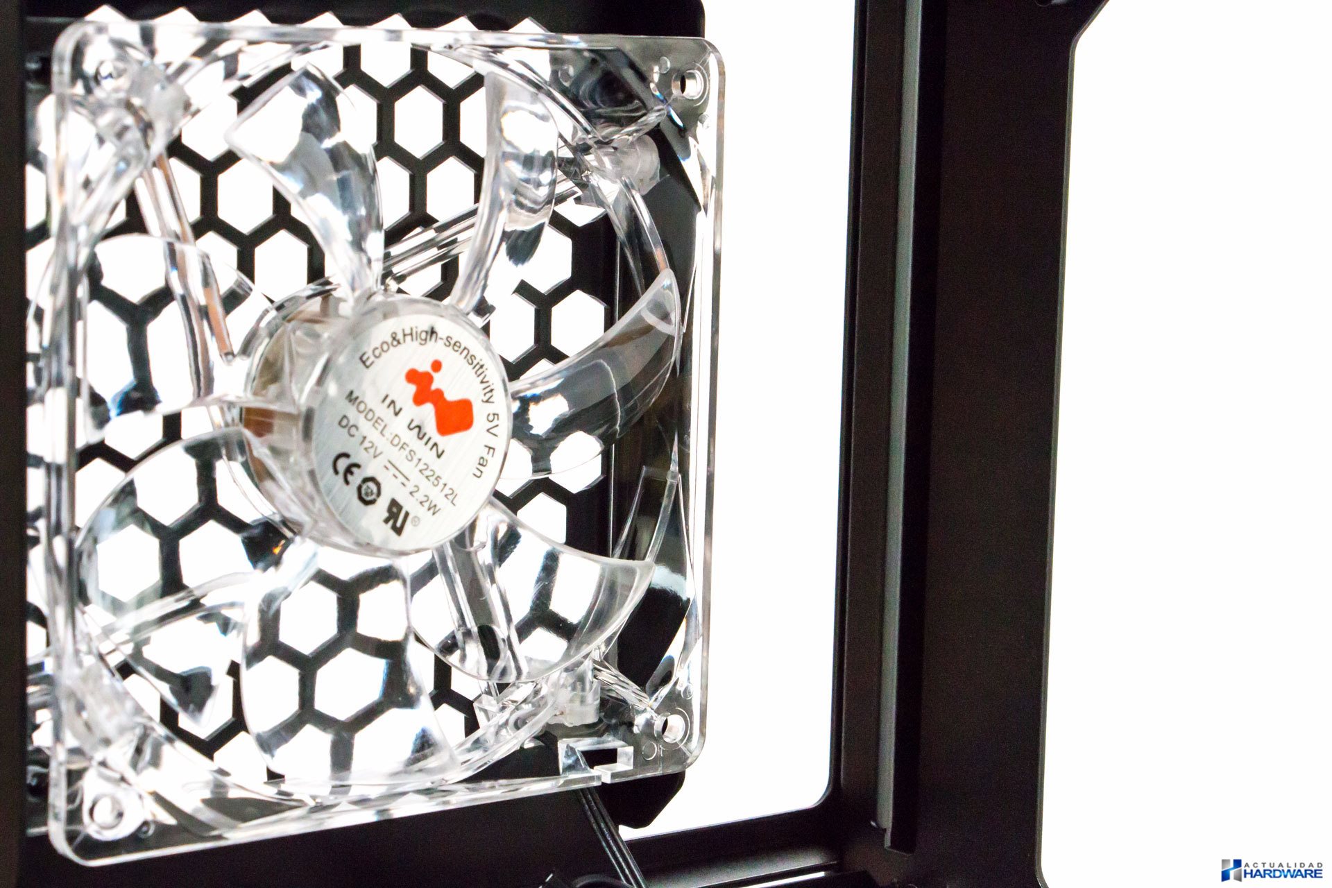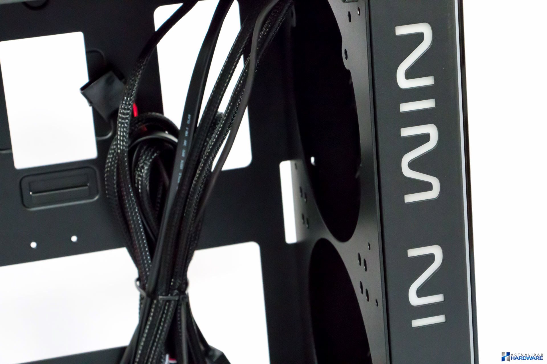 Detrás de su frontal es posible la instalación de dos ventiladores de 120/140mm o un radiador de 120/140/240/280mm de refrigeración líquida, permitiendo de este modo mejorar la refrigeración de nuestra CPU para así poder llevarla al límite. El cableado interno que la caja incorpora es el habitual en las torres actuales. Como podemos ver, la 805 lleva en su lateral el logo de IN WIN iluminable en color rojo, que le aporta un gran aspecto al conjunto. Podemos comentar que le sienta verdaderamente bien junto con el lateral de vidrio templado que le aporta un gran aspecto general a la 805.