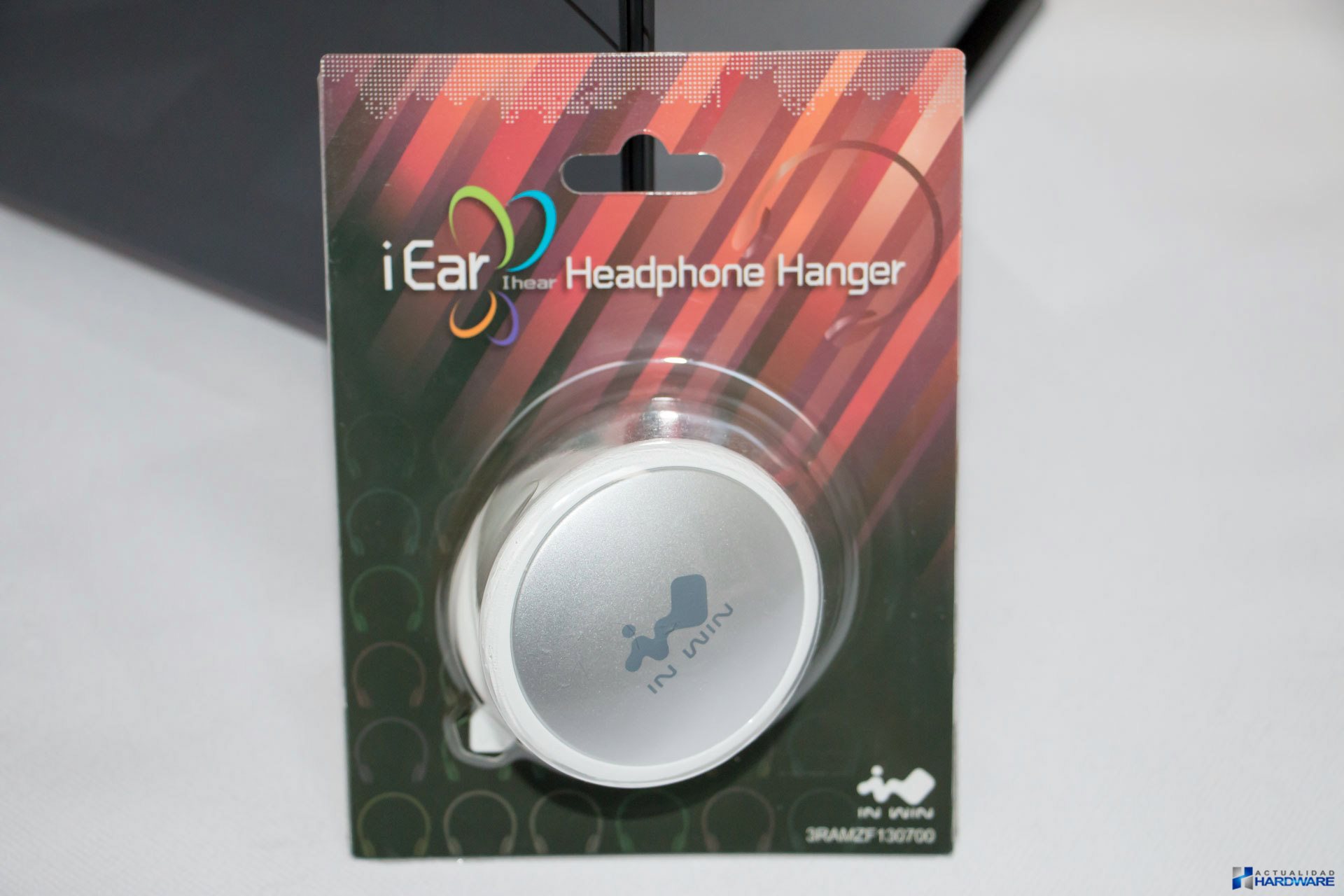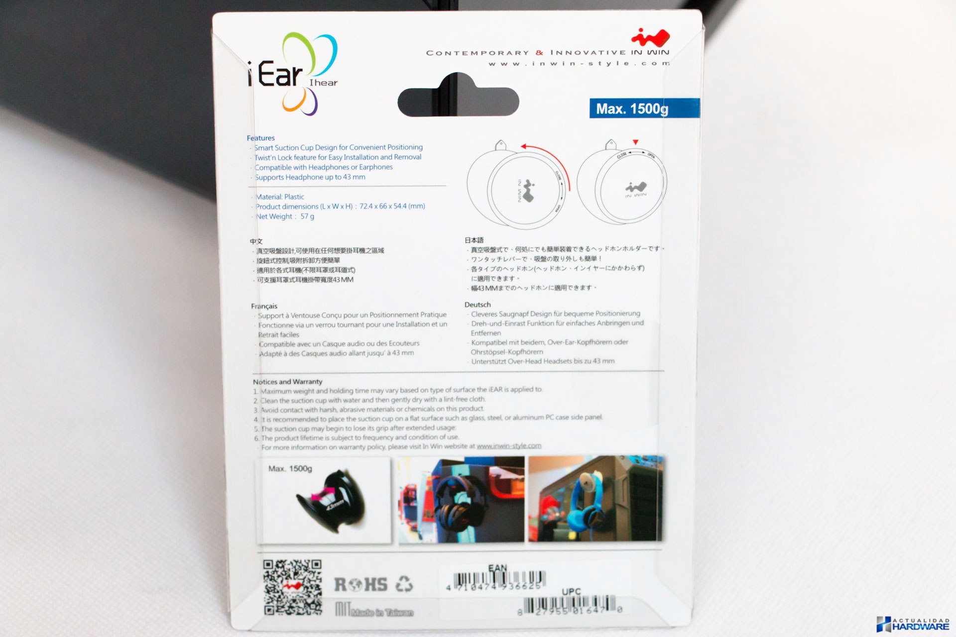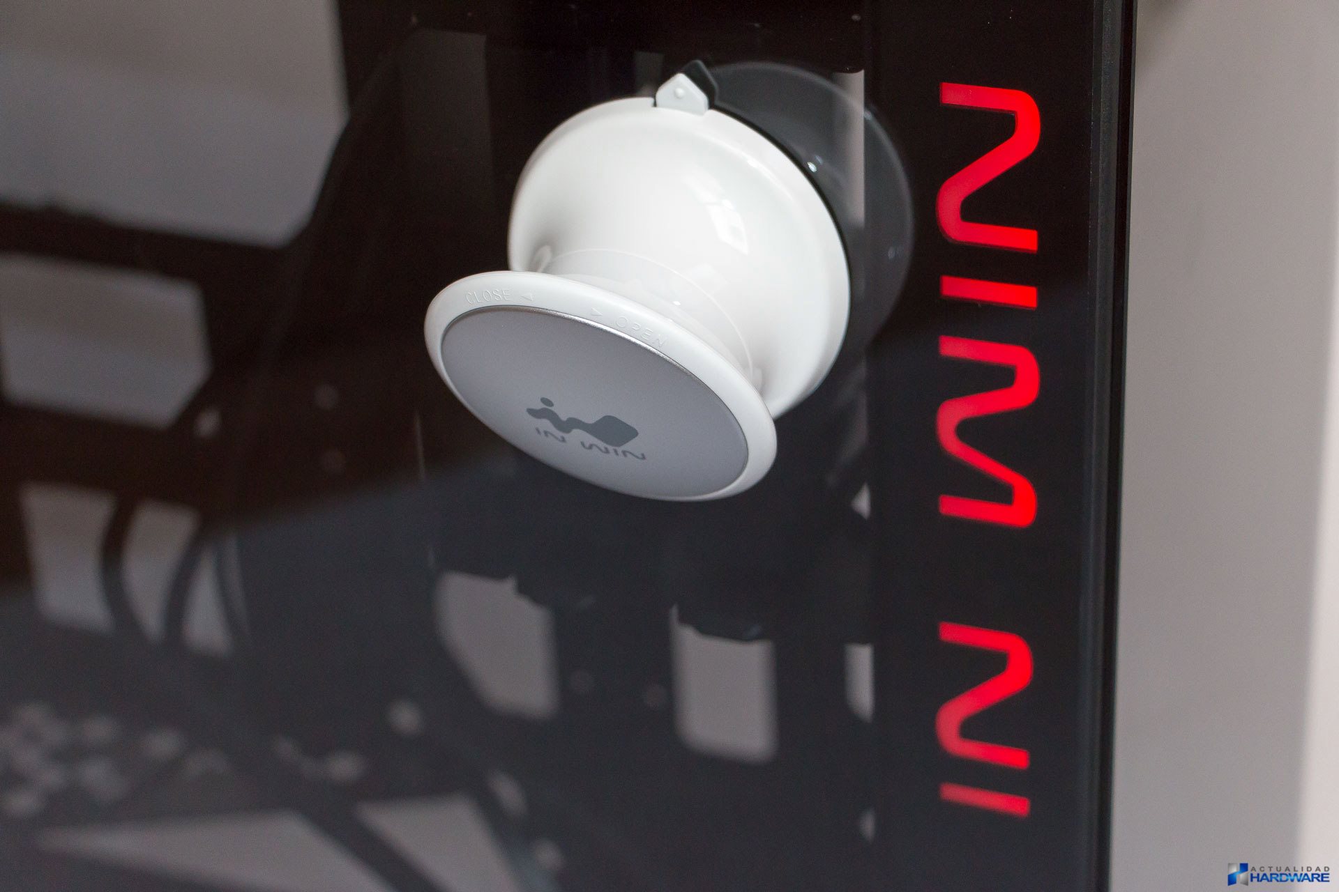 En este grupo de imágenes podemos ver el gran aspecto de la IN WIN 805 con la iluminación roja, podemos decir que la caja en directo gana muchísimo más que en las fotos, ya que al ser el material utilizado vidrio templado es difícil de fotografiar. Una novedad que nos encanta de la IN WIN a parte de los paneles de vidrio templado es la inclusión de un puerto USB 3.1 Type-C en su frontal. Éste nuevo estándar permite velocidades de hasta 10Gb/s de tranferencia, o lo que es lo mismo, dos veces más rápido que el USB 3.0 convencional. Además el conector USB3.1 Type-C es más pequeño y permite conectarlo de forma reversible, es decir, en doble sentido, de este modo ya no tendremos que estar pendientes si estamos introduciendo correctamente el conector. Finalizando con el unboxing de la IN WIN 805 podemos ver el curioso accesorio que la misma incluye, que nos es ni más ni menos que un soporte-ventosa para la colocación de nuestros auriculares, soportando un pesomáximode 1500 gramos. Lo hemos probado y tanto su colocación como retirada es realmente sencilla, sin dejar ningún tipo de residuo.