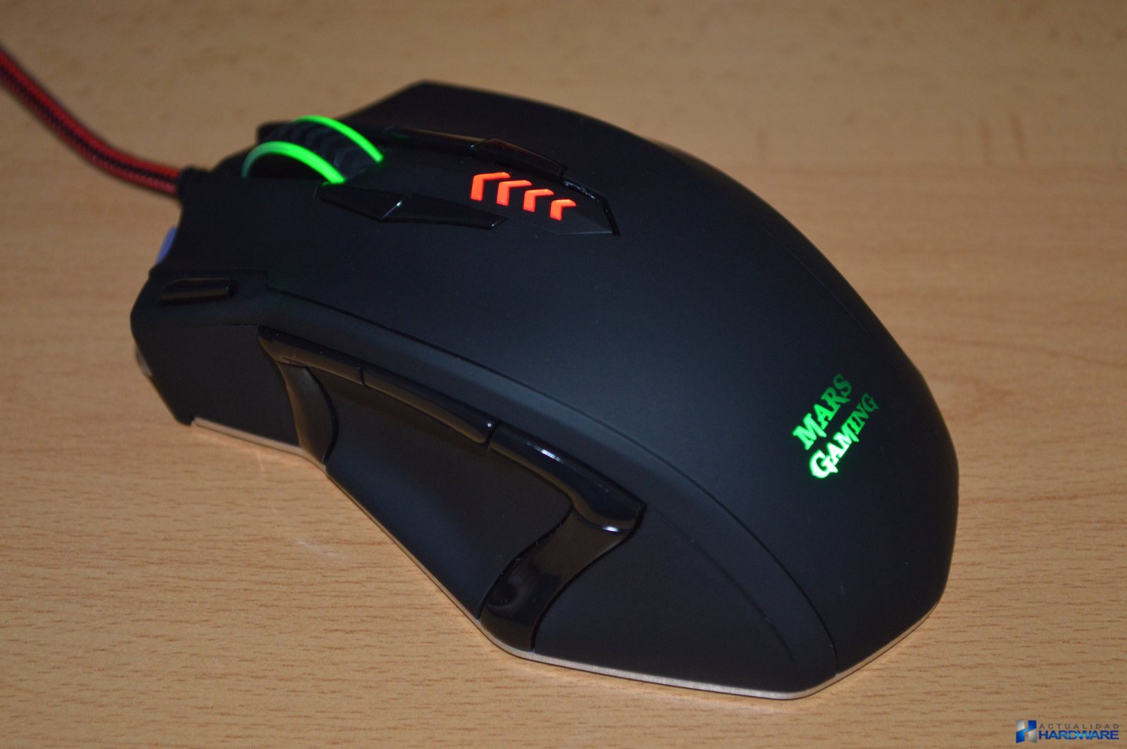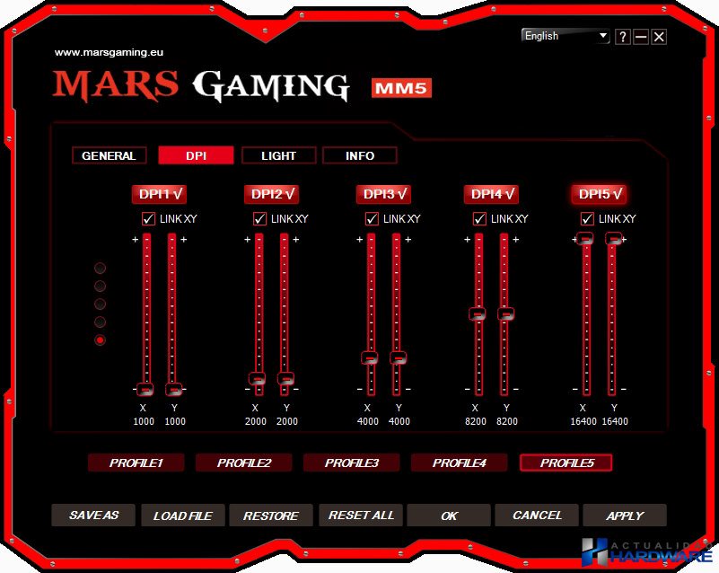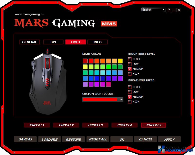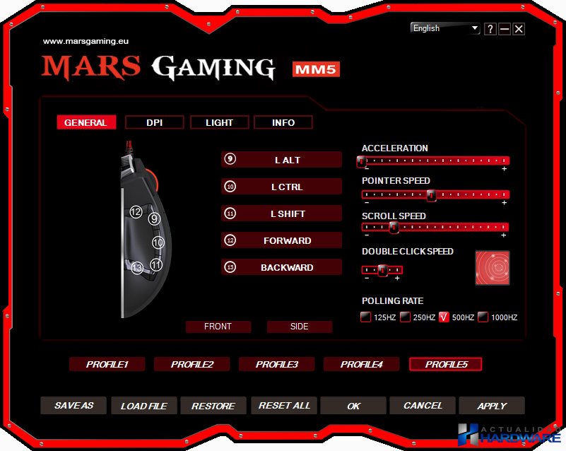 | El MARS GAMING MM5 incluye un software para una configuración avanzada y totalmente personalizada que permite almacenar en sus 128 Kb de memoria interna hasta 5 perfiles de usuario y la configuración de sus 13 botones mecánicos Omron. El MM5 cuenta con unas dimensiones de 123 x 81 x 41 mm y un peso de 190 gramos. En su parte superior nos encontramos con el logo de Mars Gaming iluminado y configurable en 6 colores diferentes, los botones click derecho/izquierdo, cinco botones personalizables de los que dos ellos concretamente los situados a la izquierda está configurados para cambiar los DPI, indicador de DPI y rueda de desplazamiento. En uno de sus laterales se encuentran situados cinco botones personalizables que gracias a sus formas y relieves se hacen muy cómodos de pulsar. Todos los botones que incorpora el MM5 tienen un gran tacto al pulsados que junto al diseño ergonómico del ratón hacen que este sea muy cómodo desde el primer momento. Los dos salientes de su base de acero le aporta un toque Gaming total además de que su deslizamiento debido a su base de acero es muy bueno. | ||