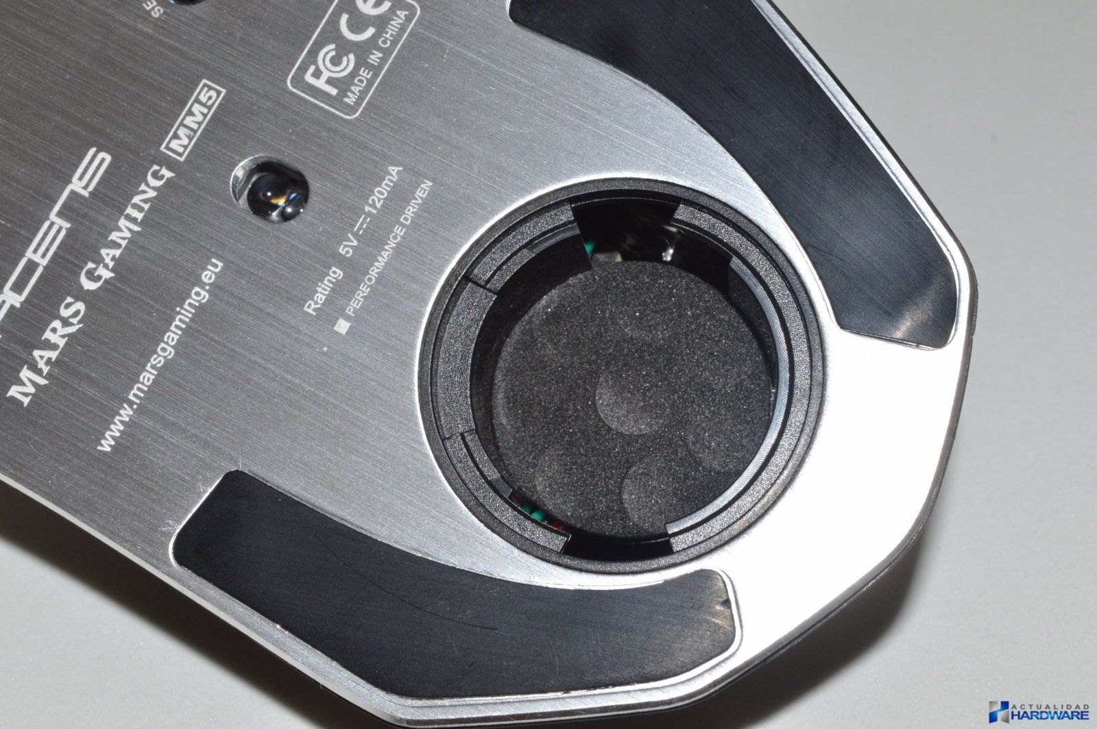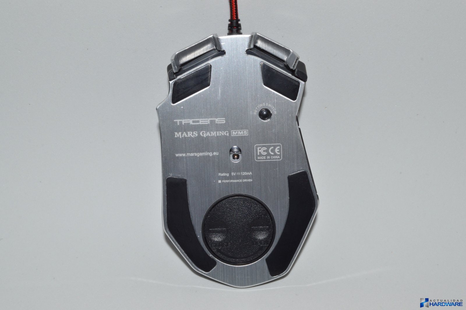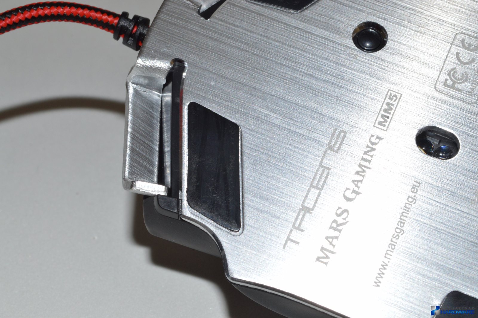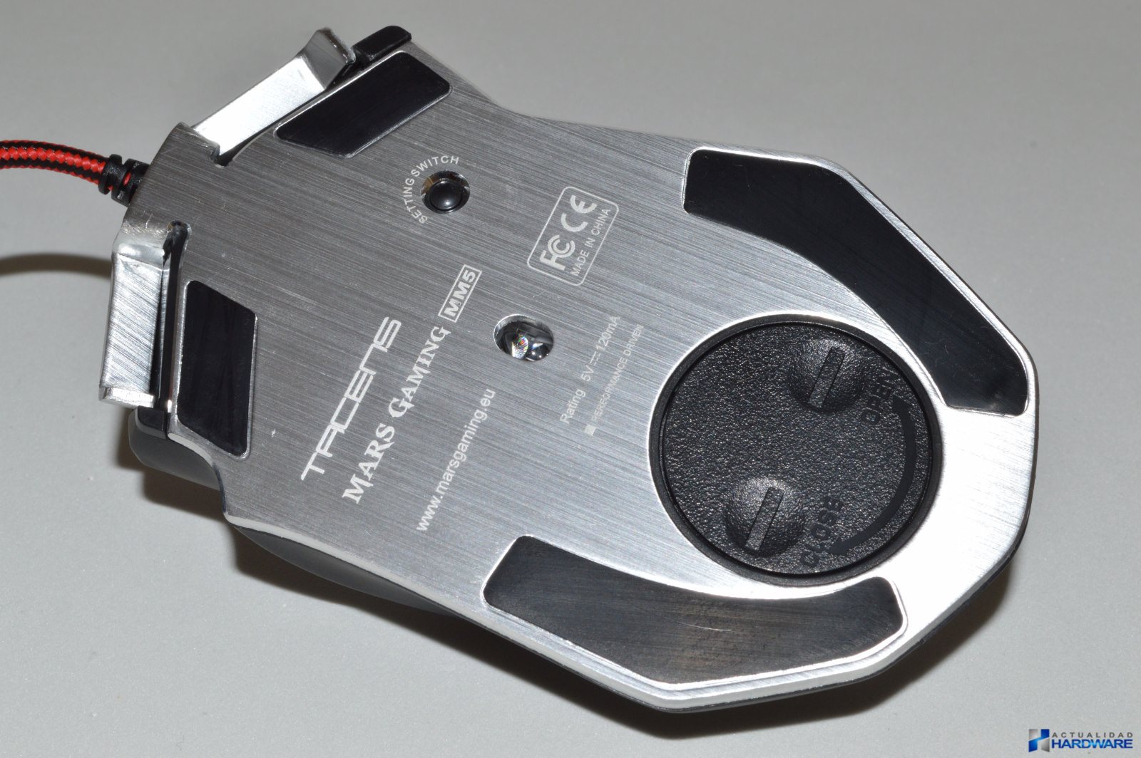 | El MM5 incluye un cable trenzadoo de nylon en colores rojo/negro con una longitud de 1.7m y con un conector USB con terminación dorada. Su base es de acero e incluye cuatro almohadillas/surfers mediante las cuales se hará muy fácil el desplazamiento del ratón sobre cualquier superficie. Cuenta con un sensor láser profesional Avago que ofrece un ratio de refresco seleccionable de hasta 1000Hz y 30G de aceleración consiguiendo la máxima precisión de movimientos. Justo al lado del sensor dispone de un botón mediante el cuál podemos cambiar la iluminación del ratón sin tener que recurrir al software. Incluye un compartimento para contrapesos con un total de ocho pesos metálicos que mediante los cuales podremos configurar el ratón a nuestro gusto. Si no llegamos a utilizar todos los pesos podremos guardarlos en la caja que se incluye como accesorio. El MM5 dispone de un aspecto totalmente Gaming con su base de acero. | ||