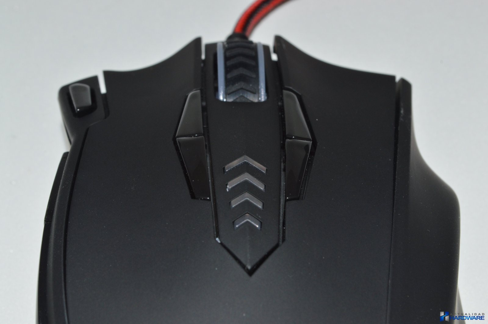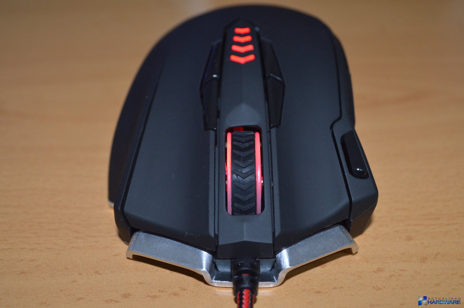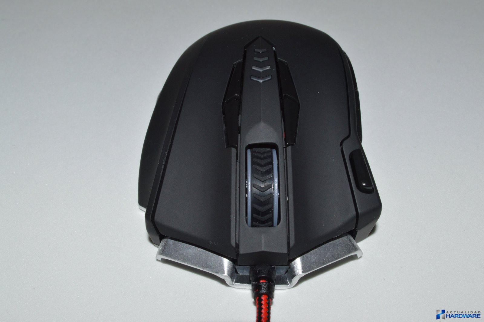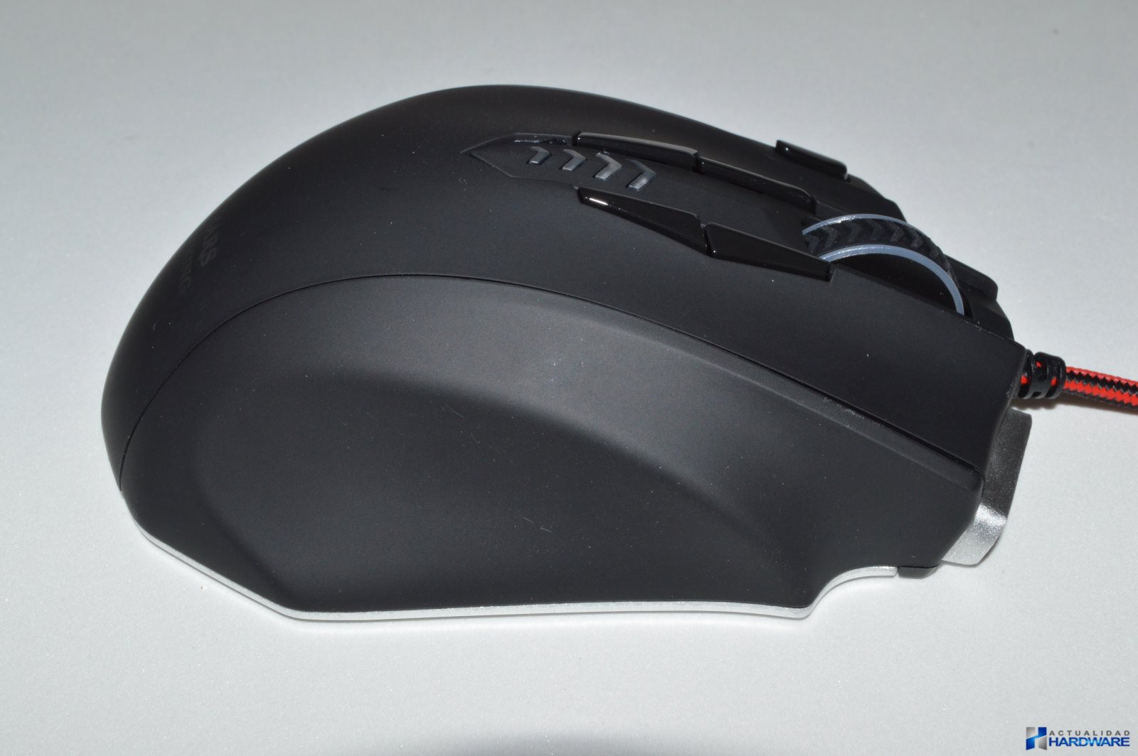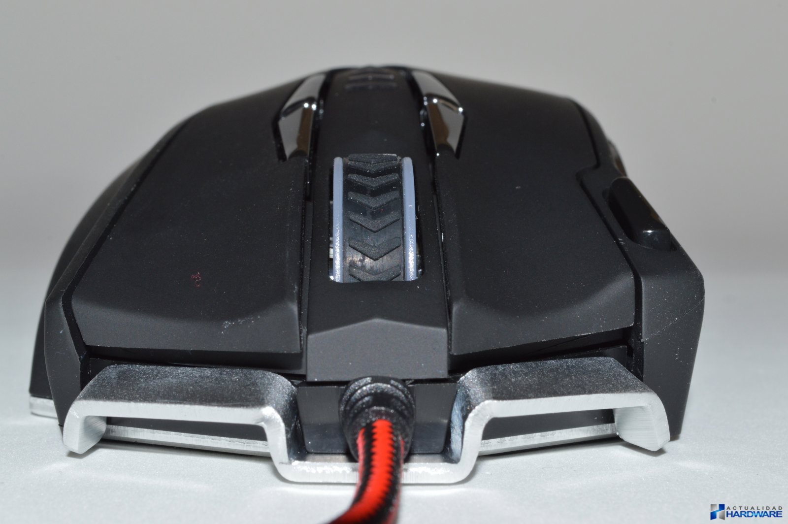| El MM5 incluye un cable trenzadoo de nylon en colores rojo/negro con una longitud de 1.7m y con un conector USB con terminación dorada. Su base es de acero e incluye cuatro almohadillas/surfers mediante las cuales se hará muy fácil el desplazamiento del ratón sobre cualquier superficie. Cuenta con un sensor láser profesional Avago que ofrece un ratio de refresco seleccionable de hasta 1000Hz y 30G de aceleración consiguiendo la máxima precisión de movimientos. Justo al lado del sensor dispone de un botón mediante el cuál podemos cambiar la iluminación del ratón sin tener que recurrir al software. Incluye un compartimento para contrapesos con un total de ocho pesos metálicos que mediante los cuales podremos configurar el ratón a nuestro gusto. Si no llegamos a utilizar todos los pesos podremos guardarlos en la caja que se incluye como accesorio. El MM5 dispone de un aspecto totalmente Gaming con su base de acero. | ||