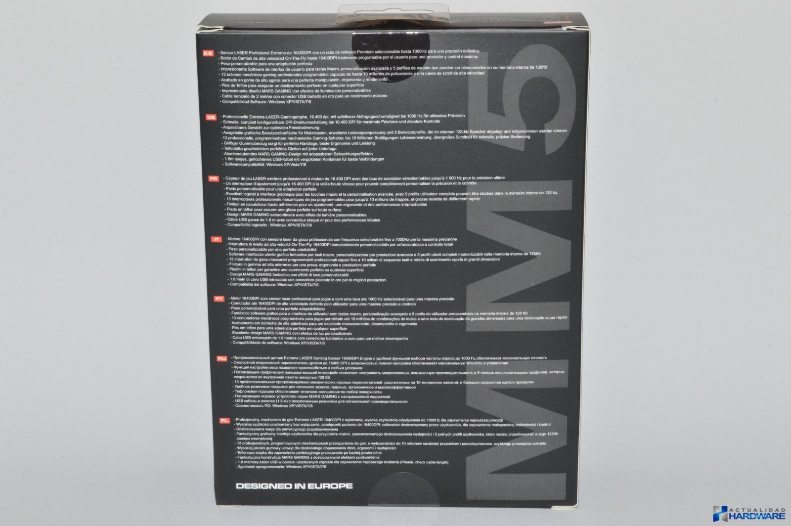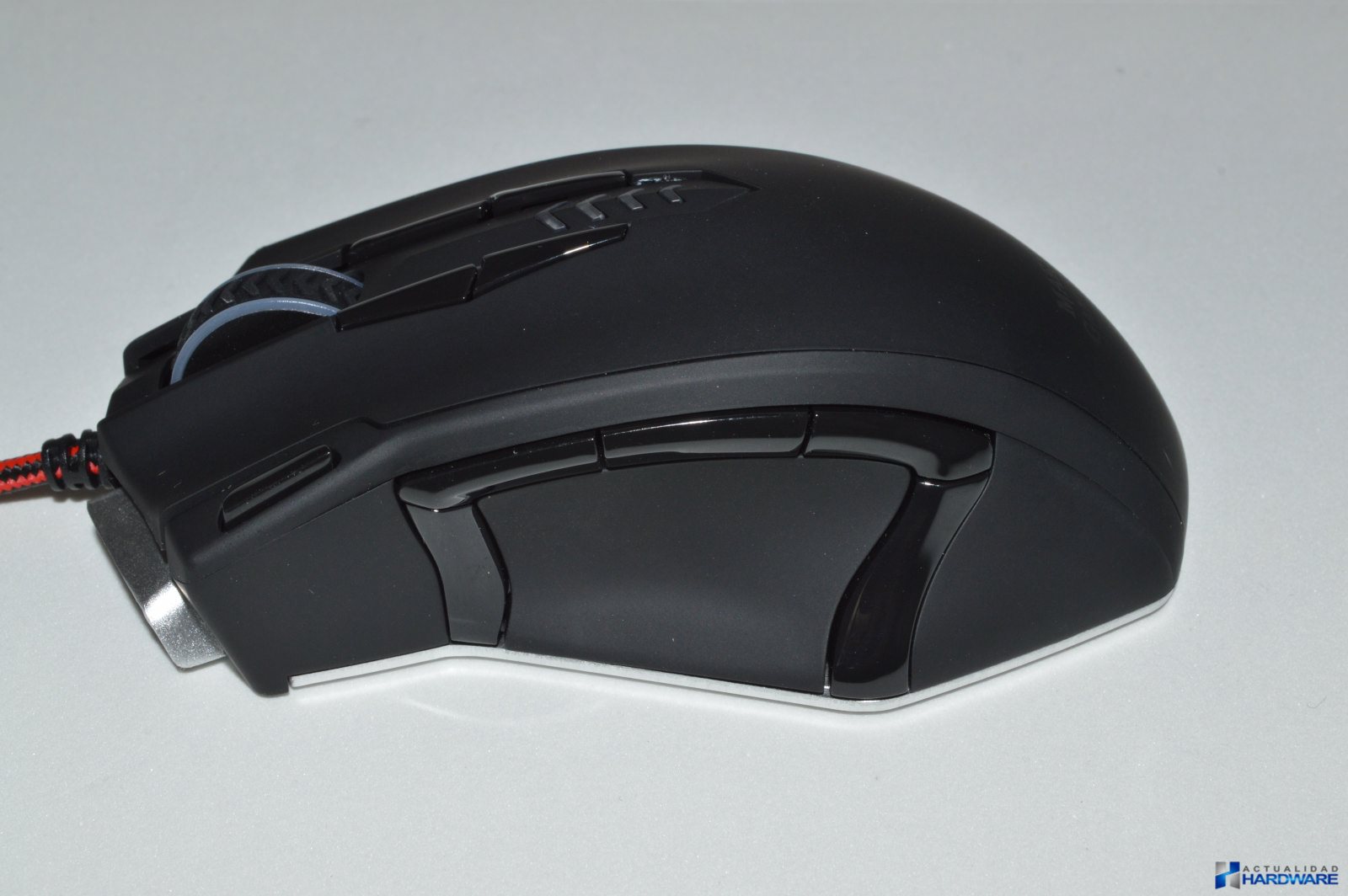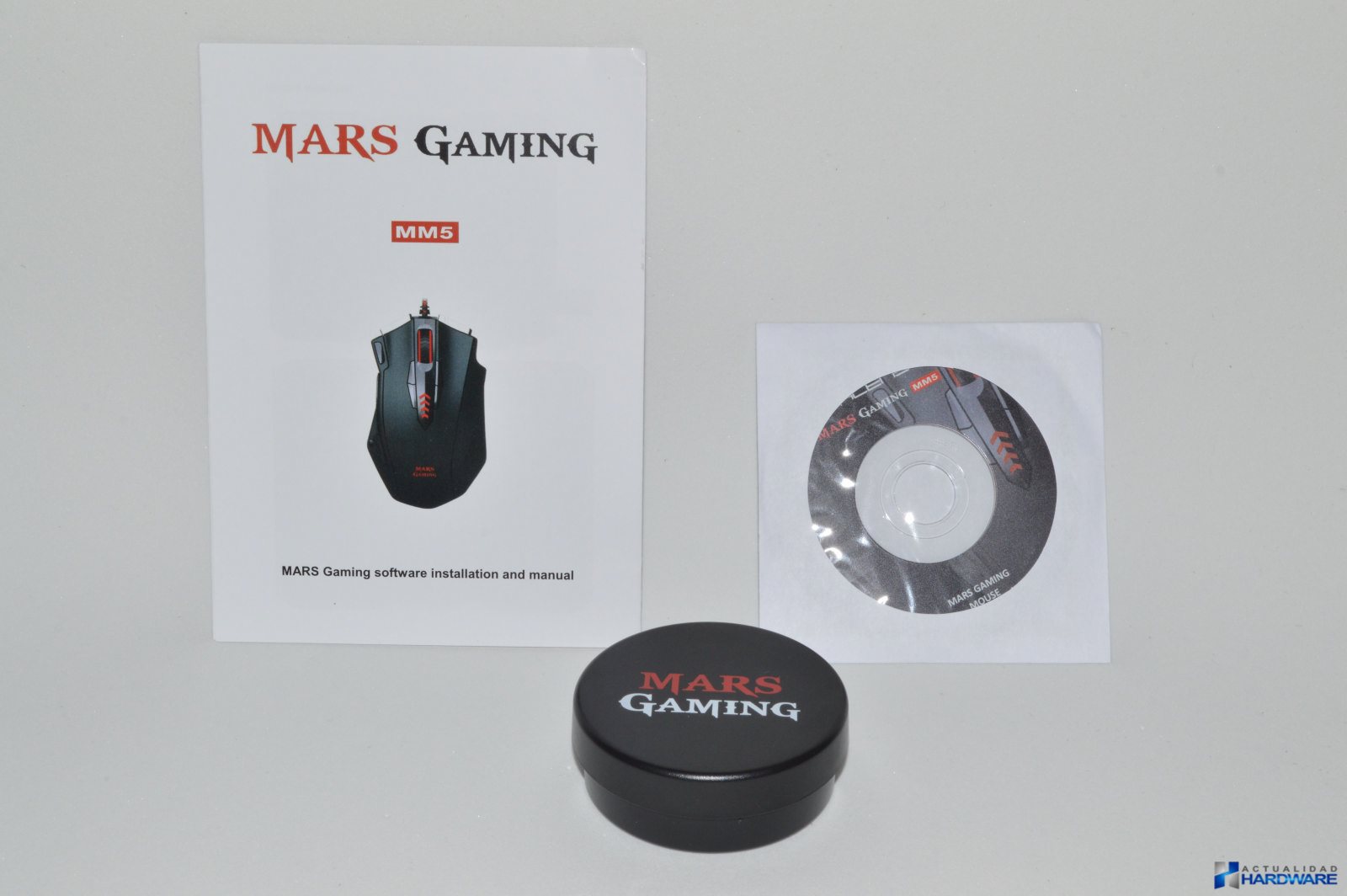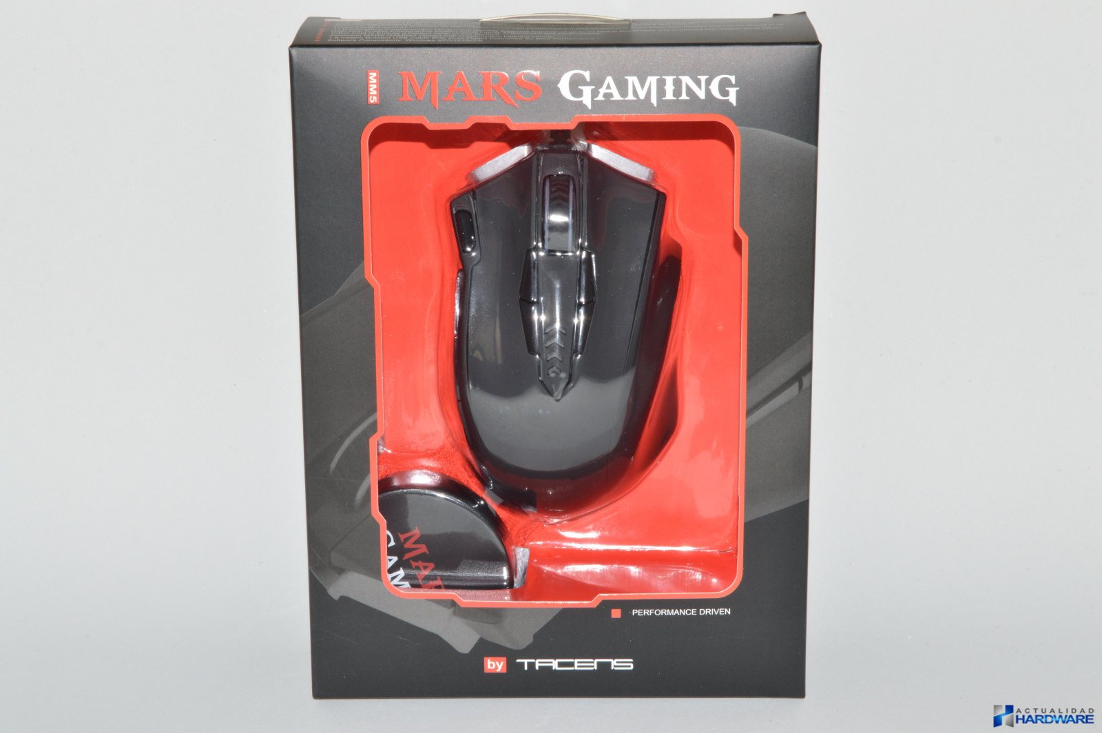 | El MARS GAMING MM5 se presenta de igual manera que el MM4 que hemos analizado recientemente, es decir, en una caja de cartón con fondo negro en la que en su parte frontal podemos ver directamente a través de una ventana su contenido el cuál se encuentra dentro de un blíster de plástico transparente. En su parte trasera podemos ver sus características en varios idiomas incluido el español. Como accesorios se incluye manual de usuario en inglés, Mini-CD con drivers y caja redonda de plástico negro con el logo de Mars Gaming para guardar los contrapesos que no utilicemos. En cuanto a sus características y especificaciones se trata de un ratón Gaming con sensor láser Avago de 16400 DPI, cuenta con 13 botones mecánicos Onrom e iluminación en 6 colores entre otras, el resto de características las iremos comentado a medida que avanzamos en el review. Una vez sacamos el ratón de su blister podemos decir que el mismo tiene un buen diseño y una buena construcción en plástico negro con tacto gomoso del mismo modo que el MM4, aunque debemos comentar que tanto su ergonomía como su diseño son mejores a nuestro gusto. | ||