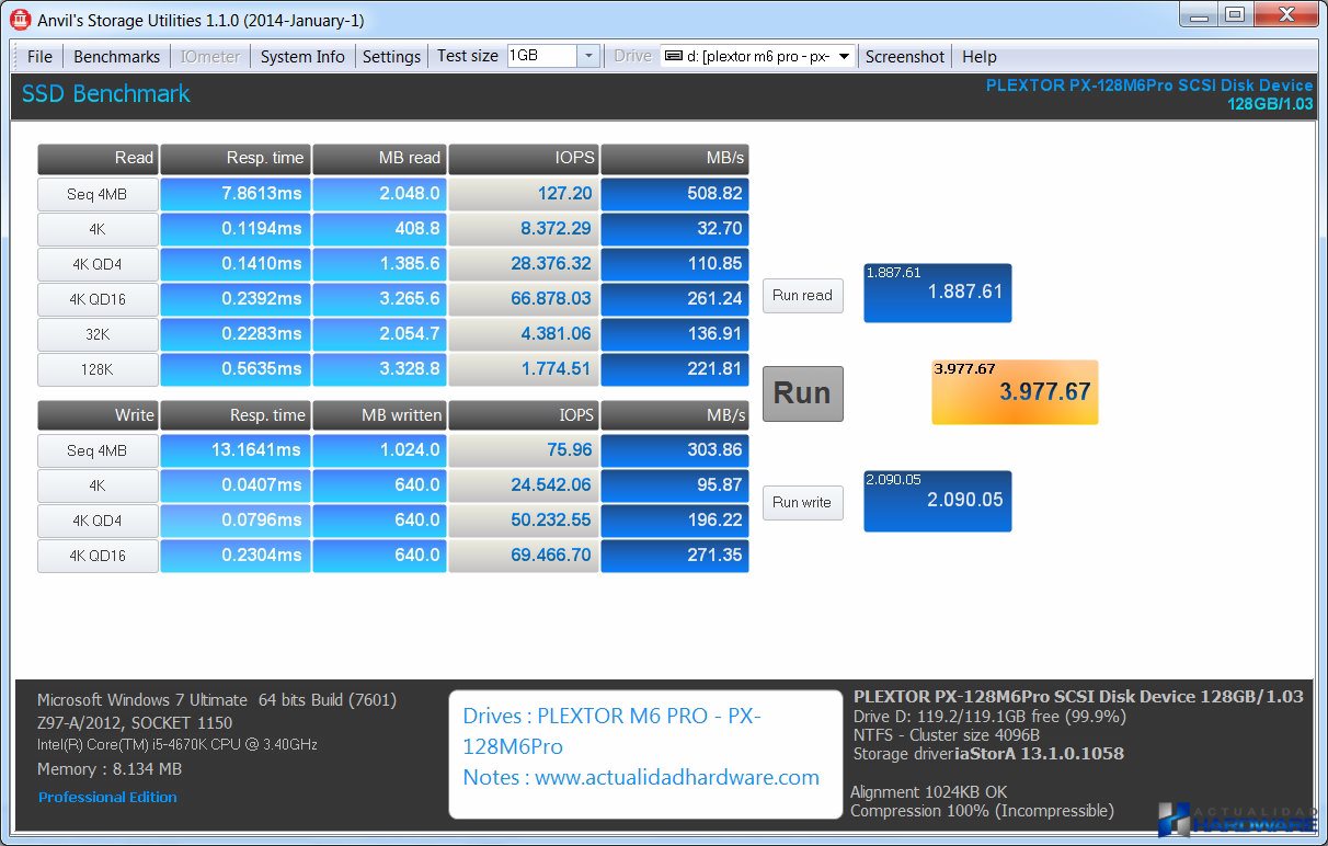 Para nuestro análisis vamos a testear el PLEXTOR M6 PRO junto con el software CrystalDiskInfo, CrystalDiskMark, ATTO Disk Benchmark, Anvil’s Storage Utilities y AS SSD Benchmark. Todo ello conectado mediante la conexión Sata III a 6GB/s de nuestra placa base. En la bios tenemos activado AHCI y configurado nuestro sistema operativo para sacar el máximo rendimiento del PLEXTOR M6 PRO. A continuación detallaremos la configuración de nuestro equipo de pruebas con el que analizaremos este producto.