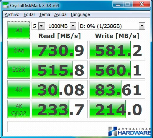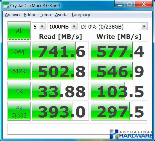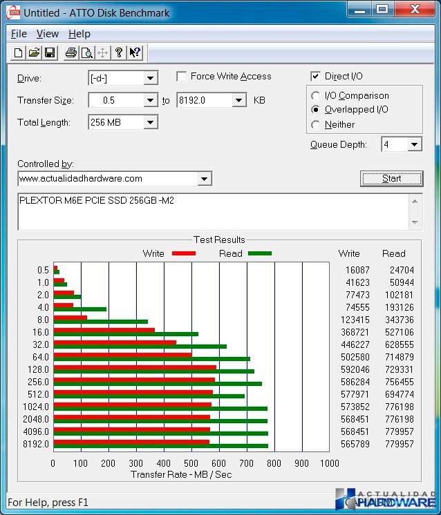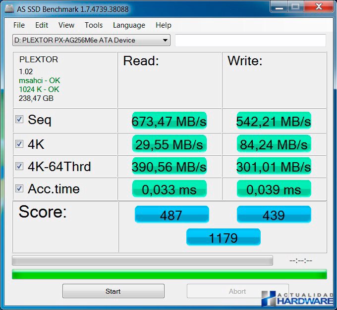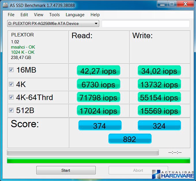 Como podemos ver en las imágenes el rendimiento del PLEXTOR M6E es excelente tanto por PCI-e como por M.2. El resultado es similiar mediante ambos interfaces aunque es de agradecer que PLEXTOR incluya una tarjeta PCI-e x2 por si nuestra placa base no incluyera el nuevo interfaz M.2 incluido en las nuevas placas de Intel con chipset Z97. El rendimiento ofrecido es muy bueno y el no tener que usar cables como en los discos sata es de agradecer. Los 741MB/s y 581MB/s obtenidos en velocidad de lectura y escritura respectivamente harán que el rendimiento global de nuestro sistema aumente de forma notable y con sus 256GB del modelo suministrado para este review sean el complemento ideal para configurarse un equipo de grandes prestaciones.