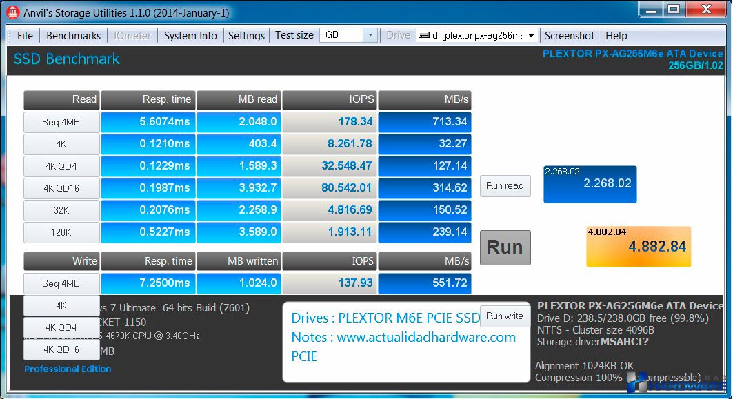 Para nuestro análisis vamos a testear el PLEXTOR M6E tanto con el interfaz PCI-e como con el M.2. Para ello utilizaremos una placa ASUS Z97-A para la realización de pruebas y varios softwares para comprobar el rendimiento real del SSD objeto de este review. Su instalacación en la ranura PCI-e es tan fácil como insertala en la misma y apretar el tornillo que se incluye para fijarla, es decir, tal y habremos instalado multitud de tarjetas pci. También es sumamente fácil su instalación en la ranura M.2 ya que tan solo debemos fijarlo a la misma y apretar el tornillo. A continuación detallamos los componentes del equipo de testeo que hemos preparado para este review.