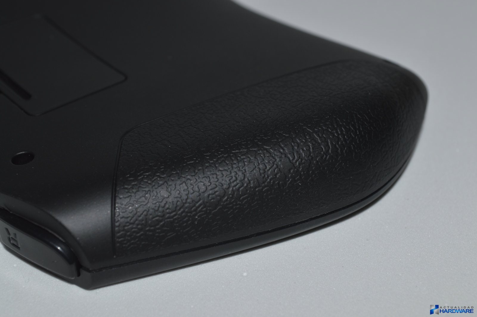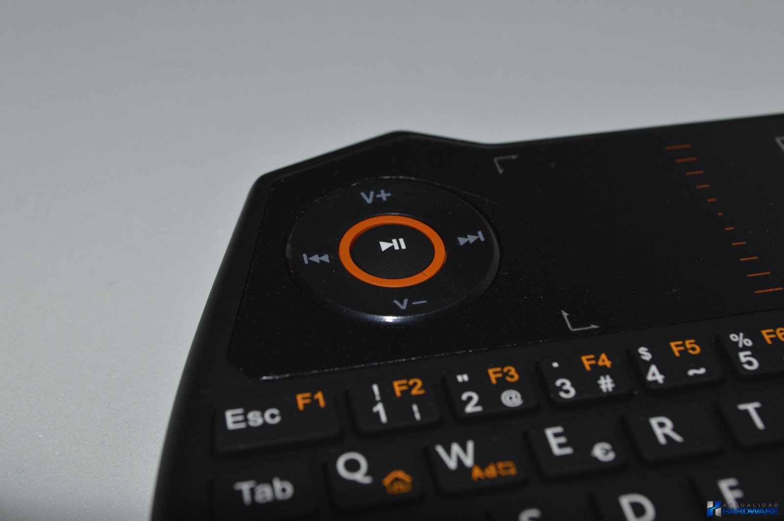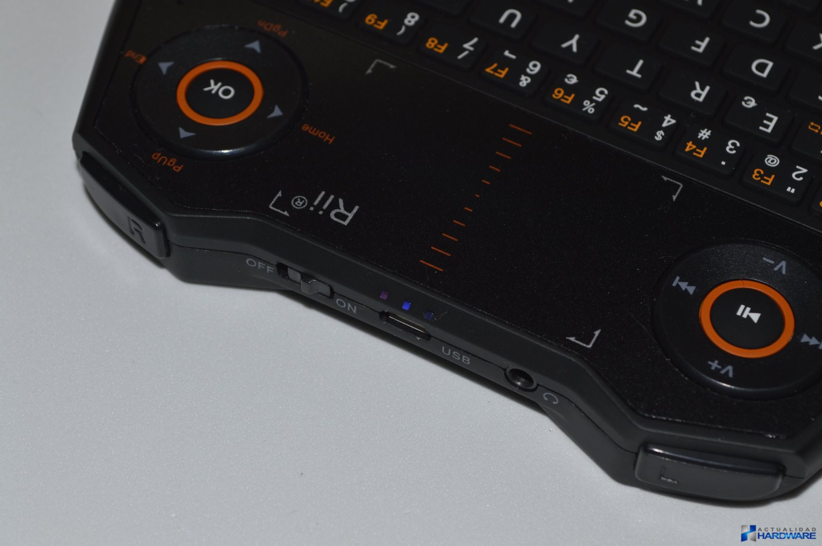 La terminación del RII MINI ONE con sus bordes redondeados es excelente y hace que su manejo sea realmente cómo y agradable al tacto. Incluye dos gatillos para su manejo con ambos dedos índices. Para activar la retroiluminación del teclado hay que pulsar las teclas «FN» y la tecla»Ç» que tiene serigrafiada una «bombilla». Con dicha tecla «FN» podemos activar la doble función de algunas teclas, todas ellas serigrafiadas en color «naranja». Justo encima de la tecla «F12» incluye un orificio conteniendo en su interior el micrófono. En su borde superior incluye el botón de encendido, conector USB para su carga y conector jack para auriculares. También incluye leds de estado los cuales nos indican el nivel de carga mediante tres leds azules. Cuando se conecta con el receptor USB, el led se torna en naranja; cuando la conexión no se ha establecido la luz naranja parpadea; si no hay conexión durante 30 segundos, entrará en el modo sleep y todos los leds se apagarán. La función AirMouse es muy interesante gracias al giroscopio incorporado podemos manejar el RII MINI ONE simplemente con movimientos, algo muy útil para disfrutar plenamente de nuestros juegos favoritos. Para activarlo tan solo debemos pulsar la tecla «FN» y la tecla «AltGr» (segriafiada con una flecha naranja). Incorpora la función auto-sleep mediante la cuál el dispositivo entra en modo sleep si no se usa en tres minutos. Si necesitamos calibrar el giroscopio podremos hacerlo encediéndolo y pulsado las teclas «FN»+»Left». La sensibilidad del touchpad es ajustable mediante la tecla «FN» y la de «Barra espaciadora». Ha tardado en cargar unas dos horas, tras las cuales ya podremos disfrutar de él. En las pruebas realizadas en varios SmartTV el RII MINI ONE se ha comportado realmente bien pudiendo controlarlos de una manera muy cómoda, sobre todo con la función AirMouse y con el mini-teclado que incorpora. También hemos tenido la oportunidad de testearlo conectado a un MINIX NEO X8-H y podemos decir que es el complemento ideal para dispositivos Android. Haciendo uso del giroscopio podemos controlar los juegos mediante ésta función, convirtiéndose en una nueva experiencia al poder jugar a nuestros juegos a pantalla completa en nuestra TV, verdaderamente una pasada. Es muy útil para controlar nuestro HTPC ya que solo tendremos que conectar el receptor USB y podremos empezar a utilizarlo al momento sin necesidad de instalar drivers adicionales.