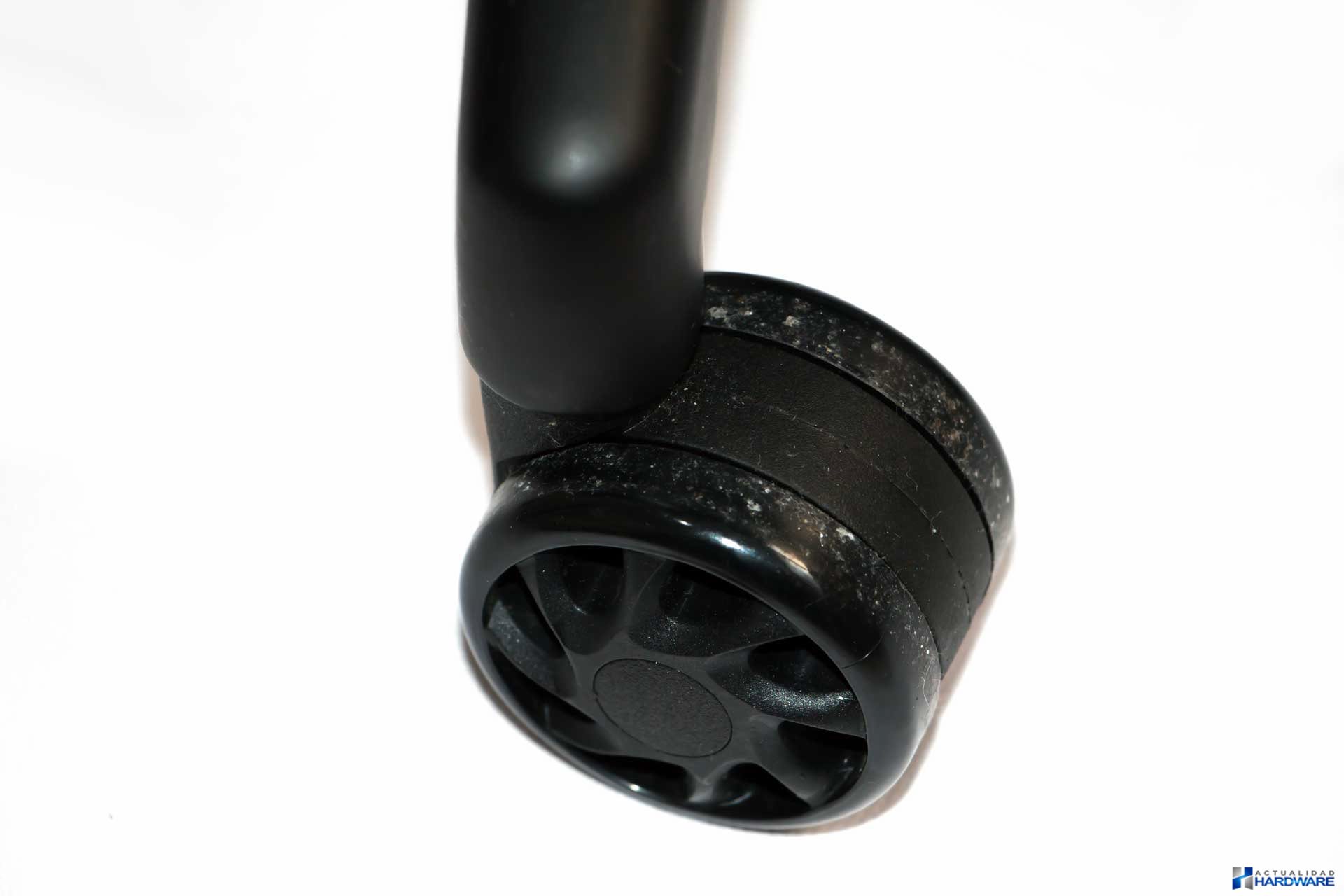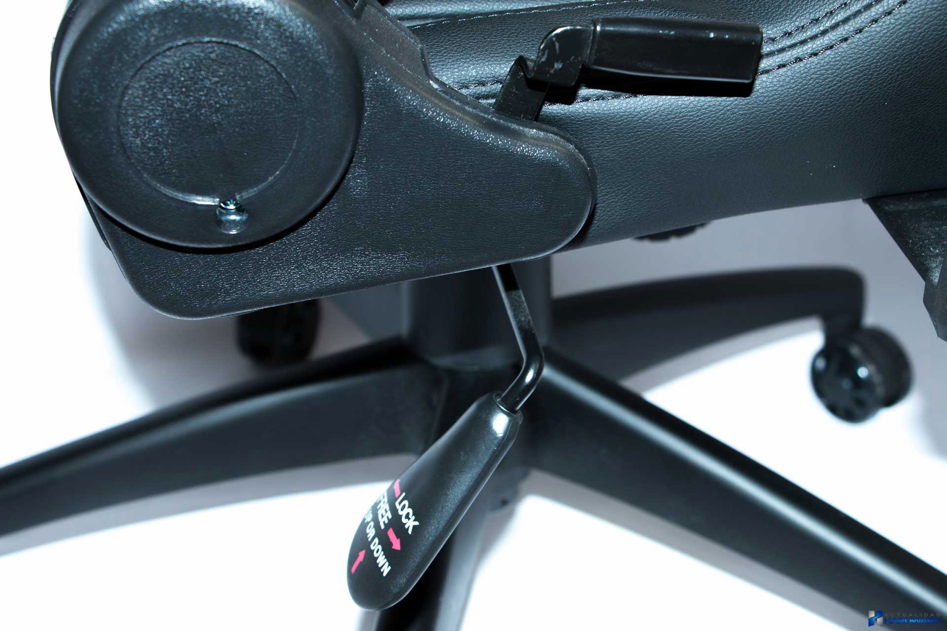 Para la regulación tanto la altura de la silla como el ángulo del respaldo dispone de sus respectivas palancas reguladoras, los cuales se sitúan a la derecha, como podemos ver en la primera de las imágenes. Ambas palancas se accionan de una manera muy suave tirando de ellas. Para la regulación del asiento se utiliza un potente cilindro/pistón de gas clase 4 que proporciona gran comodidad, soporte para grandes pesos y ofrece gran estabilidad a la silla, de este modo podemos regularla de una manera suave y precisa. Las cinco ruedas de plástico de las que dispone, proporcionan un giro en todas la direcciones, además de una rodadura suave y continua, que hacen que mover la silla sea muy cómodo incluso si estamos sentados en ella. En el asiento podemos ver que incluye una etiqueta de tela que contiene el logo de VERTAGEAR. El cojín lumbar podemos ajustarlo en altura pero a pesar de ellos no nos hemos sentido cómodos con el, será cuestión de acostumbrarse y de gustos.